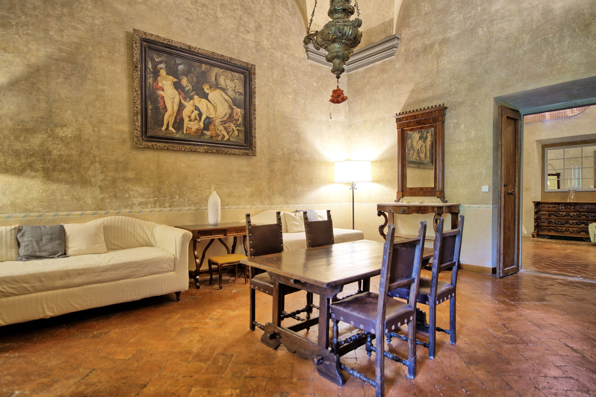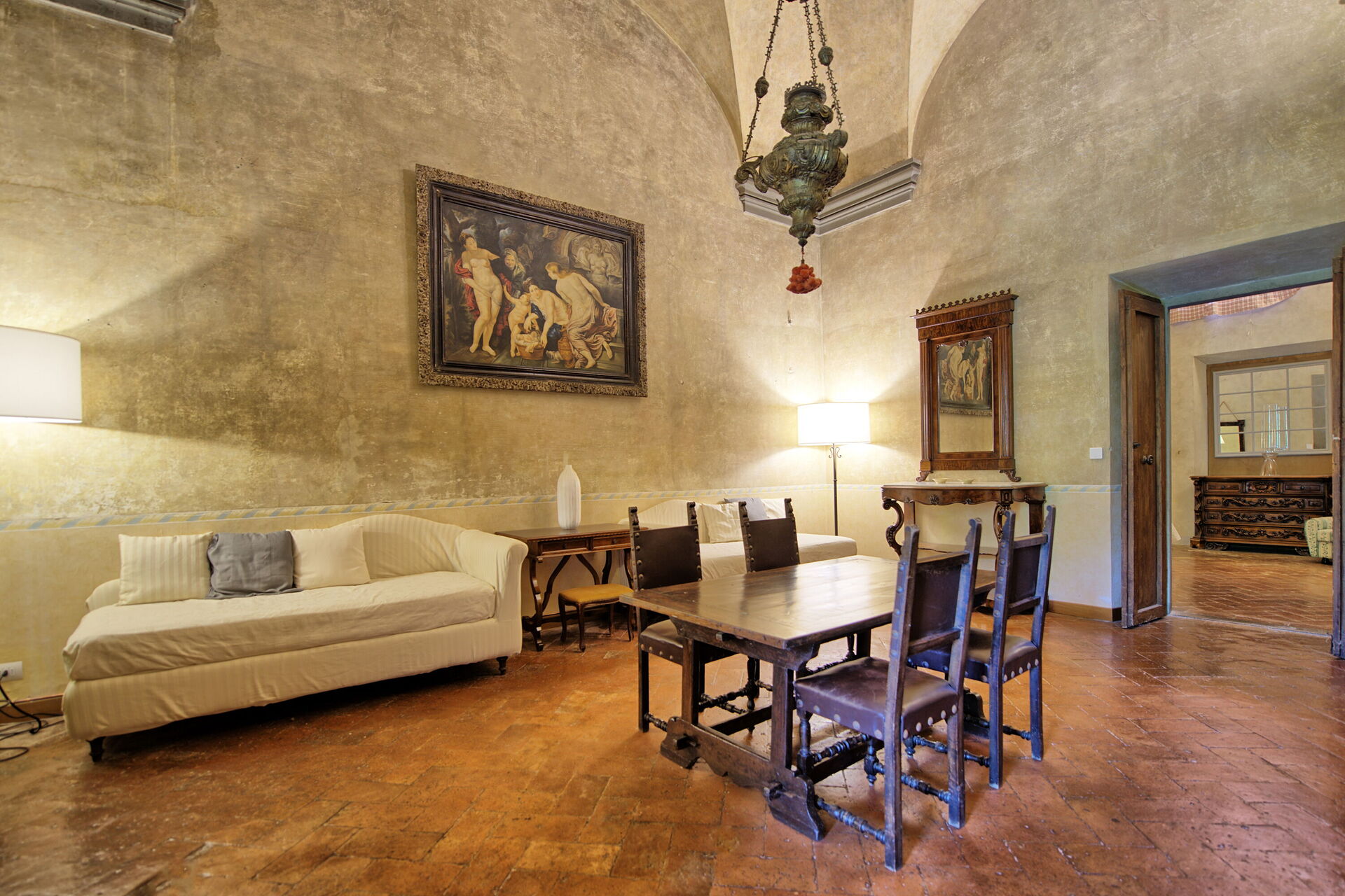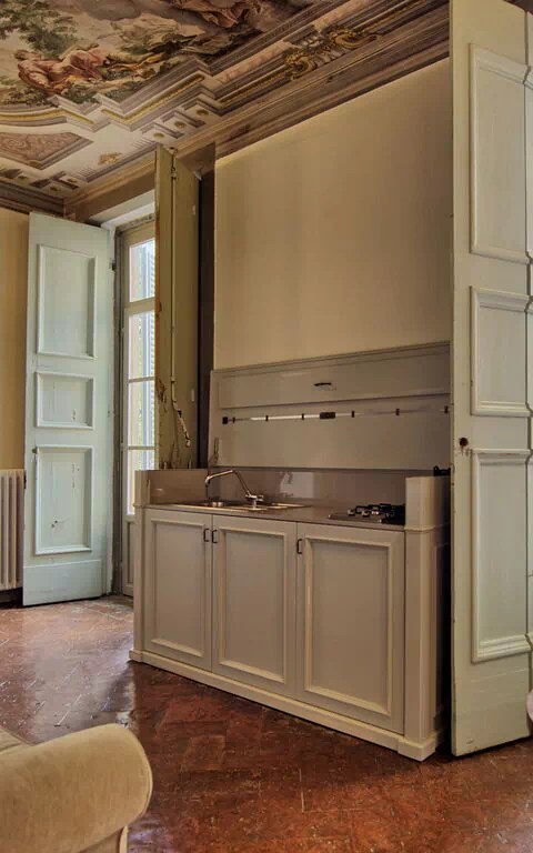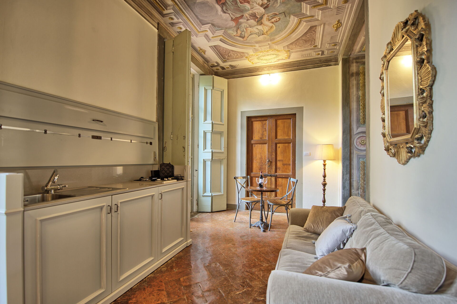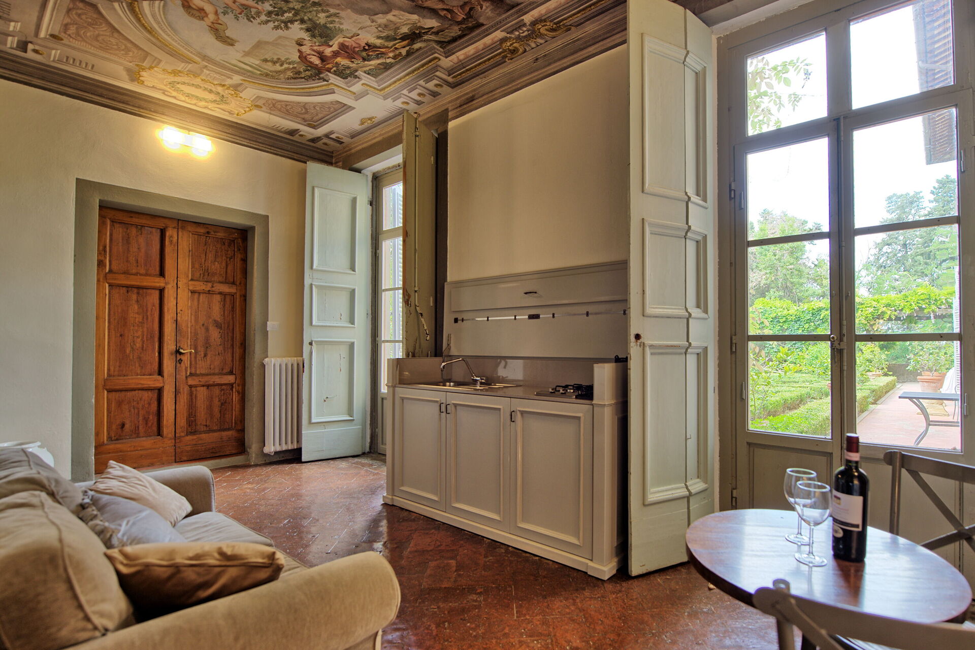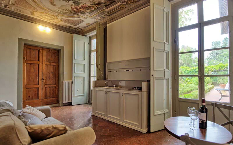 Ground floor: entrance offering beautiful frescoed ceilings with small kitchenette and access to the Italian garden, large living-room with dining area and 2 sofa beds, double bedroom with frescoed ceilings, bathroom with shower.