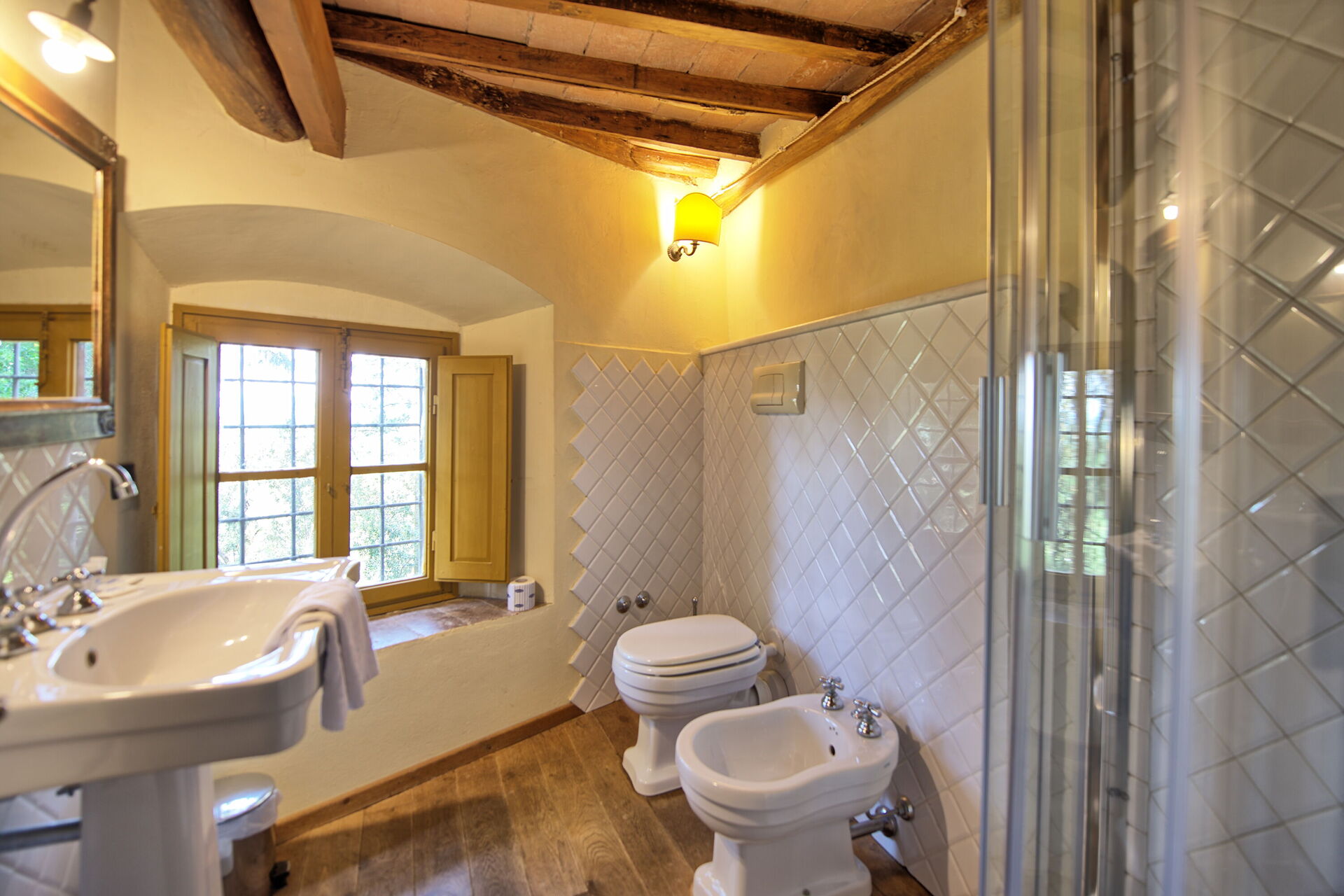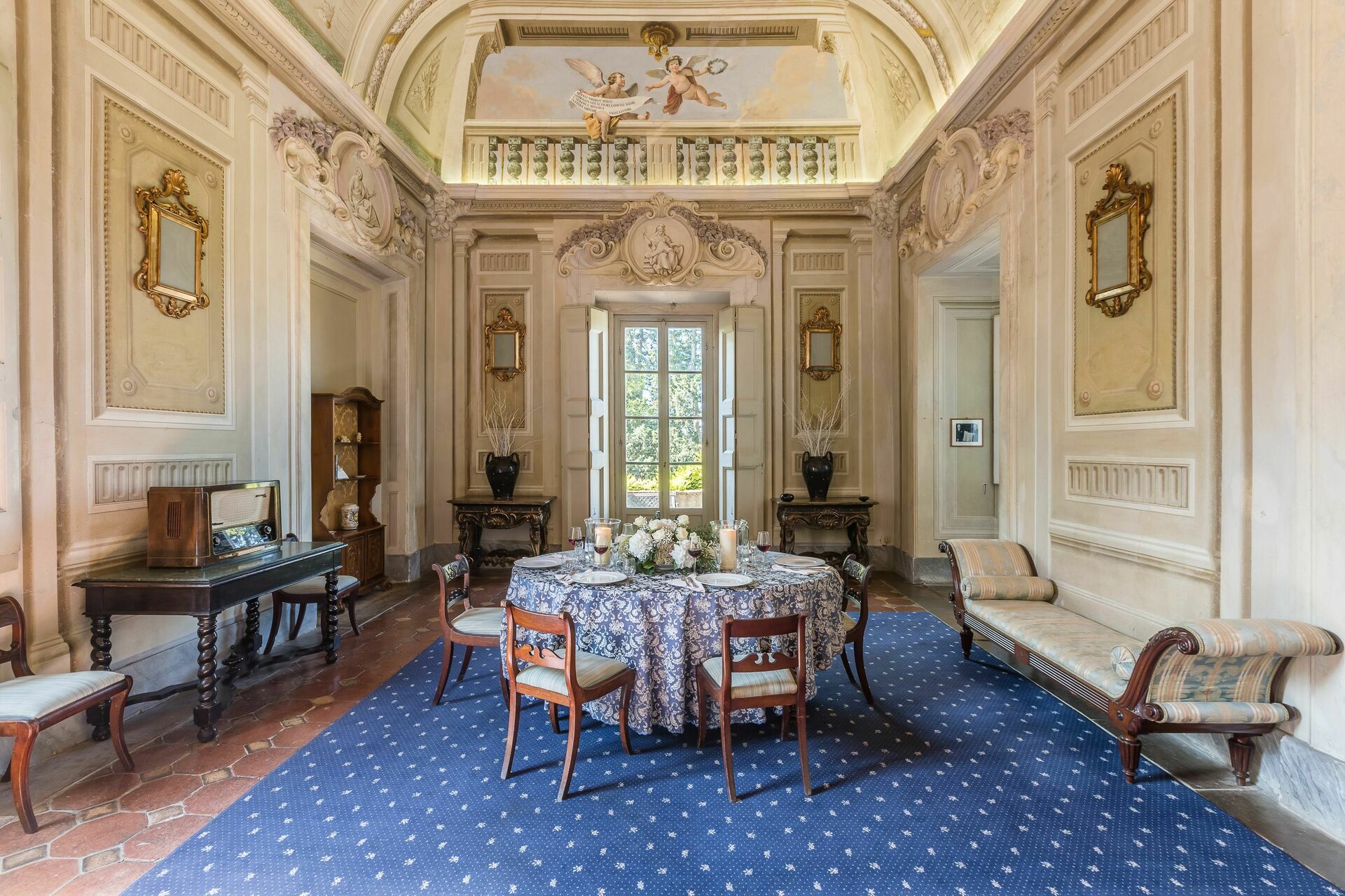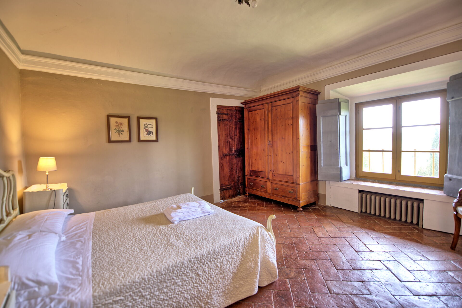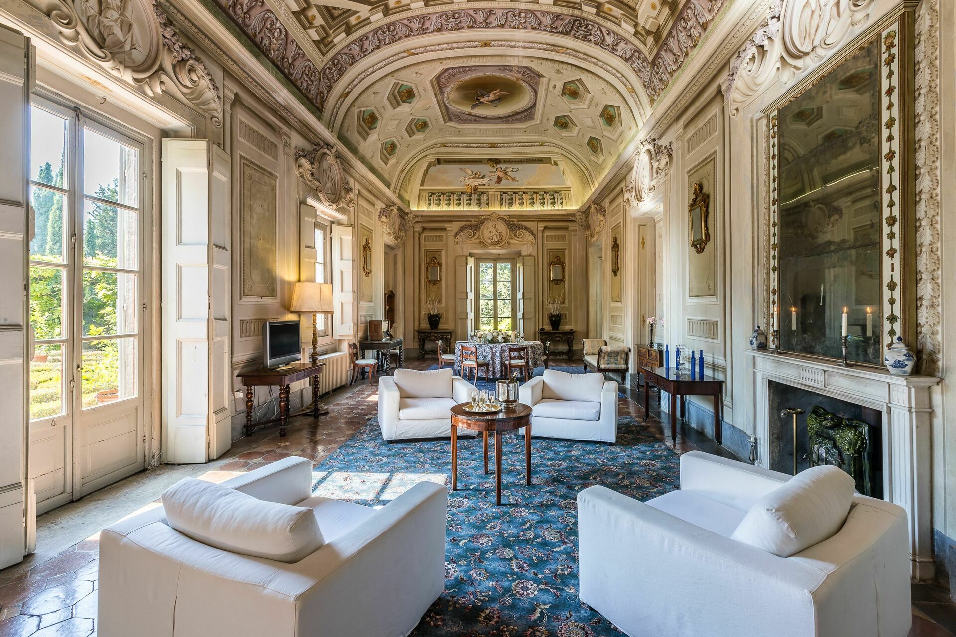 Ground floor: large entrance once used as “sale d’armes”, spacious and bright living-room with beautiful frescoed ceilings, fireplace (non working) with frescoes of Pucci dating back to 1700 ad access, through 6 big French windows, to the charming Italian garden, bathroom with shower.