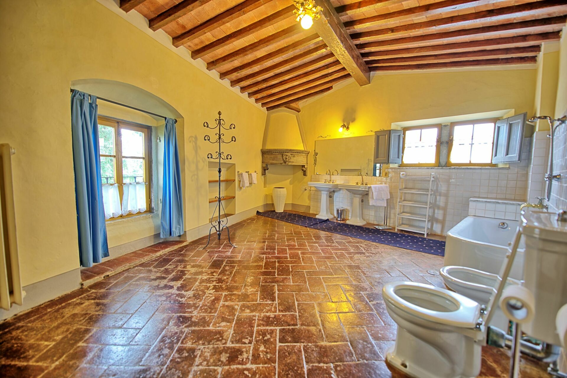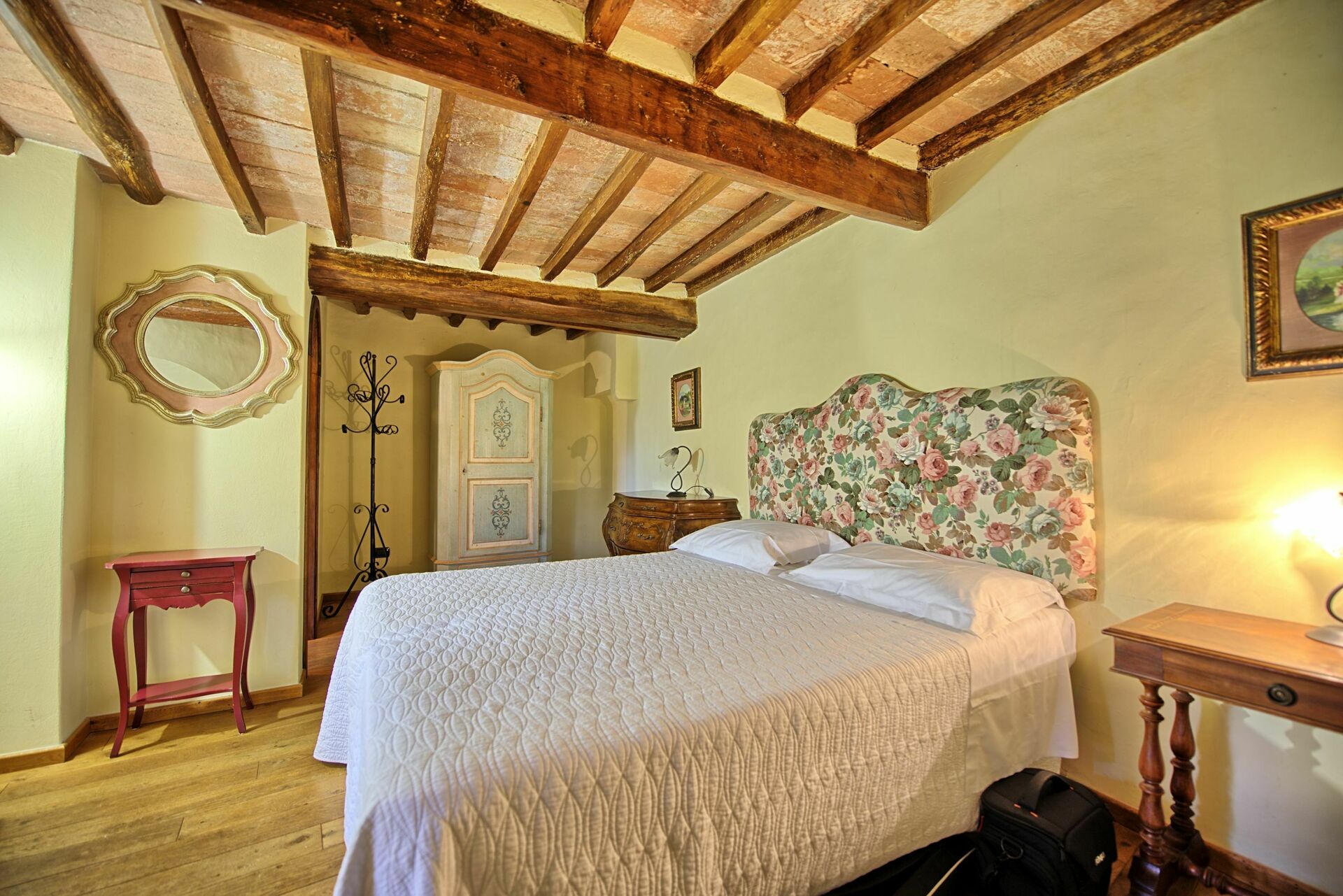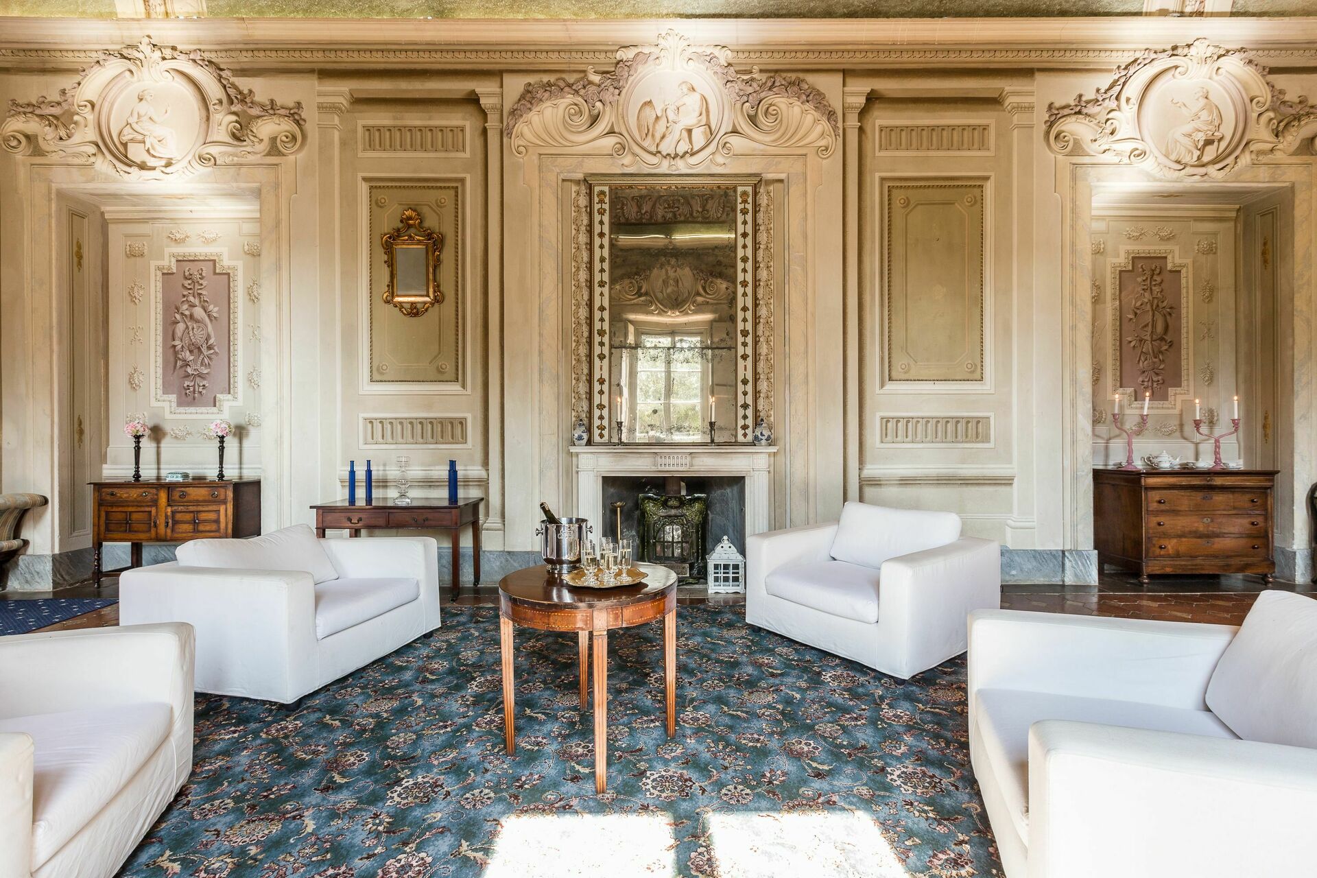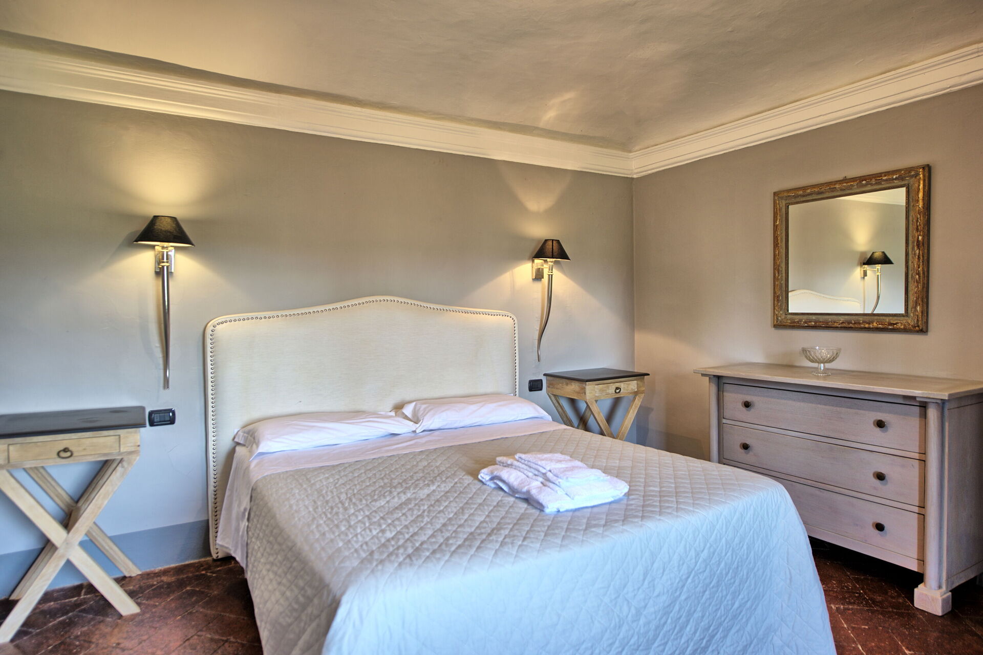 Ground floor: large entrance once used as “sale d’armes”, spacious and bright living-room with beautiful frescoed ceilings, fireplace (non working) with frescoes of Pucci dating back to 1700 ad access, through 6 big French windows, to the charming Italian garden, bathroom with shower.