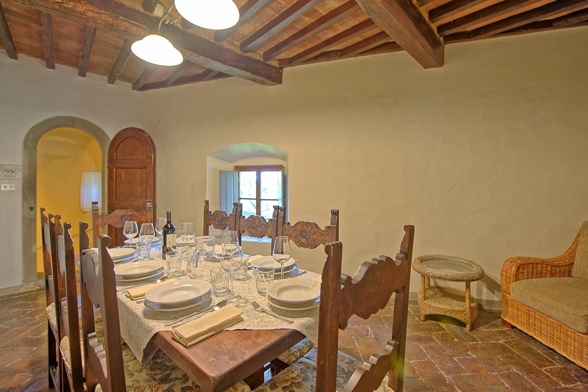 Some steps higher: dining-room with access to the kitchen and to a nice terrace furnished for outdoor meals looking over one of the courtyards of the castle.