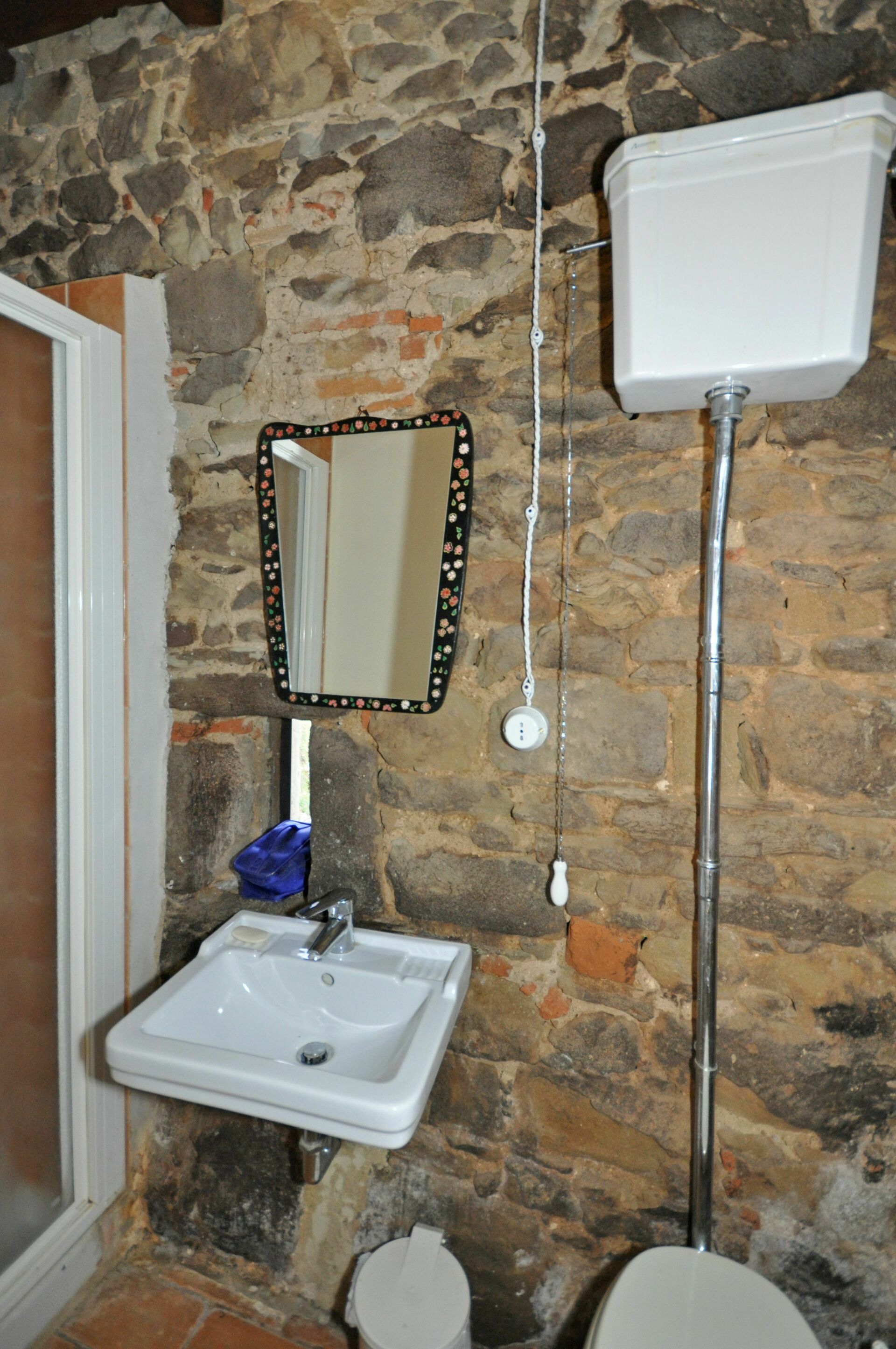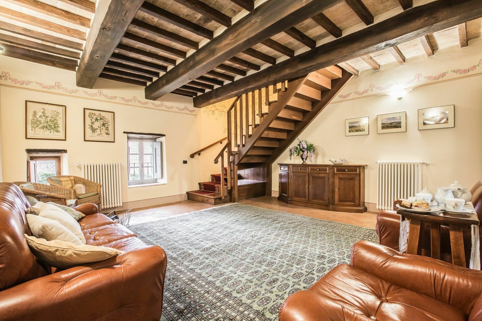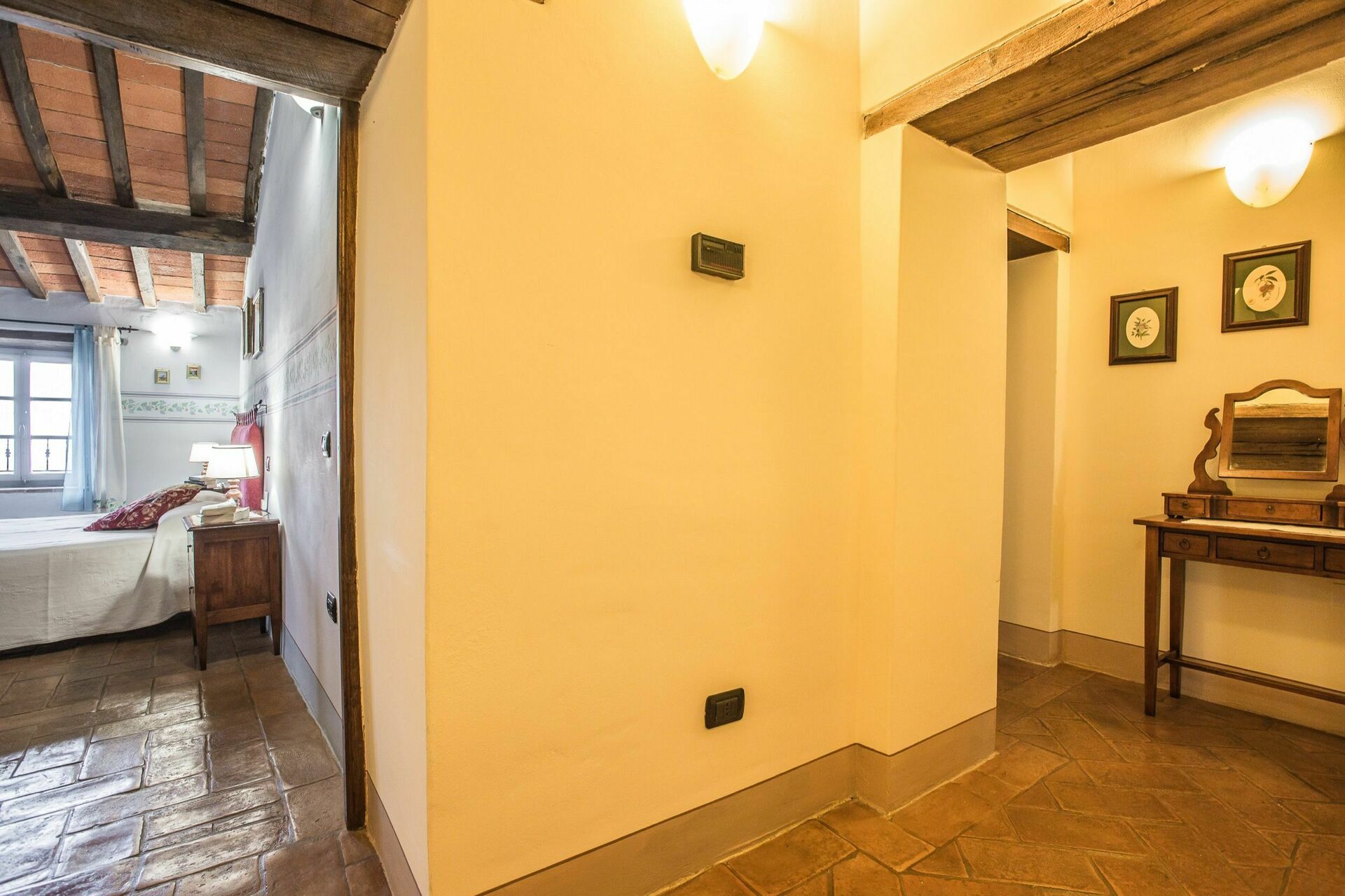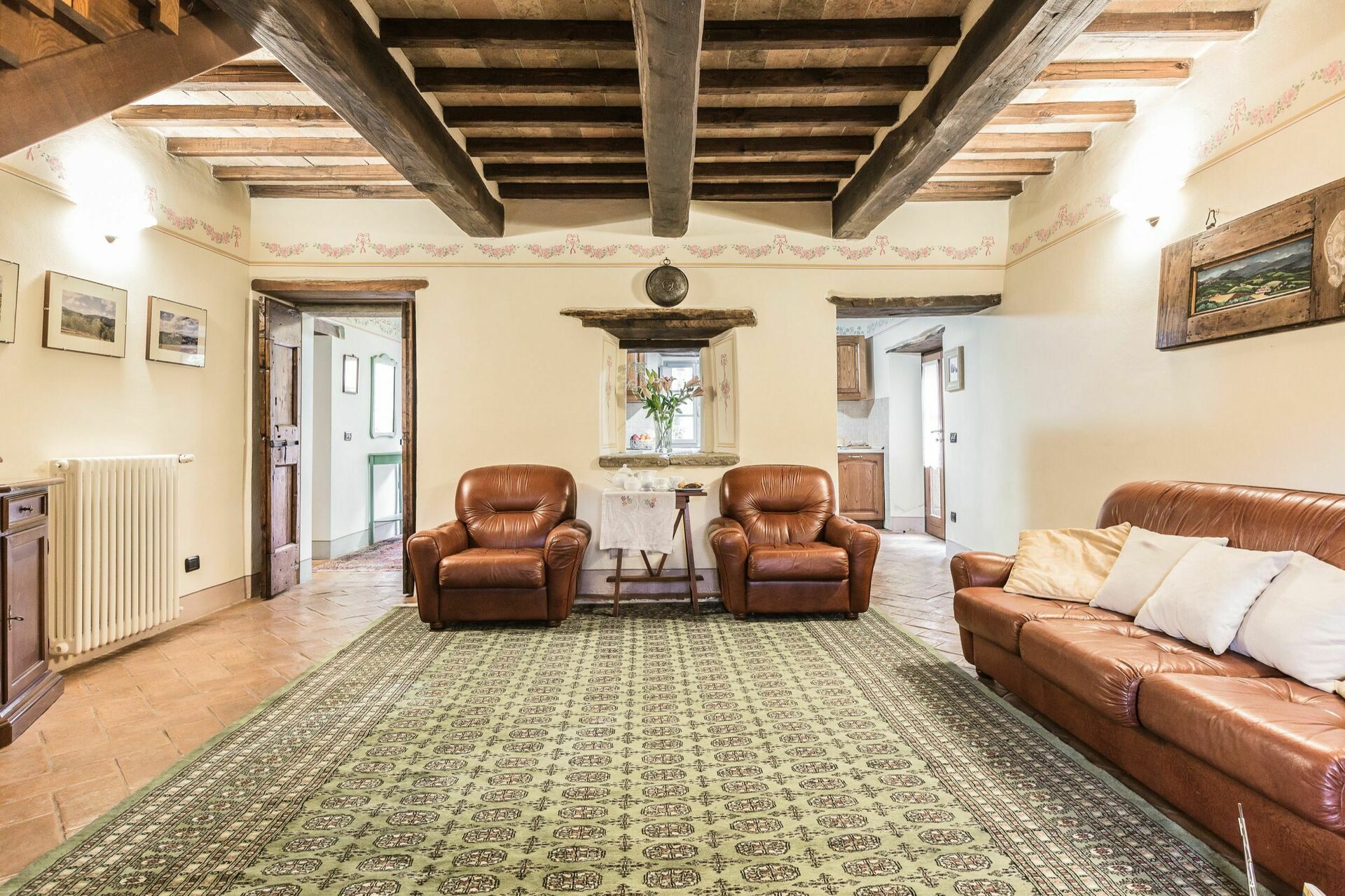 Traditional Tuscan style was maintained in the recent restoration of this property. The ceiling and floors are beautifully finished with terracotta tiles, and the ceilings have exposed wooden beams. The original wooden doors have all been refinished with antique hardware.