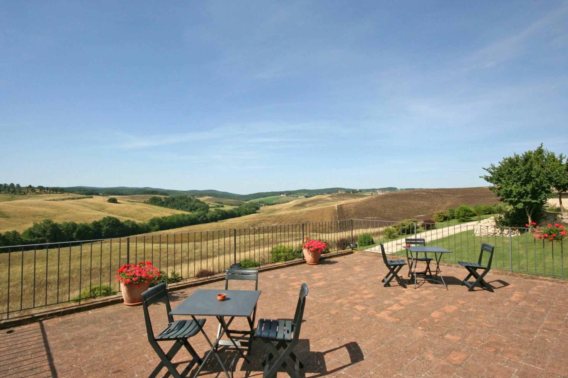 Located south of Siena on the edge of the Crete Senesi, the property enjoys a tranquil, panoramic position inside a large farm (400 hectares) that produces wine and olive oil. Magnificent view of the countryside, characterized by the rolling hills of the Val D’Orcia and the city of Siena on the horizon. The apartments are furnished in a comfortable, rustic style. Outside, guests may use a charming, partially covered terrace (110m2) with a beautiful view.