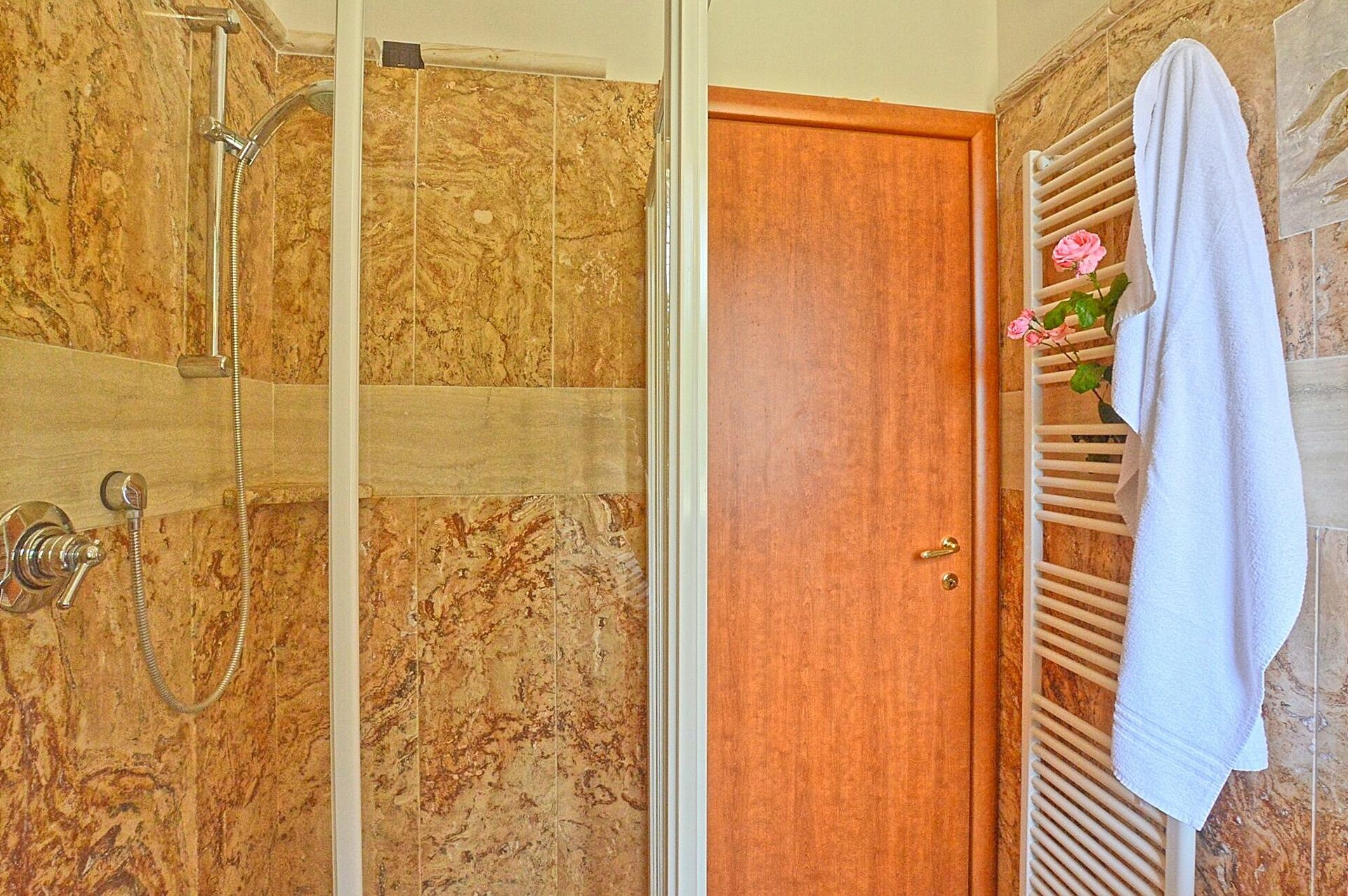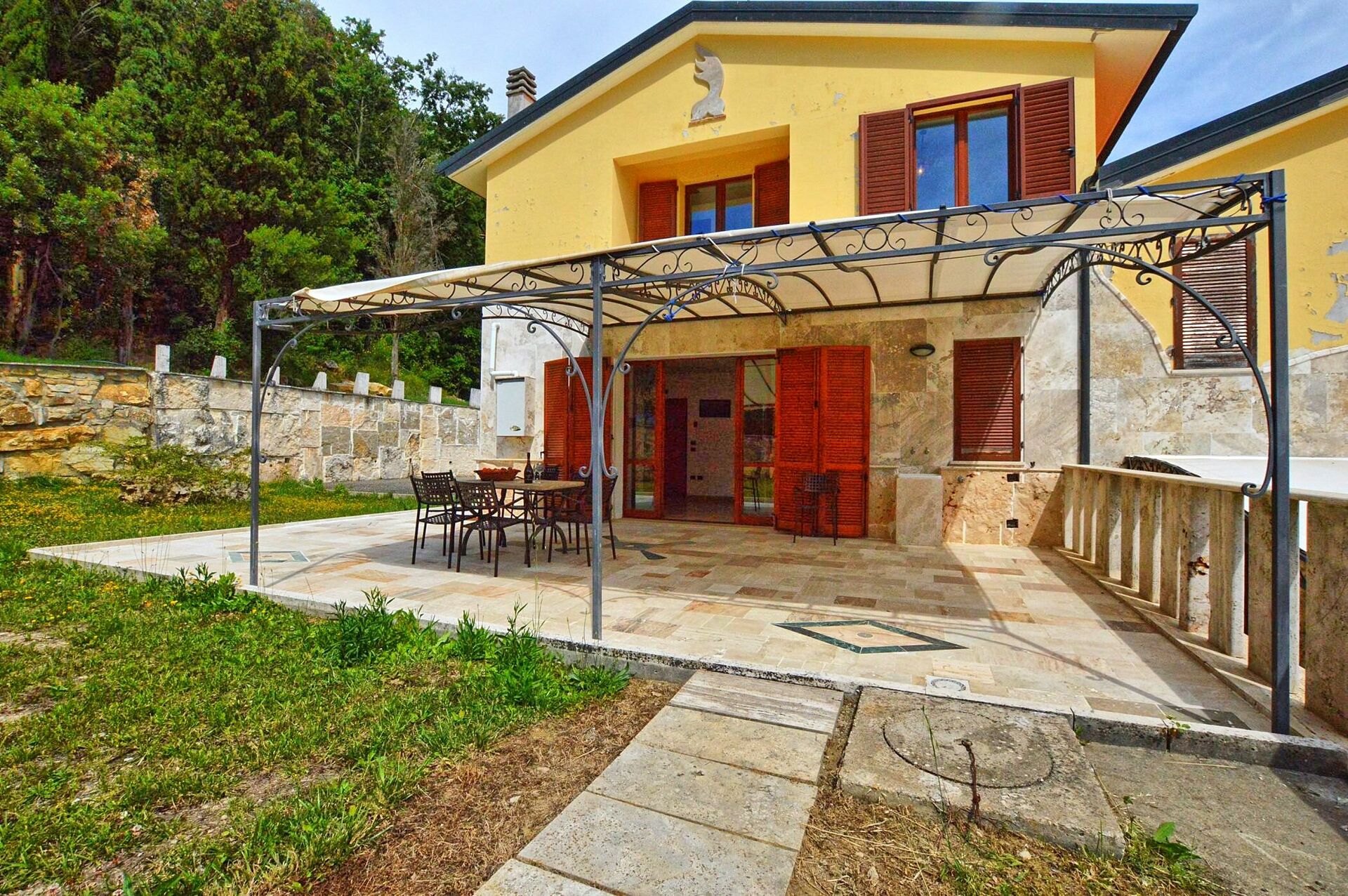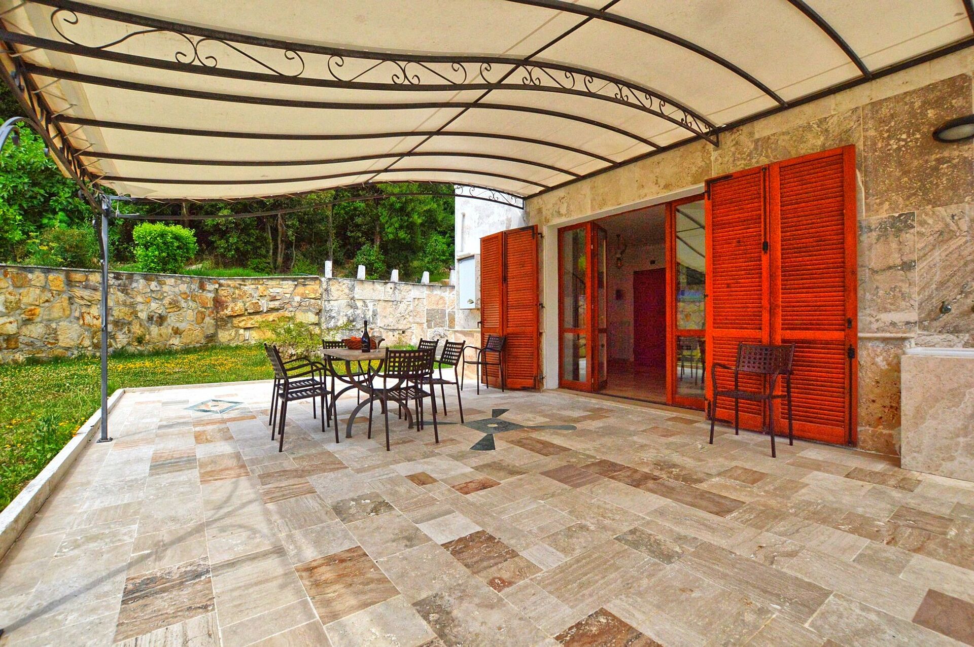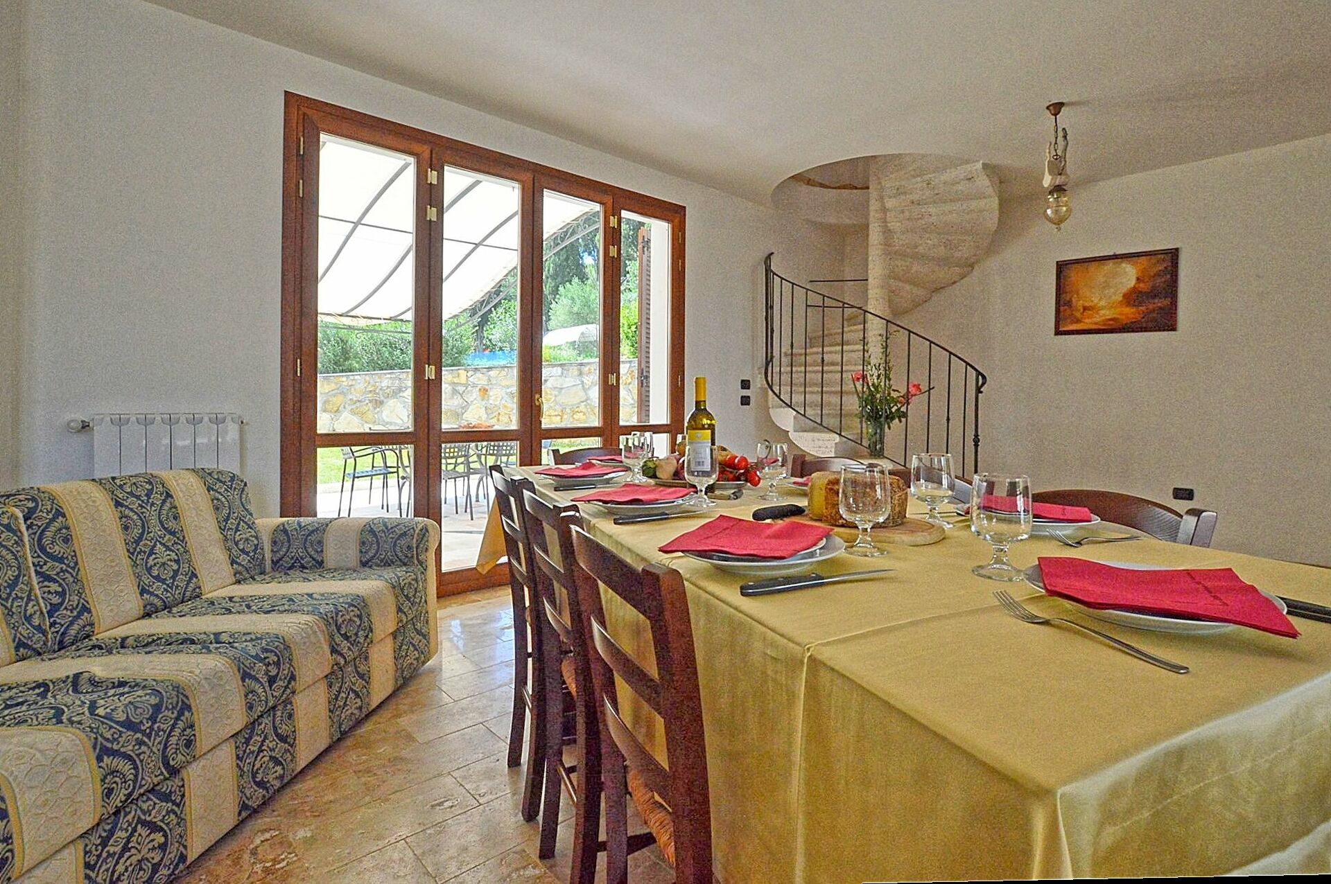 Ground floor: roomy living-room with double sofa-bed and dining area giving on to a large, partially shaded terrace, open kitchenette, bathroom with shower.