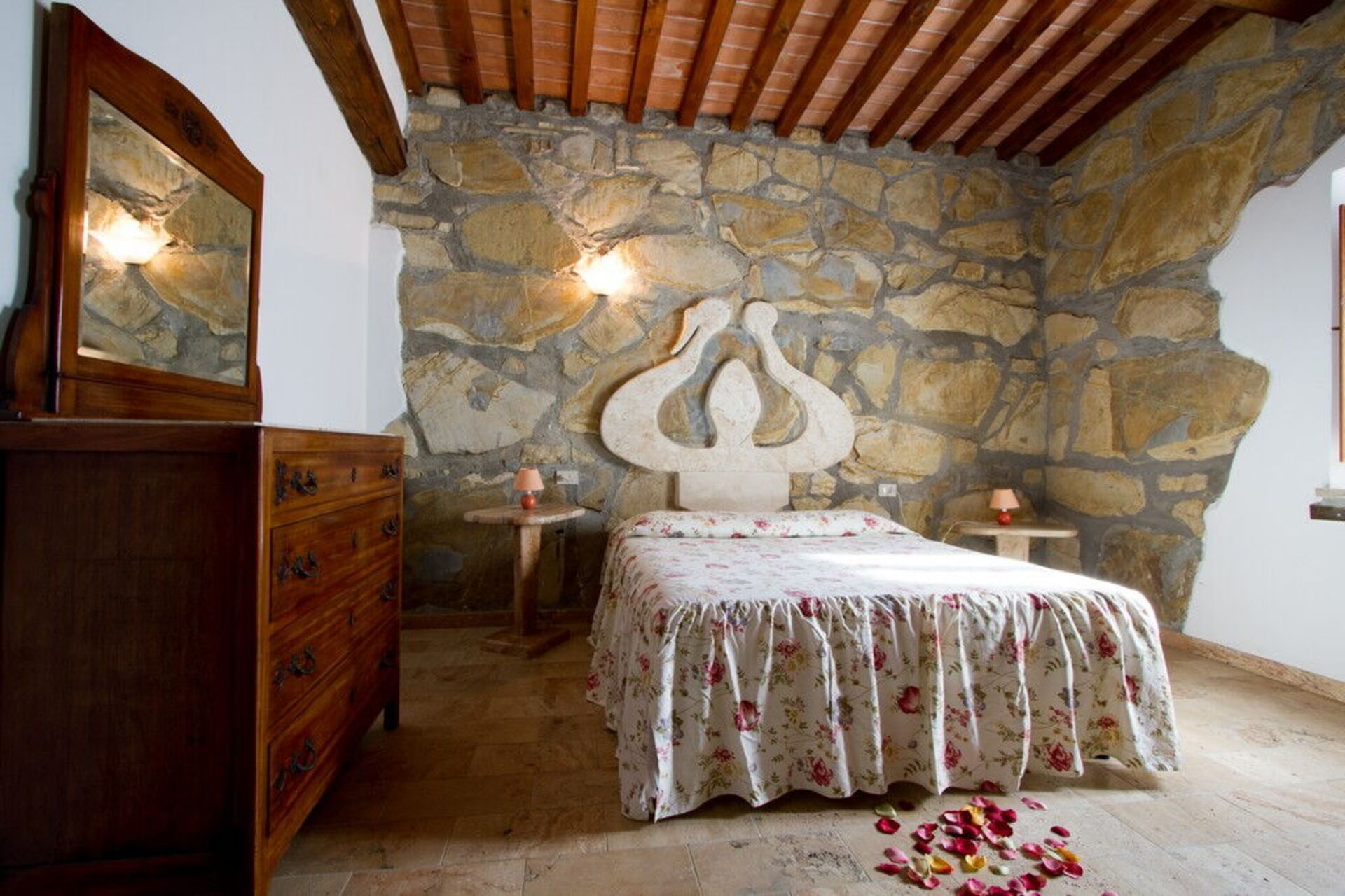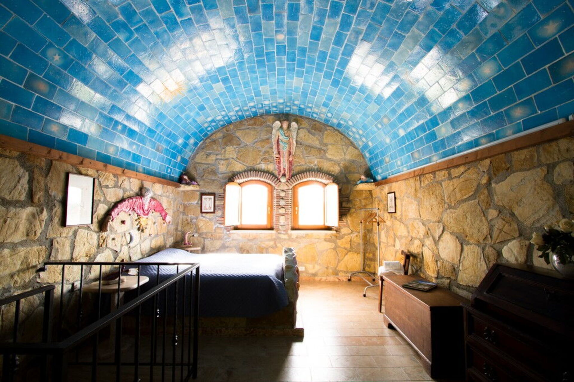 First floor in the tower: (accessible via a spiral travertine staircase): bedroom with stone made double bed and vaulted ceilings with ceramic tiles made by the artist.