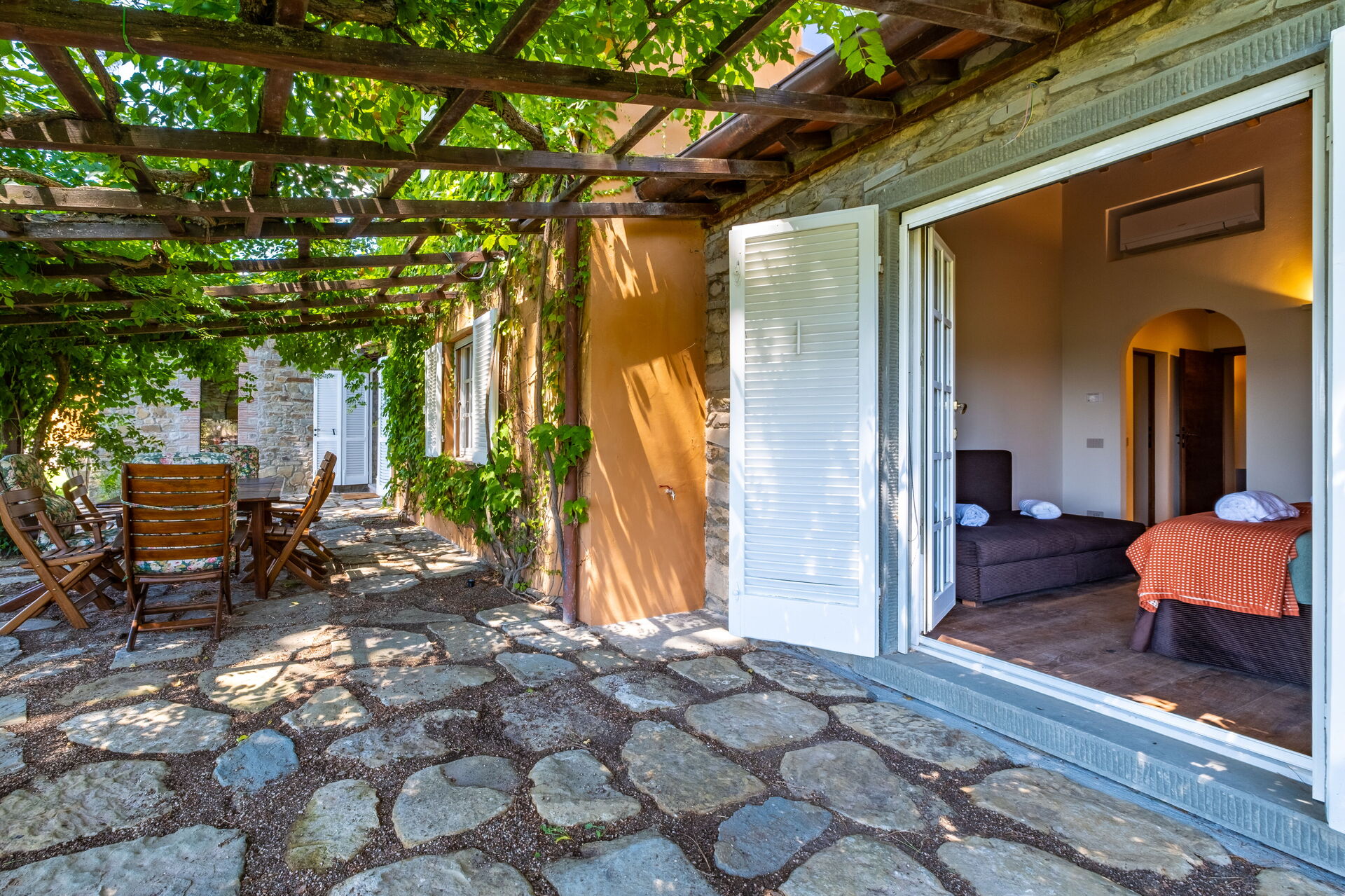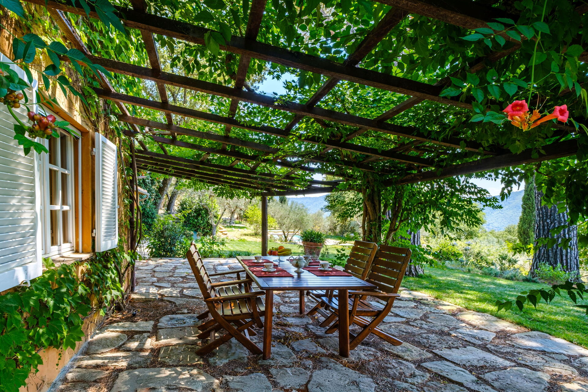 - Veranda with wooden pergola equipped for outdoor dining