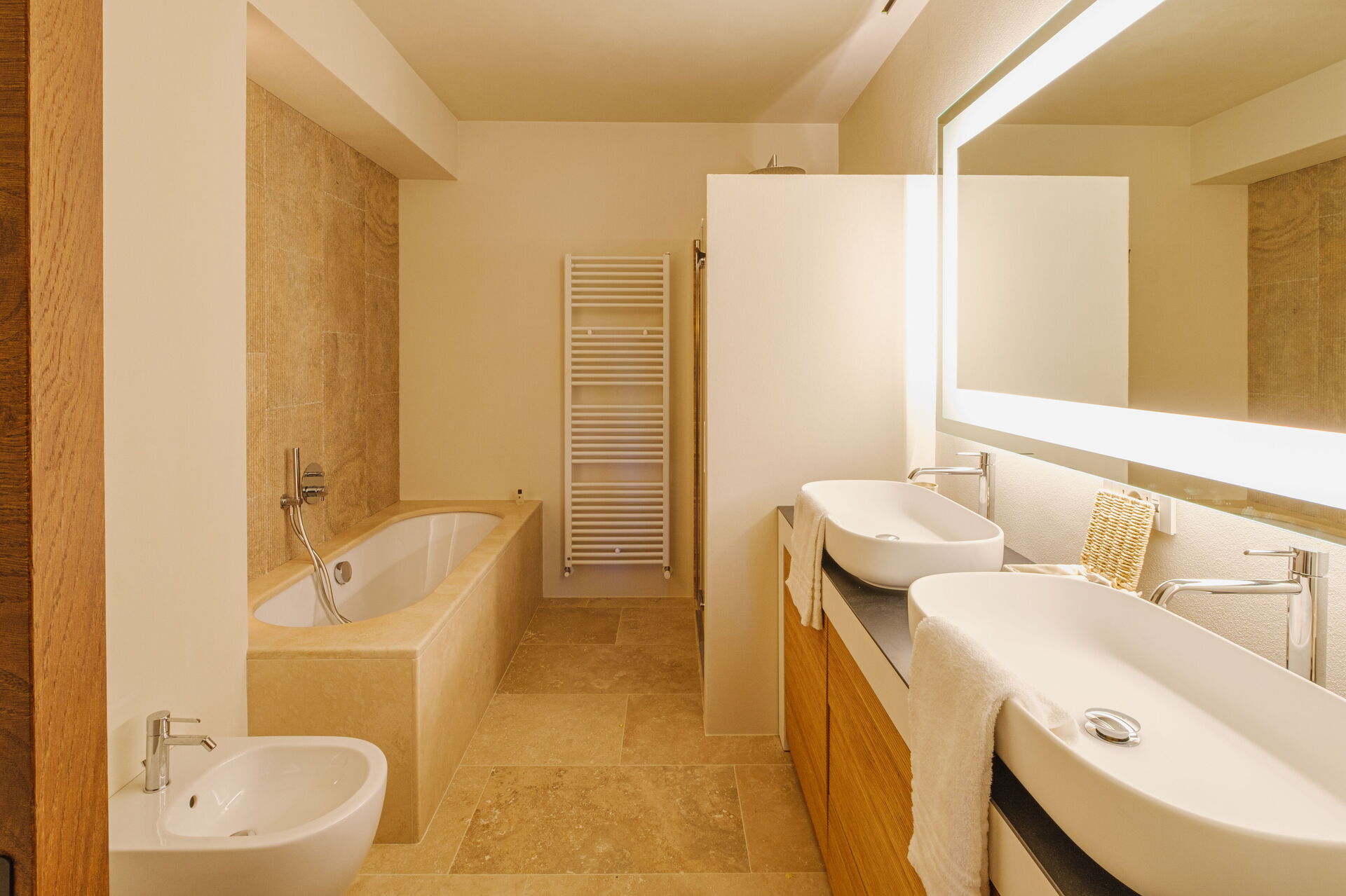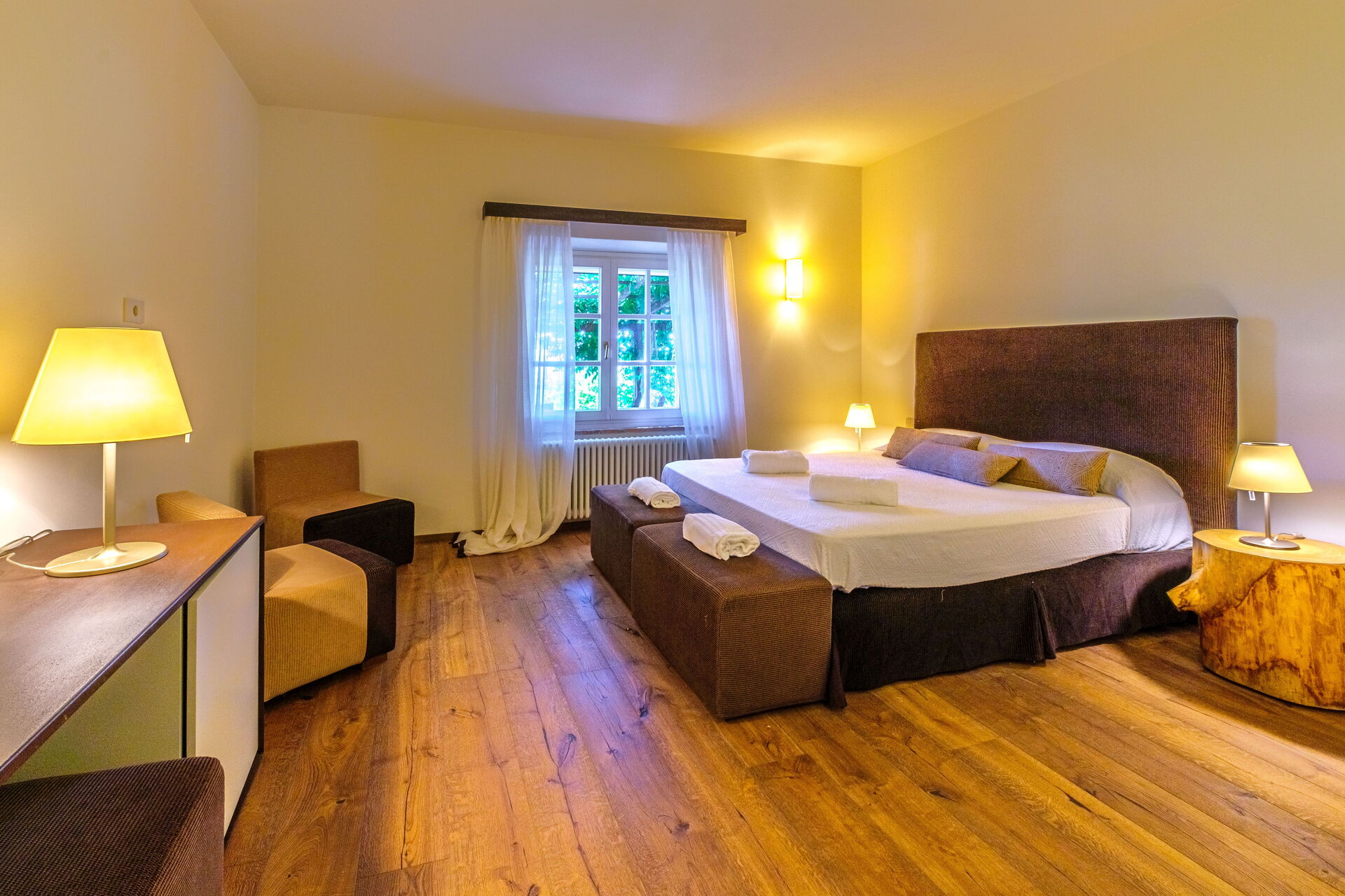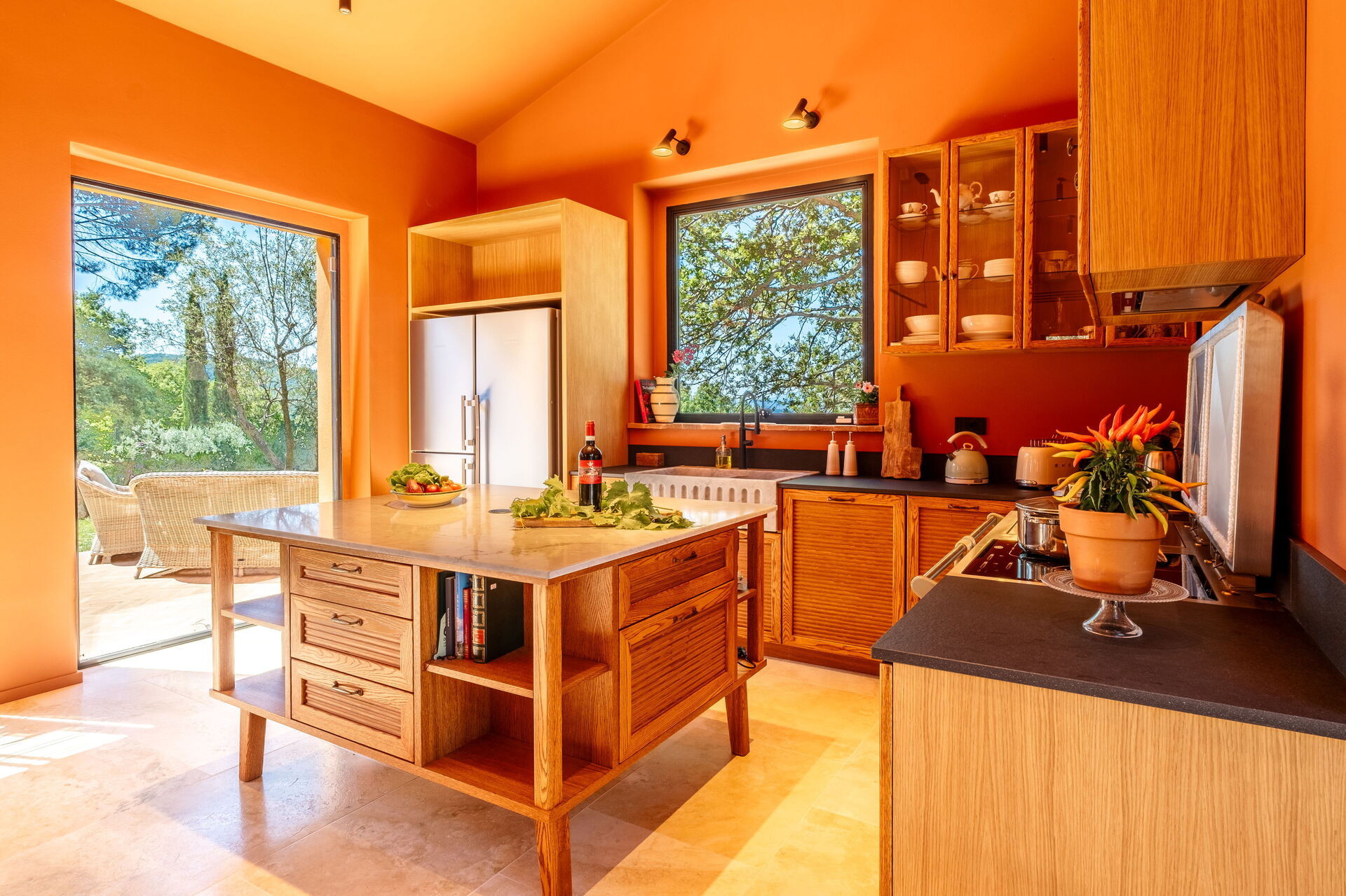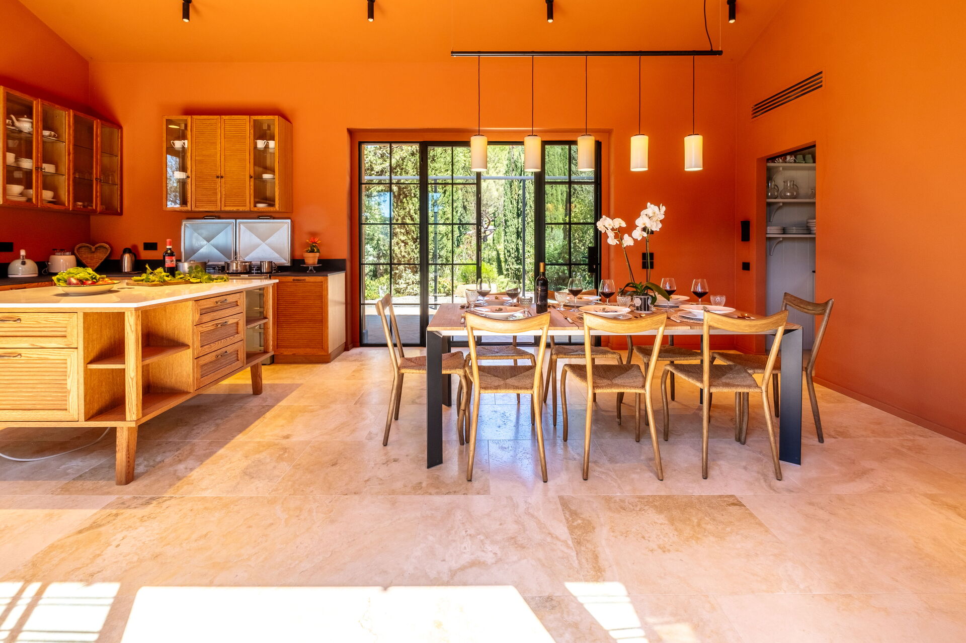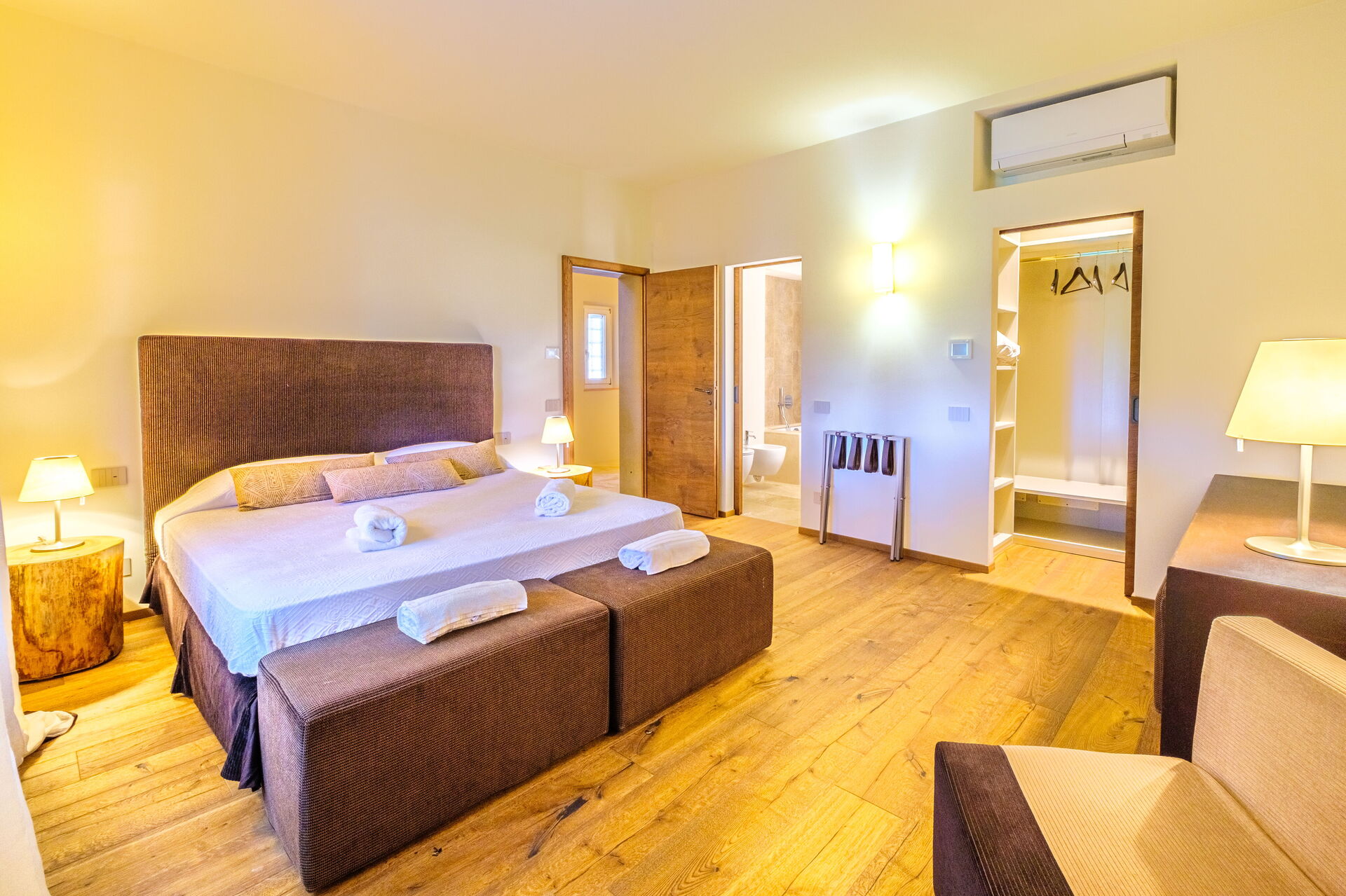 Ground floor: large living room with fireplace (smart TV), bright dining room and kitchen (induction hob, oven, fridge, freezer, dishwasher, wine cellar, toaster, espresso coffee machine, American coffee machine), laundry room (washing machine, dryer and iron), double bedroom (convertible on request into 2 single beds: bed size: 90x195 cm, air conditioning) with private bathroom with shower; double bedroom (king size bed: bed size: 180x200 cm, air conditioning) with private bathroom with shower, access to the garden; double bedroom (king size bed: bed size: 180x200 cm, air conditioning) with private bathroom with shower, double bedroom (king size bed: bed size: 180x200 cm, air conditioning) with walk-in closet, private bathroom with shower and bathtub, double bedroom (king size bed: bed size: 180x200 cm, air conditioning) with private bathroom with shower (without bidet, without window), access to the garden.