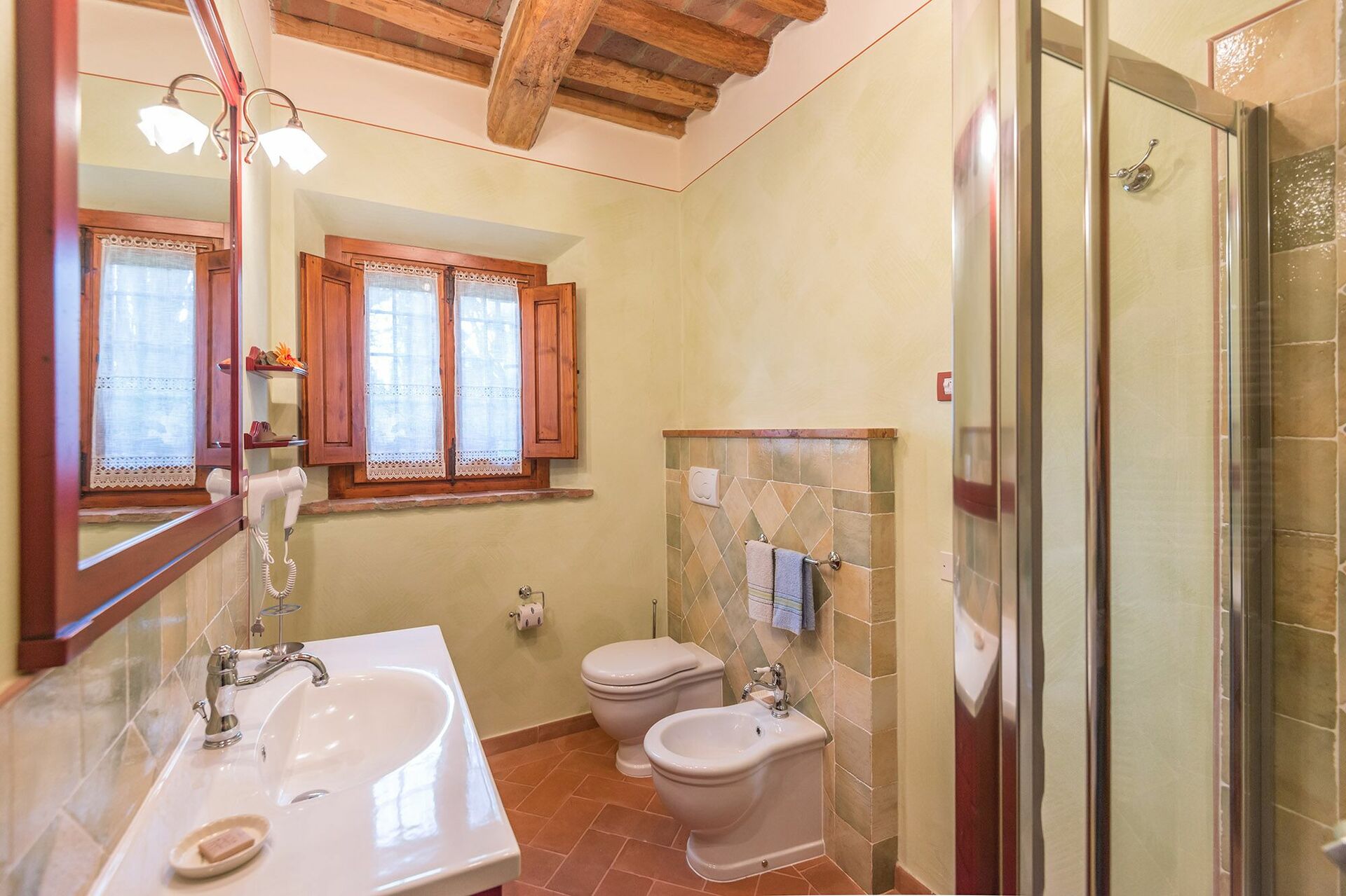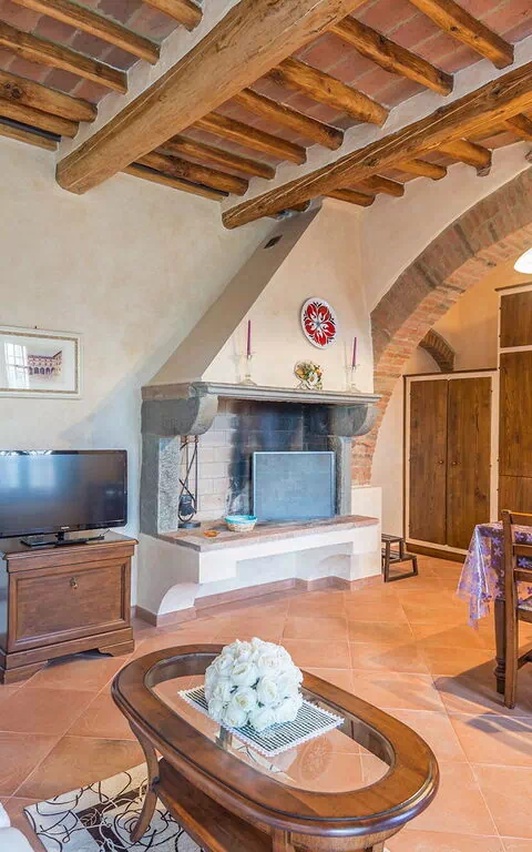 Ground floor: living room with double sofa bed (at extra cost), dining room with kitchen and fireplace, two double bedrooms, two bathrooms with shower.