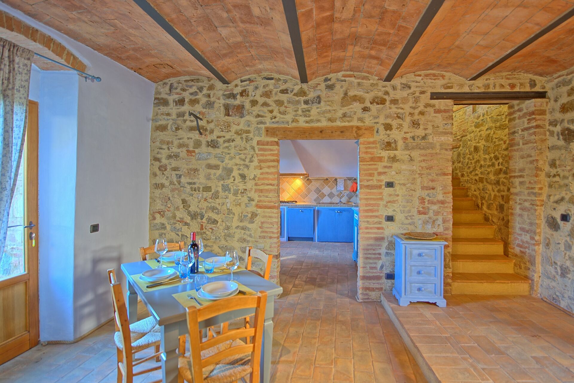1 step down: dining area, kitchen (microwave, dishwasher, oven, moka for coffee, hob, fridge, freezer, toaster)