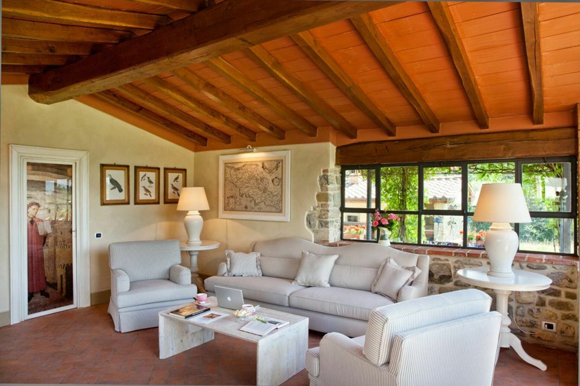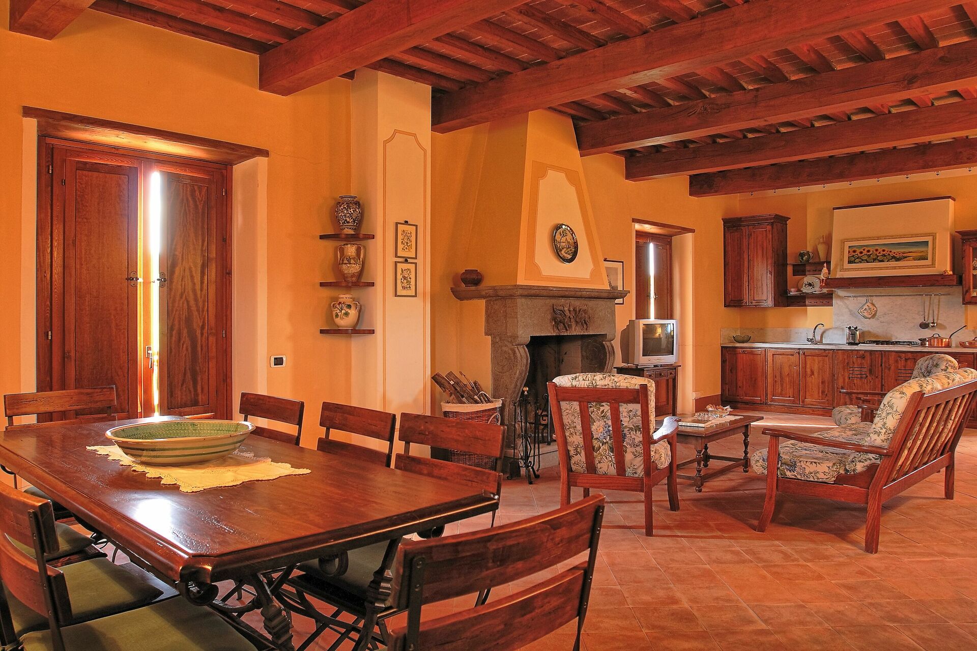 Recently restored it has managed to maintain its original charm thanks to the rare finishings: antique wooden beams, terracotta tiles, stone fireplaces in the large rooms, choice of colours