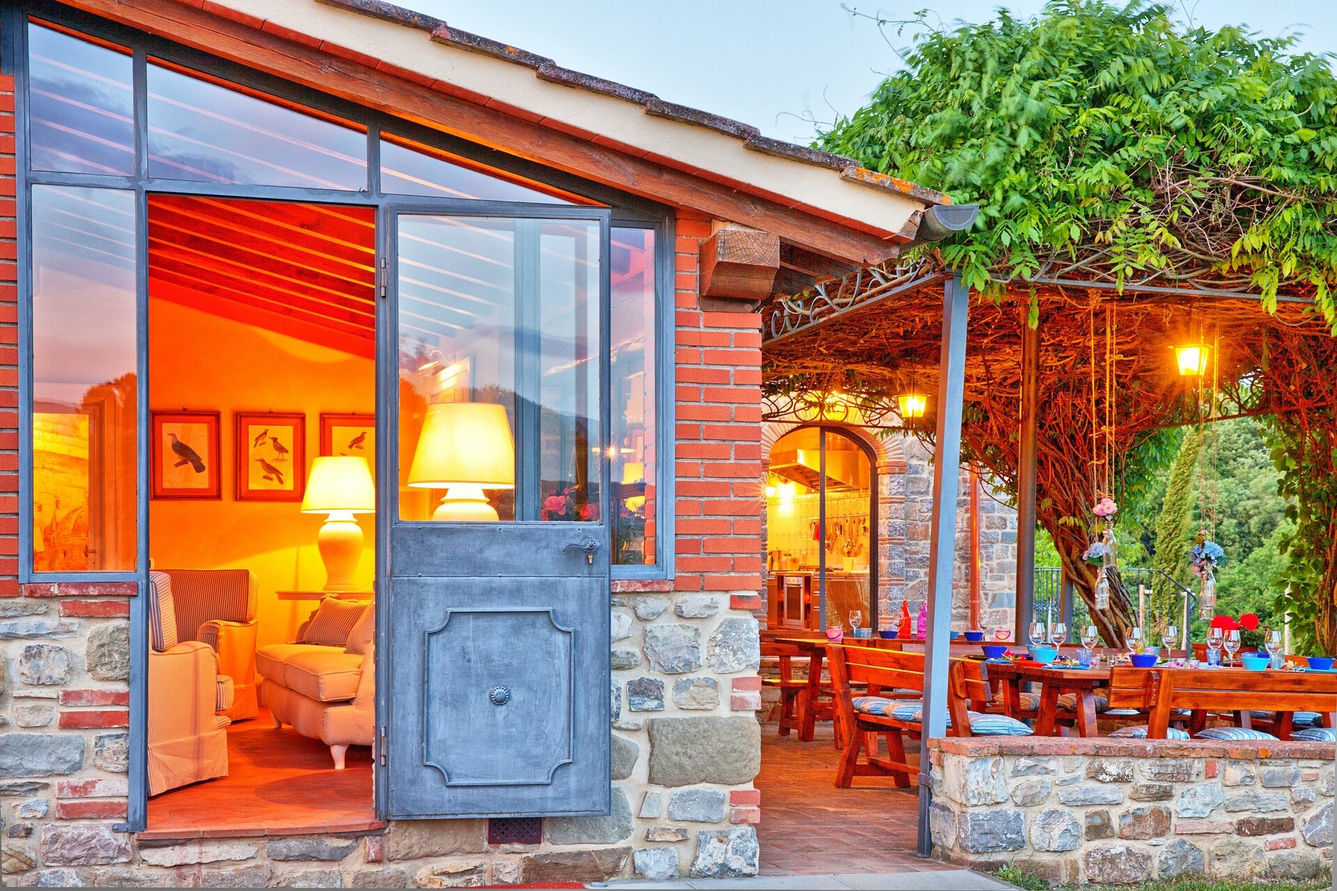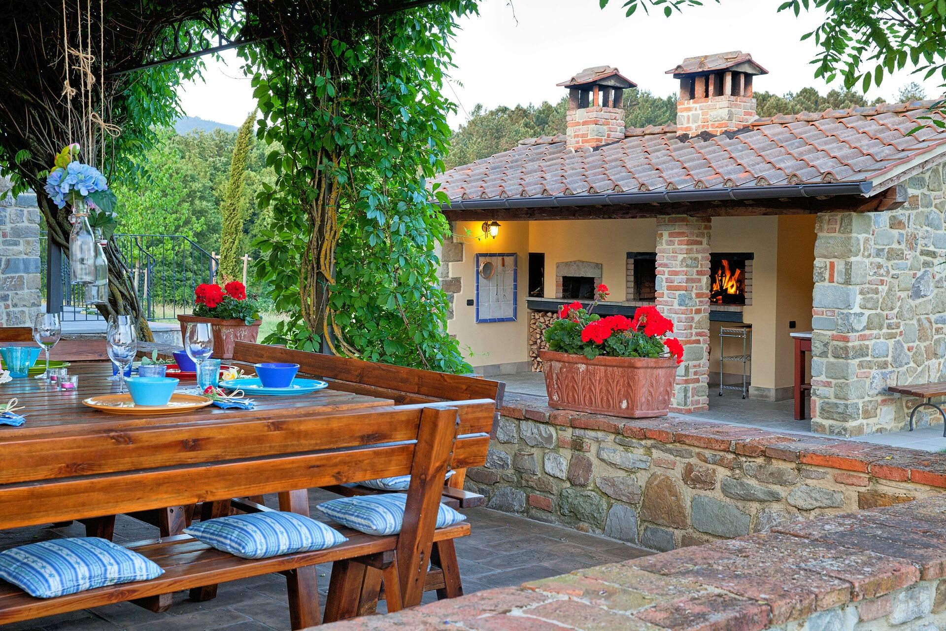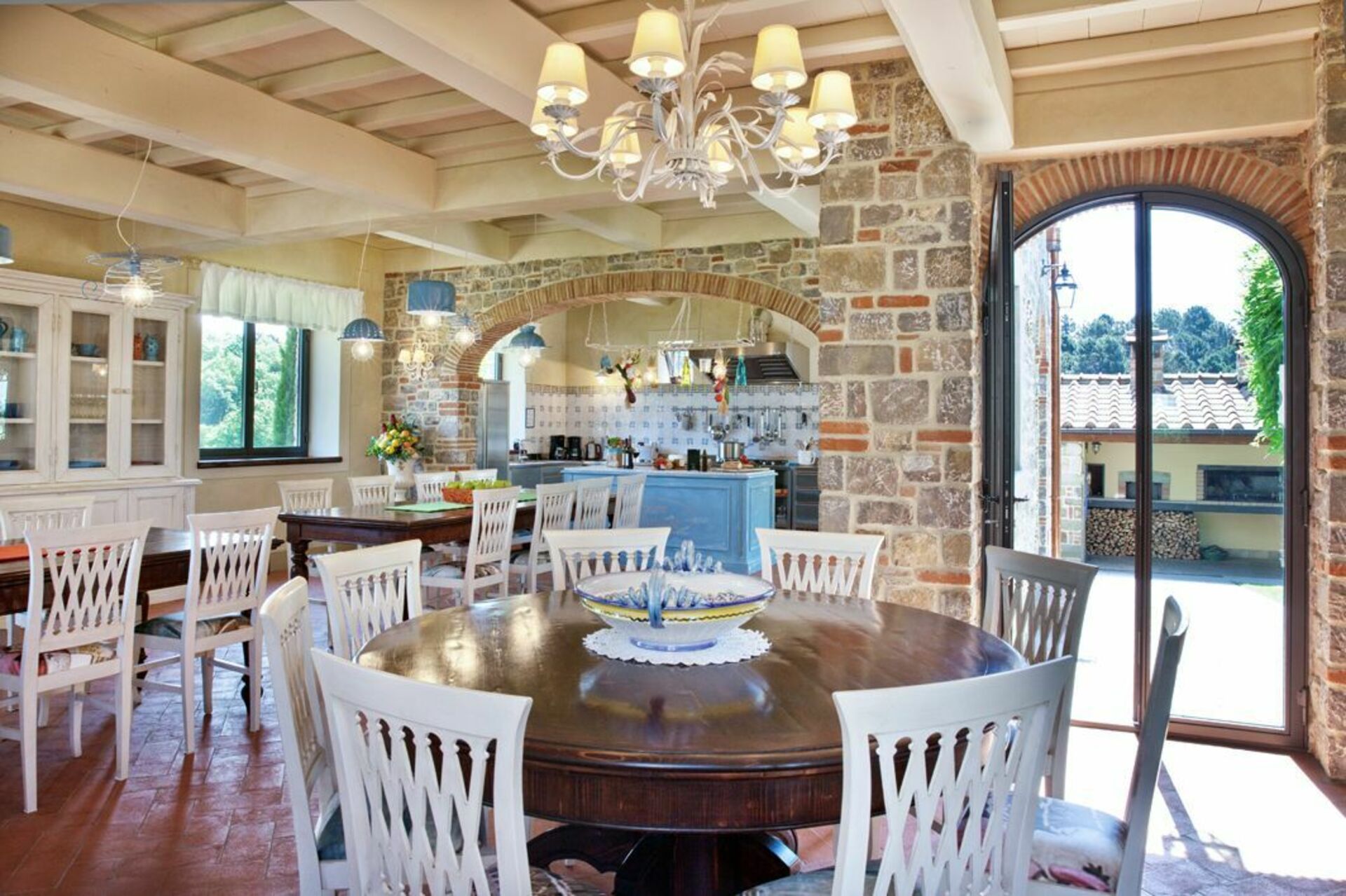 Is the ideal place to prepare meals and eat together, is in the middle of the garden is composed of a large dining room with fully equipped kitchen, also has a pergola covered terrace with tables and wooden chairs from which you also accessed in a wood oven and barbecue.