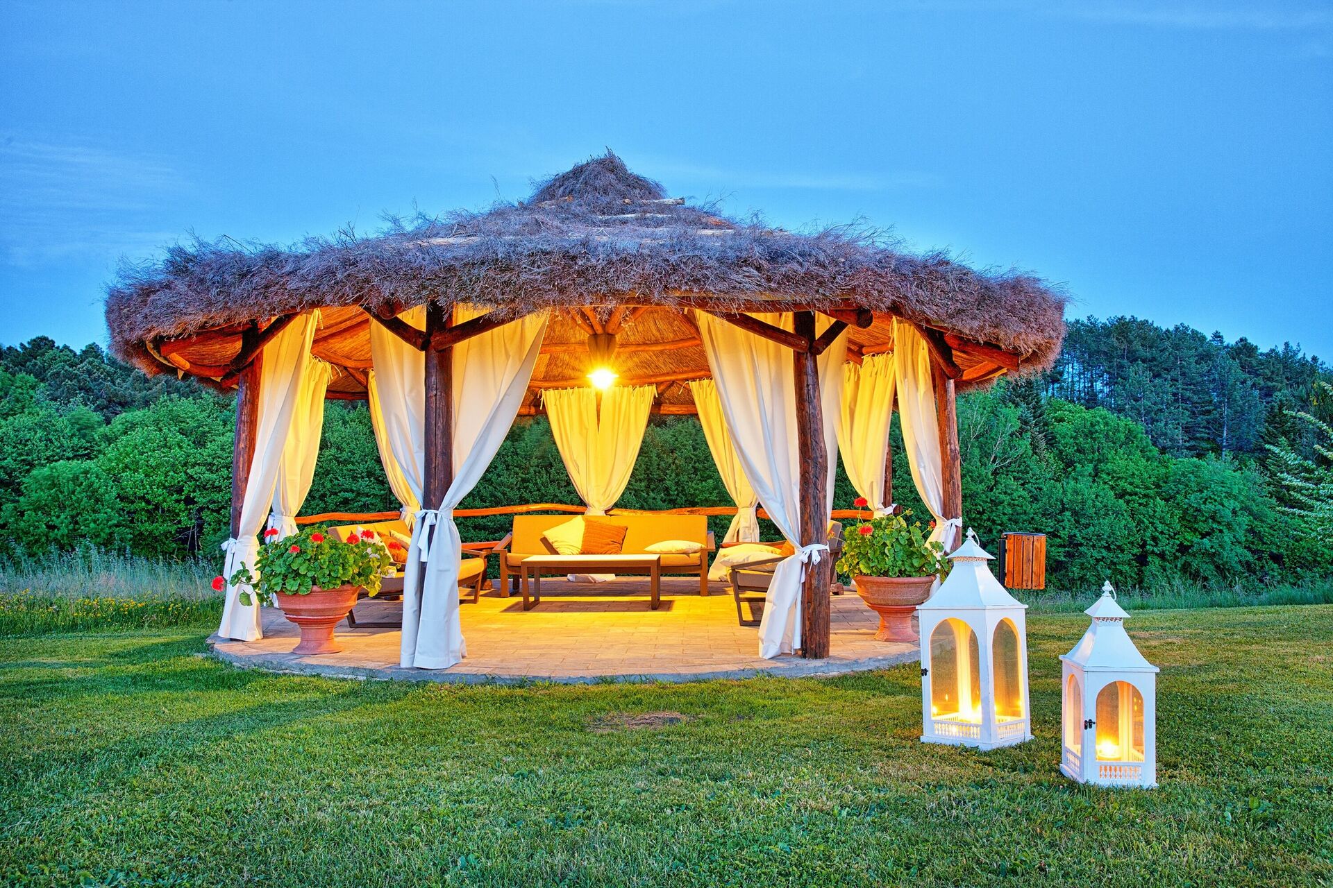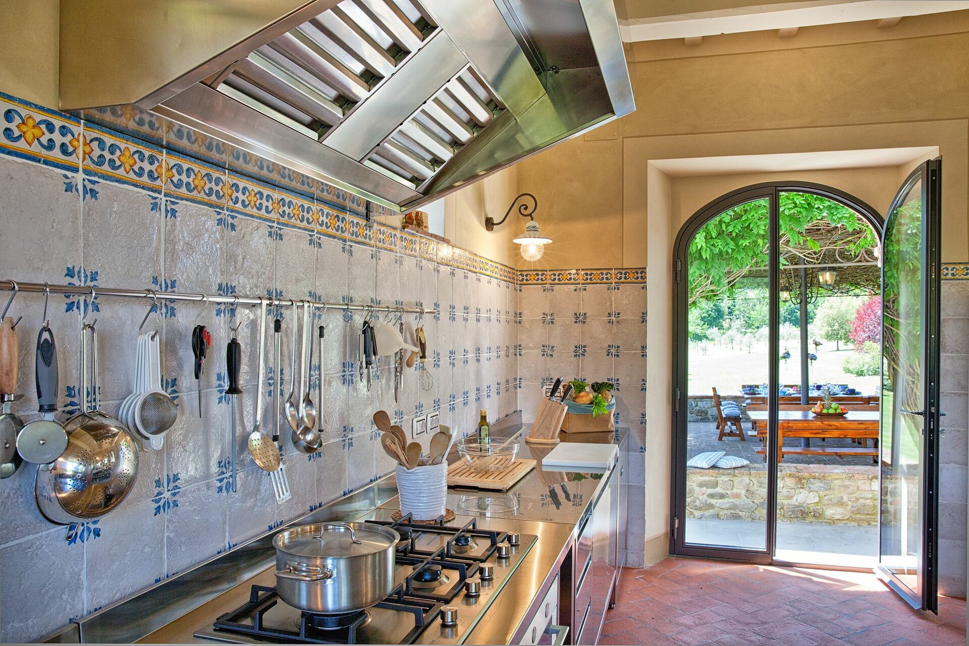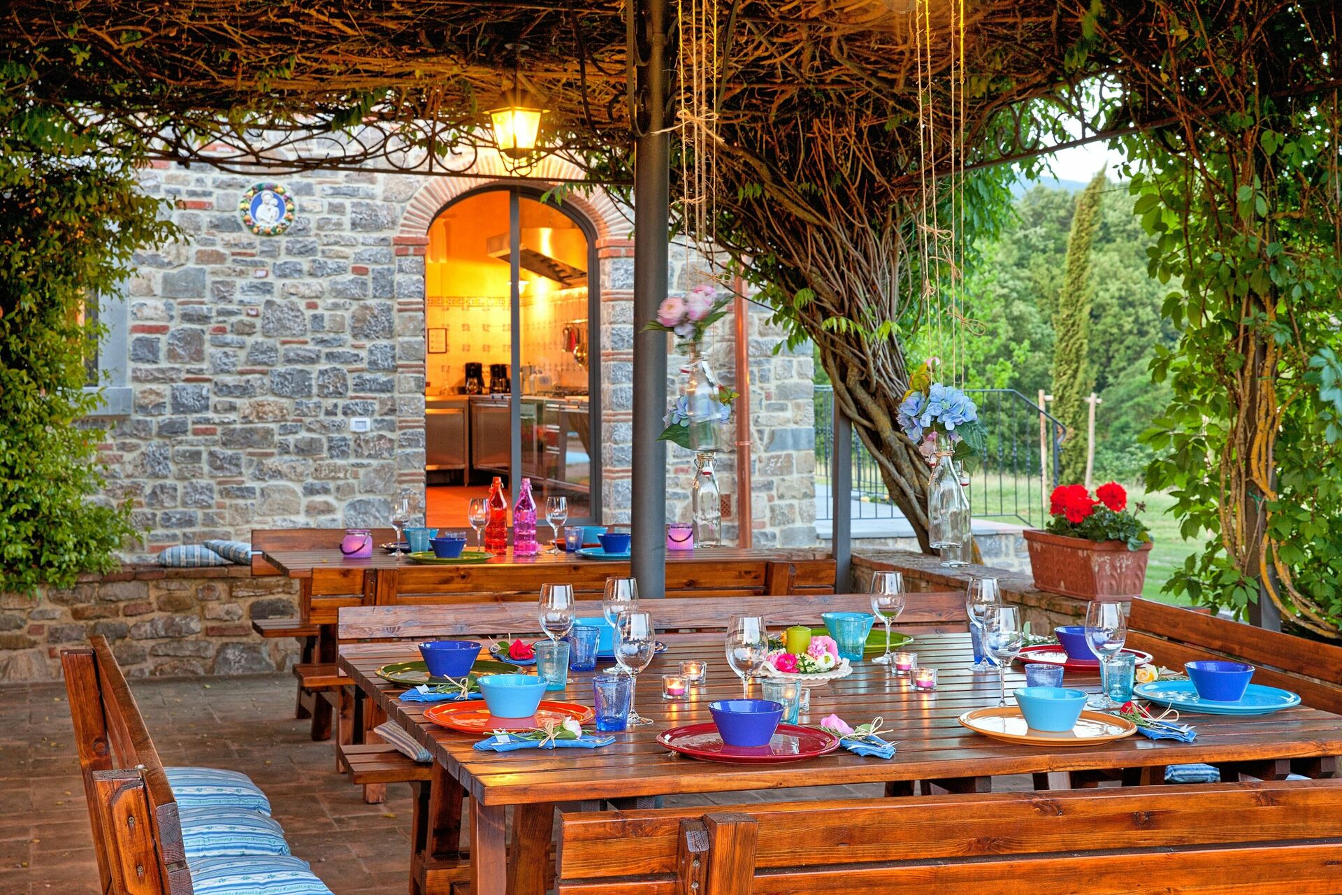 Is the ideal place to prepare meals and eat together, is in the middle of the garden is composed of a large dining room with fully equipped kitchen, also has a pergola covered terrace with tables and wooden chairs from which you also accessed in a wood oven and barbecue.
