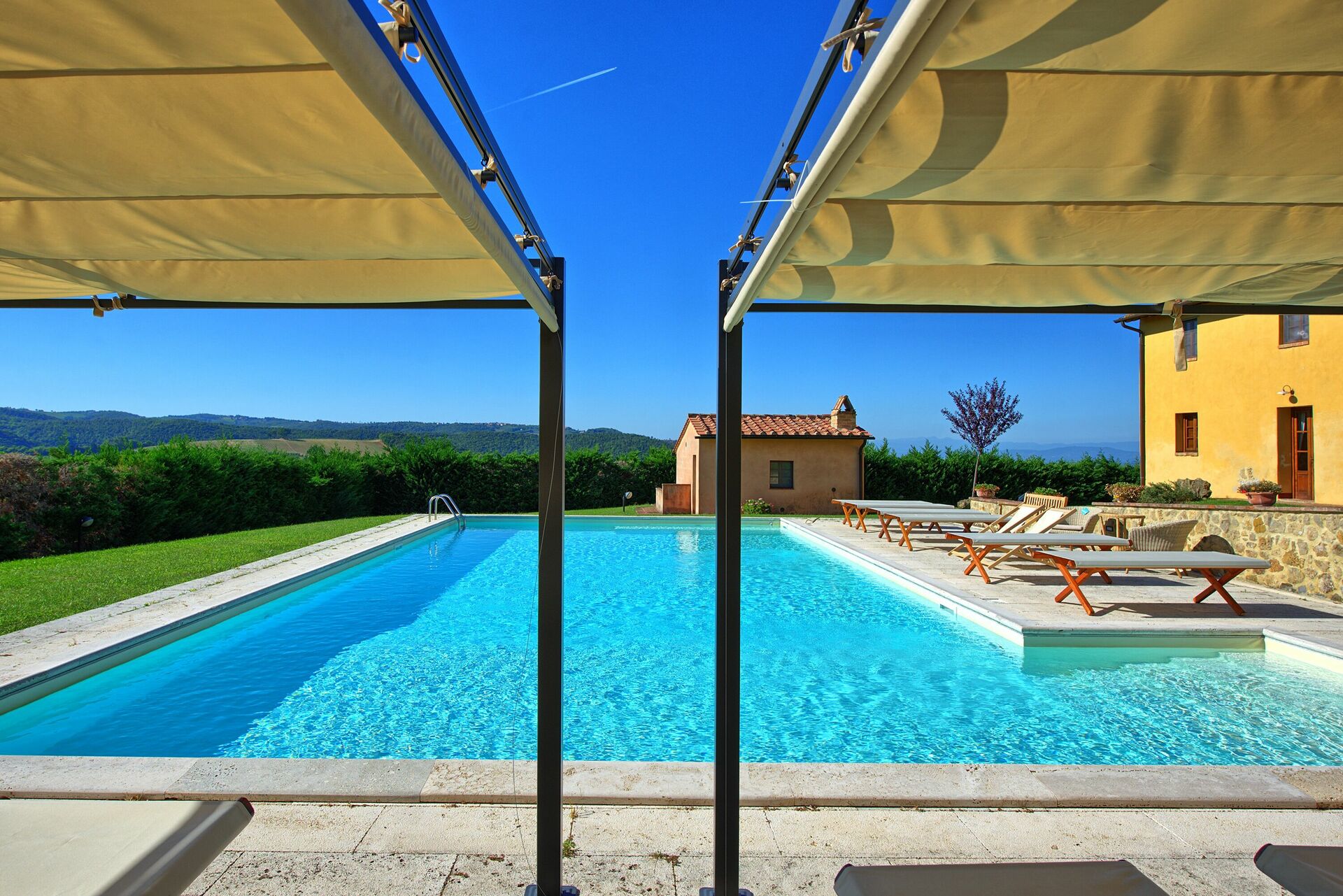 Outside, there is a beautiful garden with panoramic views, and a private pool equipped with sun loungers and gazebos: it is the ideal spot for relaxing and cooling off on summer days, admiring the marvelous sweeping views of the Chianti landscape. A barbecue area and covered pergola are ideal for enjoying meals outside.