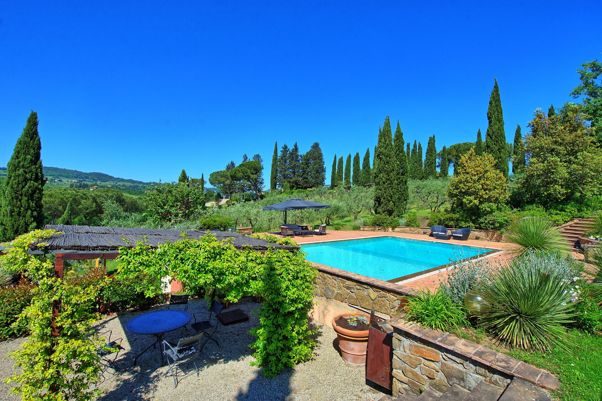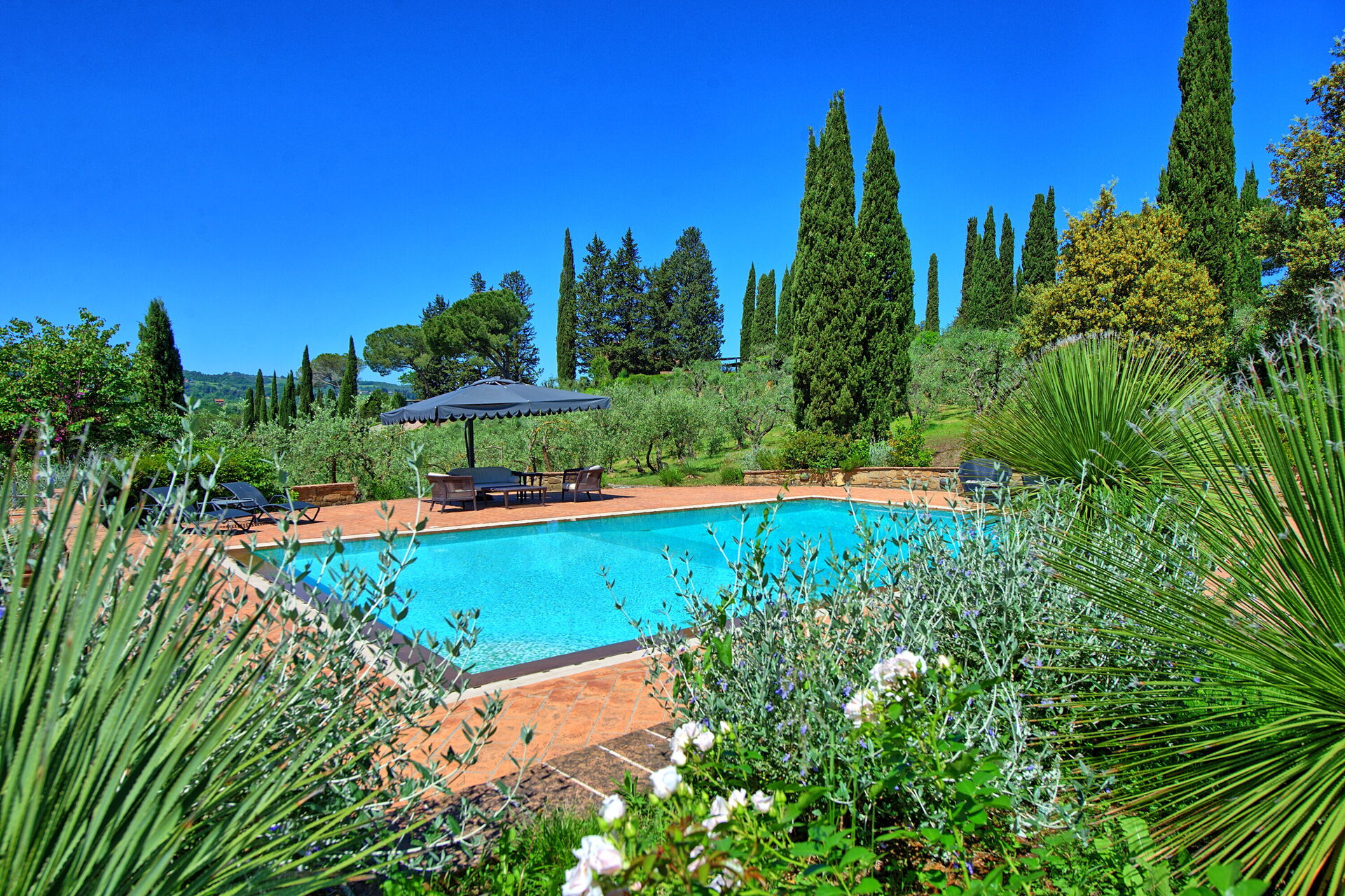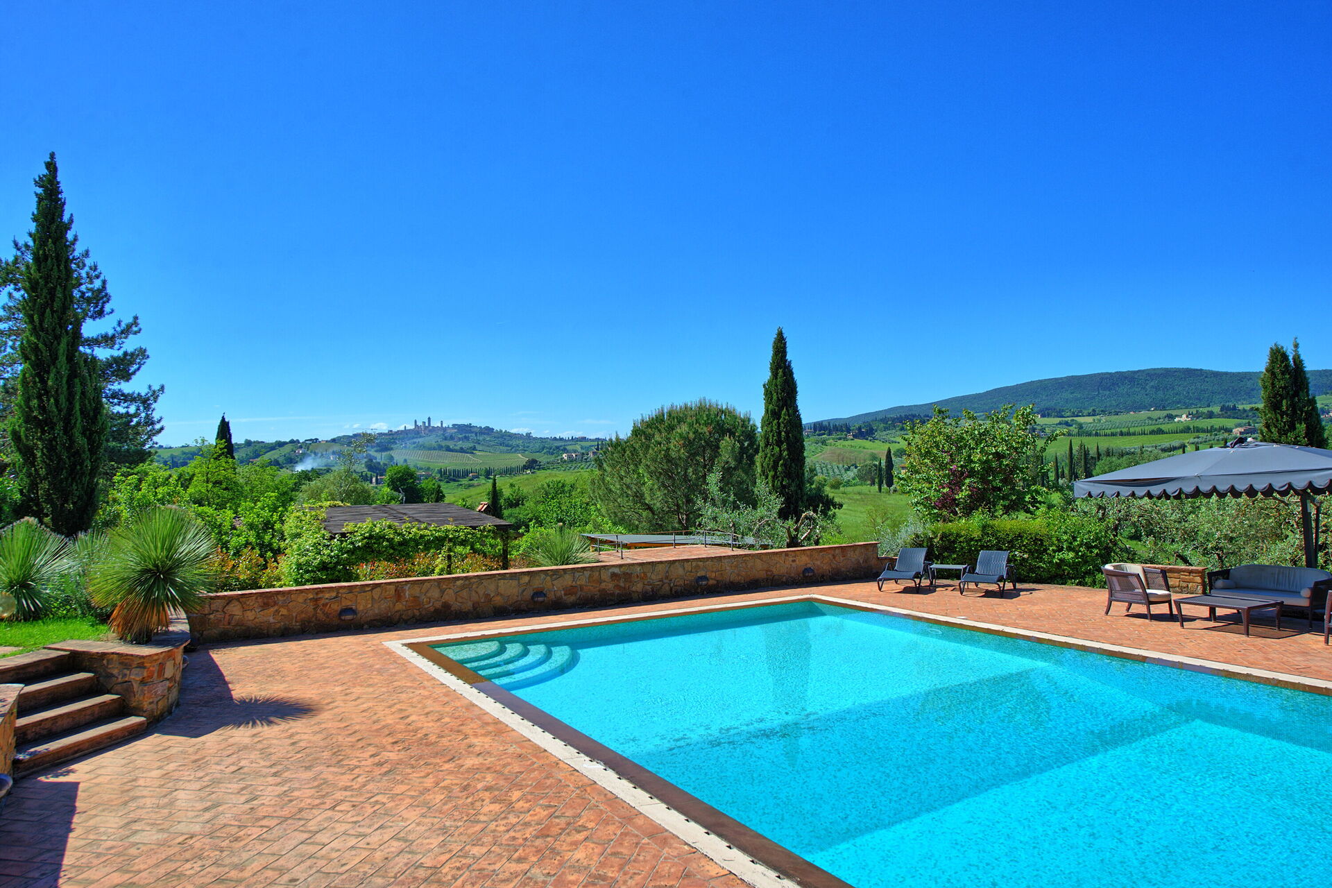 The pool sits in a large lawn, and overlooks the Tuscan hills and medieval towers of the historical city of San Gimignano. The pool is surrounded by a sunbathing area and lush garden.