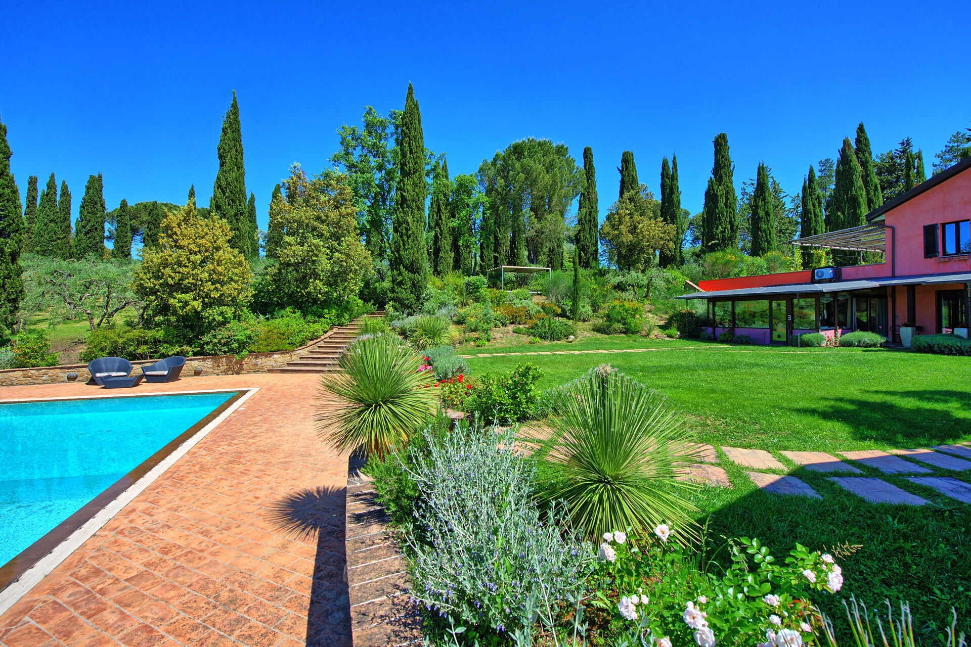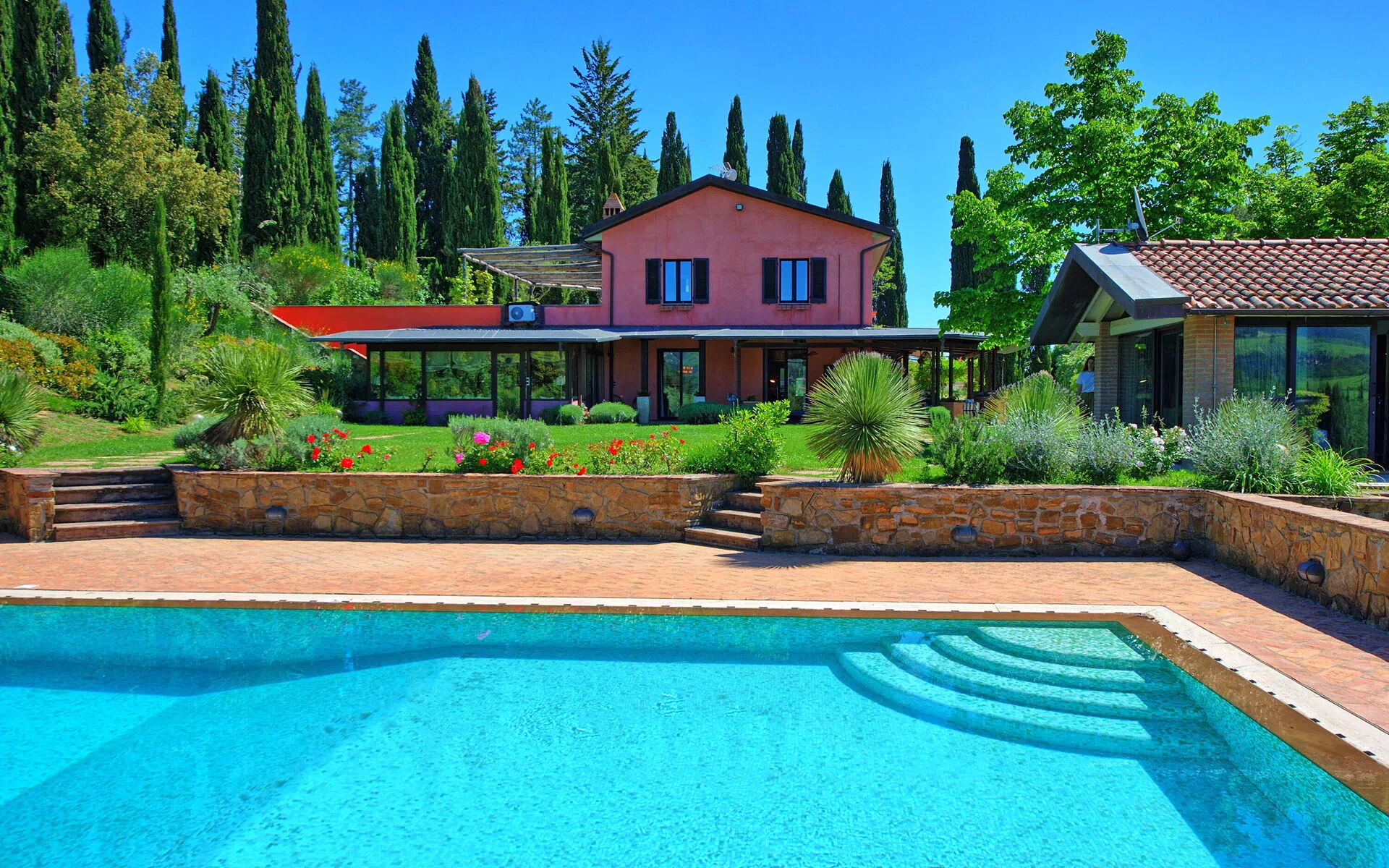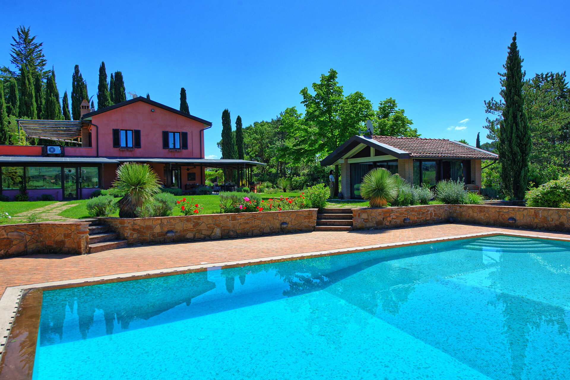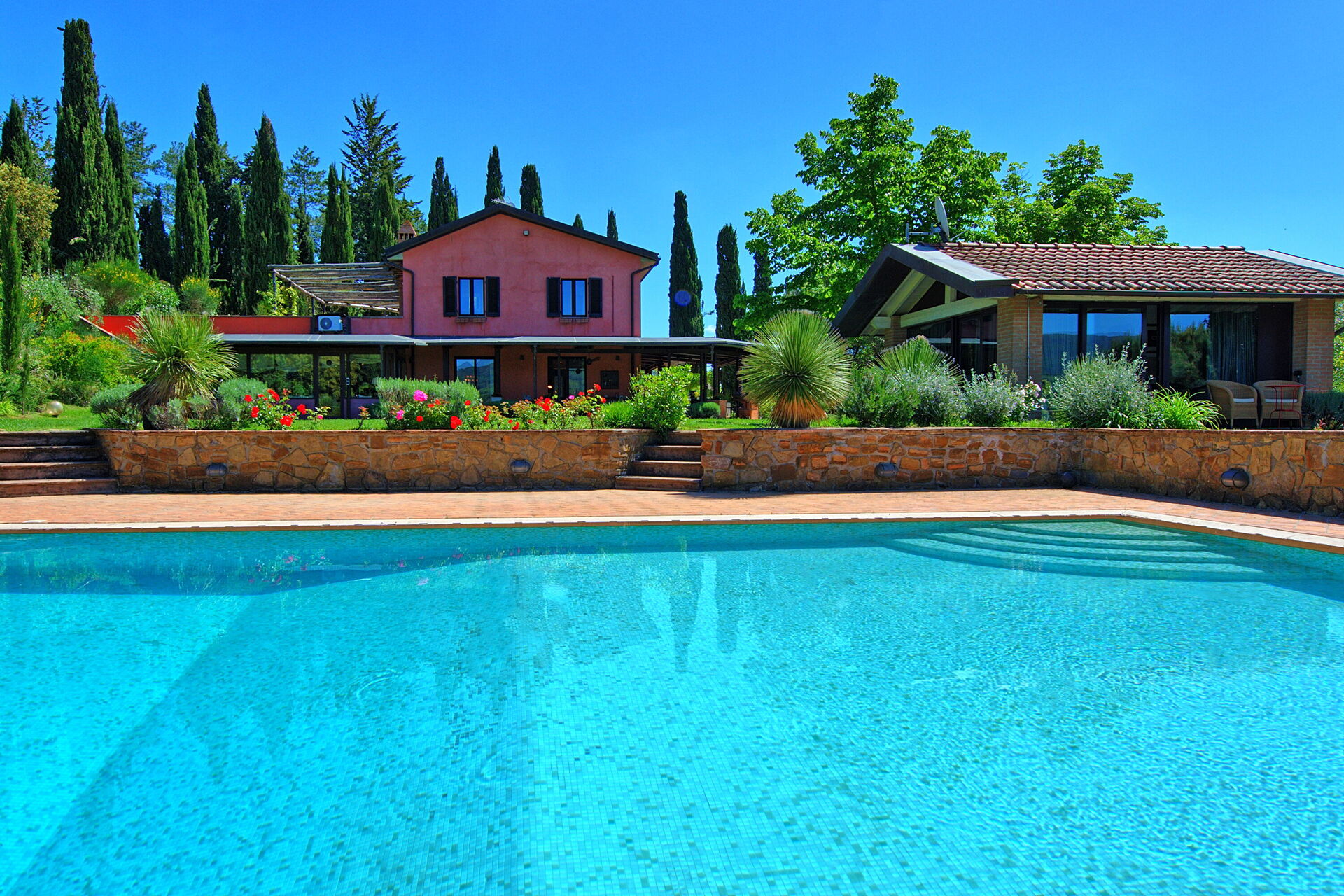 The pool sits in a large lawn, and overlooks the Tuscan hills and medieval towers of the historical city of San Gimignano. The pool is surrounded by a sunbathing area and lush garden.