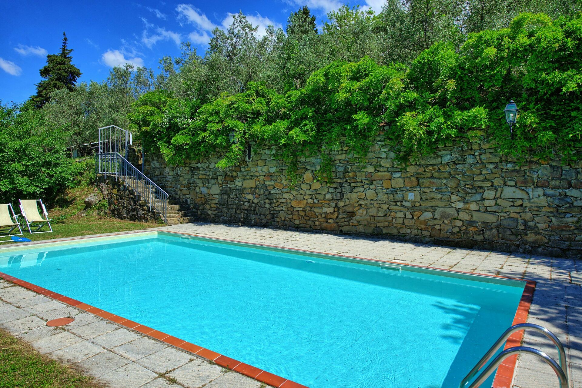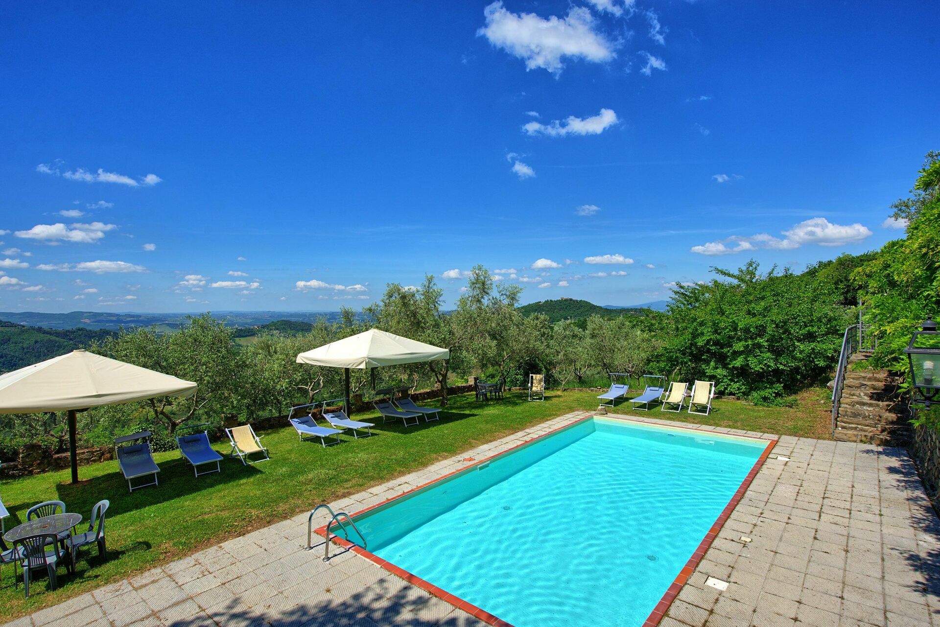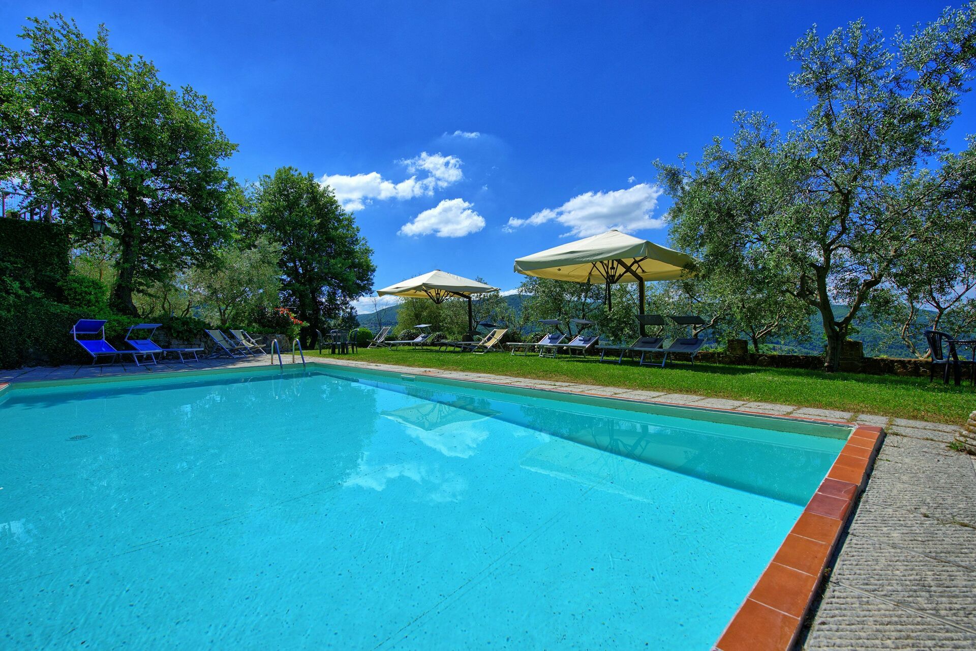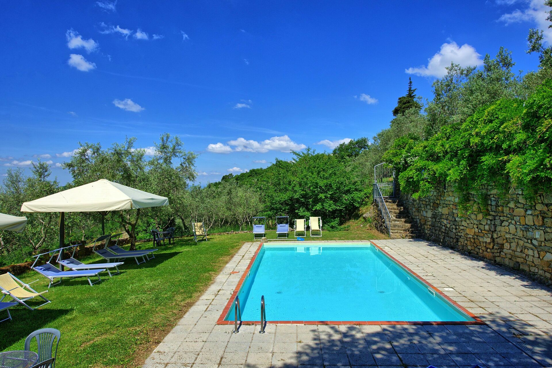 Surrounded by lush olive groves, Villa Panzalla provides a peaceful retreat where guests can take leisurely walks and immerse themselves in nature. The shared swimming pool, complete with sun loungers and umbrellas, is perfect for cooling off on warm summer days and relaxing with friends and family.