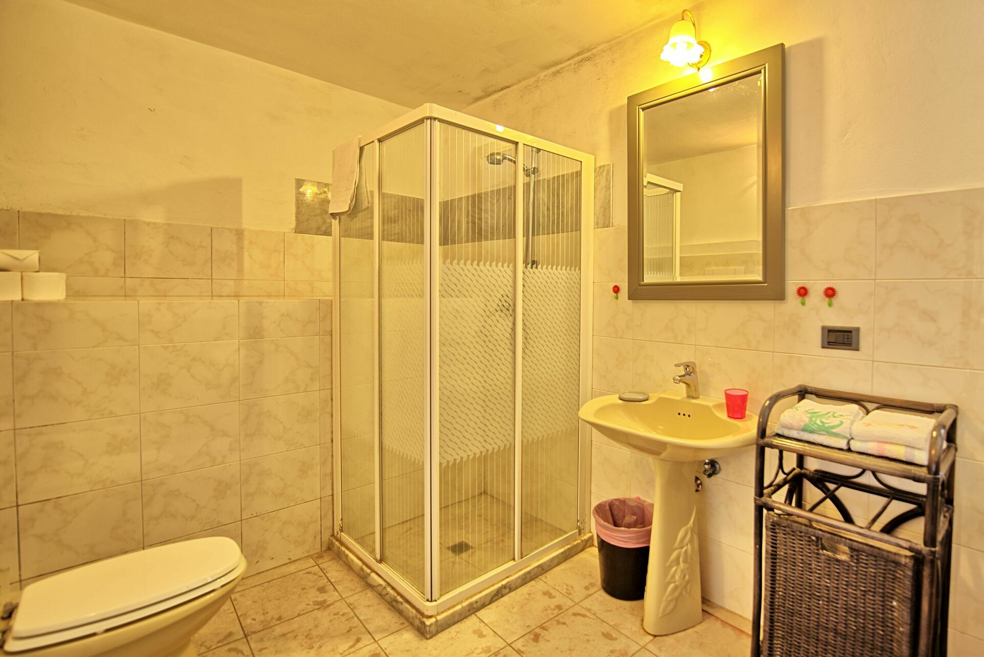 The apartment Fienile has a living room with fireplace, kitchenette (complete with an oven and a dishwasher), 4 double bedrooms, and 2 bathrooms with shower.