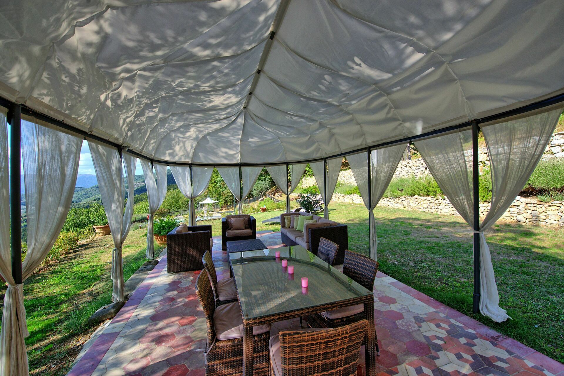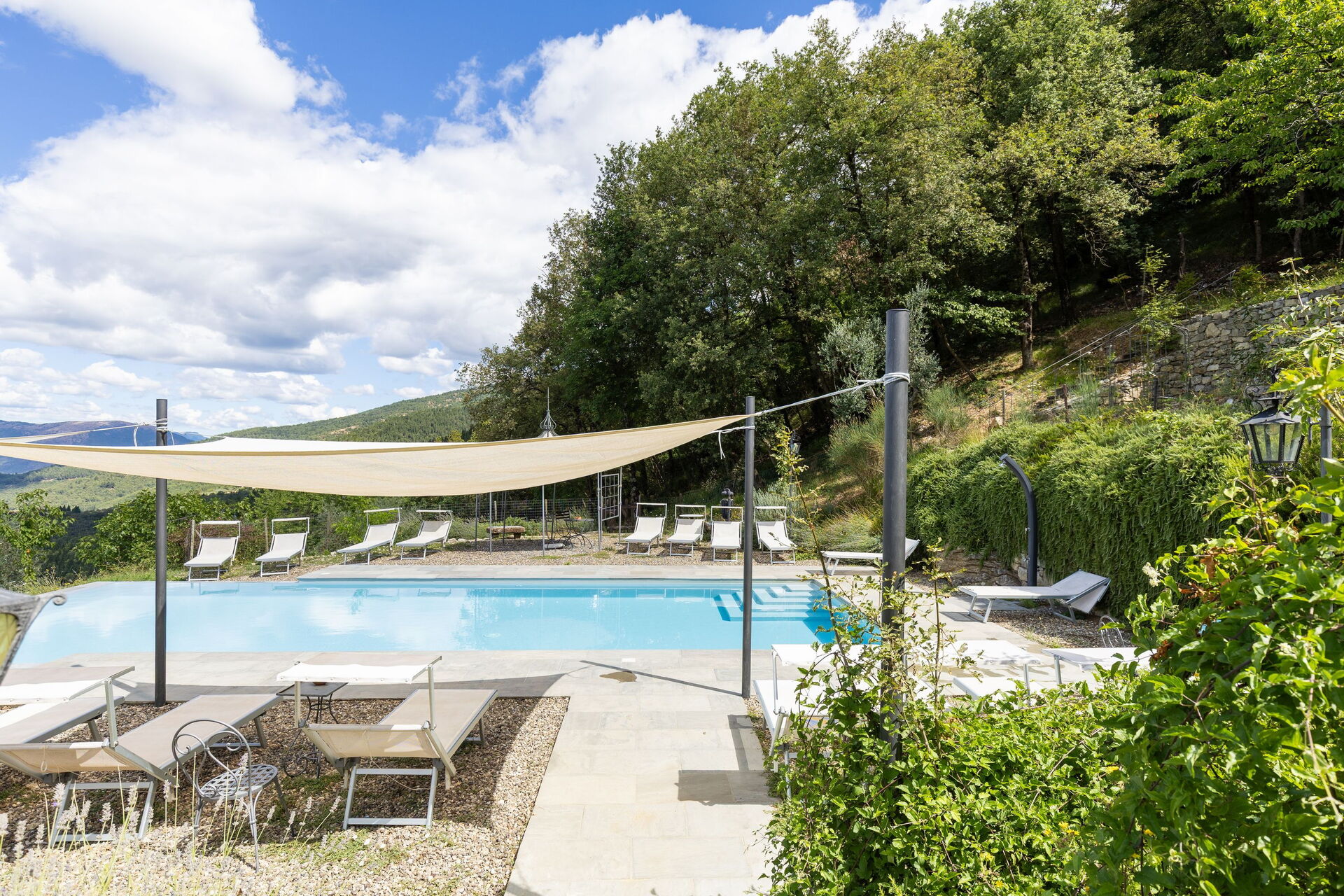 The first time Daniele showed us the garden my jaw was permanently fixed to the ground because of it's beauty. Rolling hills of greenery and the distant shimmer of the nearest town in the distance make for a stunning view, of which the sunset is spectacular. Considering the villa sleeps 17 people, you're never short of somewhere to sit. Comfy sun loungers overlook the swimming pool and the view and then there's a shaded area with comfy sofas and heavenly white linen swaying in the breeze!
