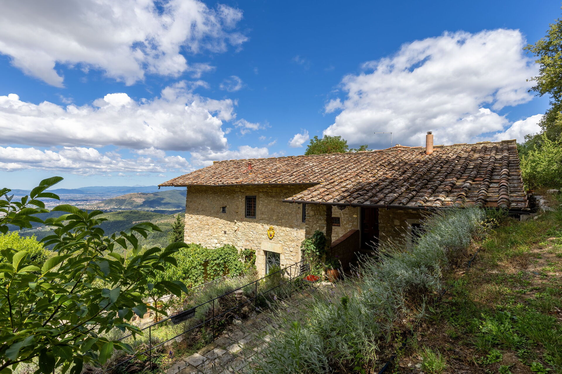Beautiful stone farmhouse dating back to the 13th century, formerly used as a convent, located in a very quiet and panoramic position on the slopes of Mount Morello from which one can enjoy a wonderful view over the valley of Florence (about 10 km away). The property is entirely fenced off and it is surrounded by 82.000 square meters of land with fruit trees, aromatic plants, pastures and woods of oaks, firs, cypresses and olive trees.