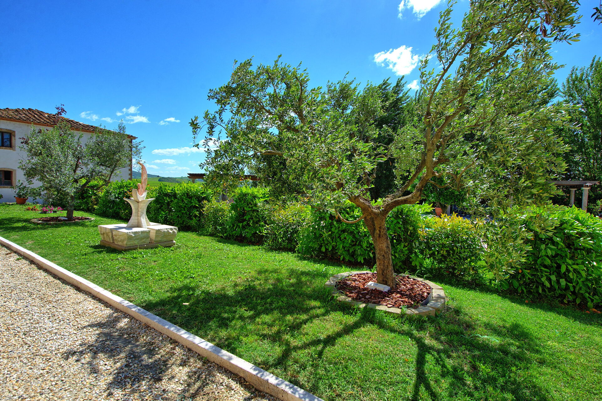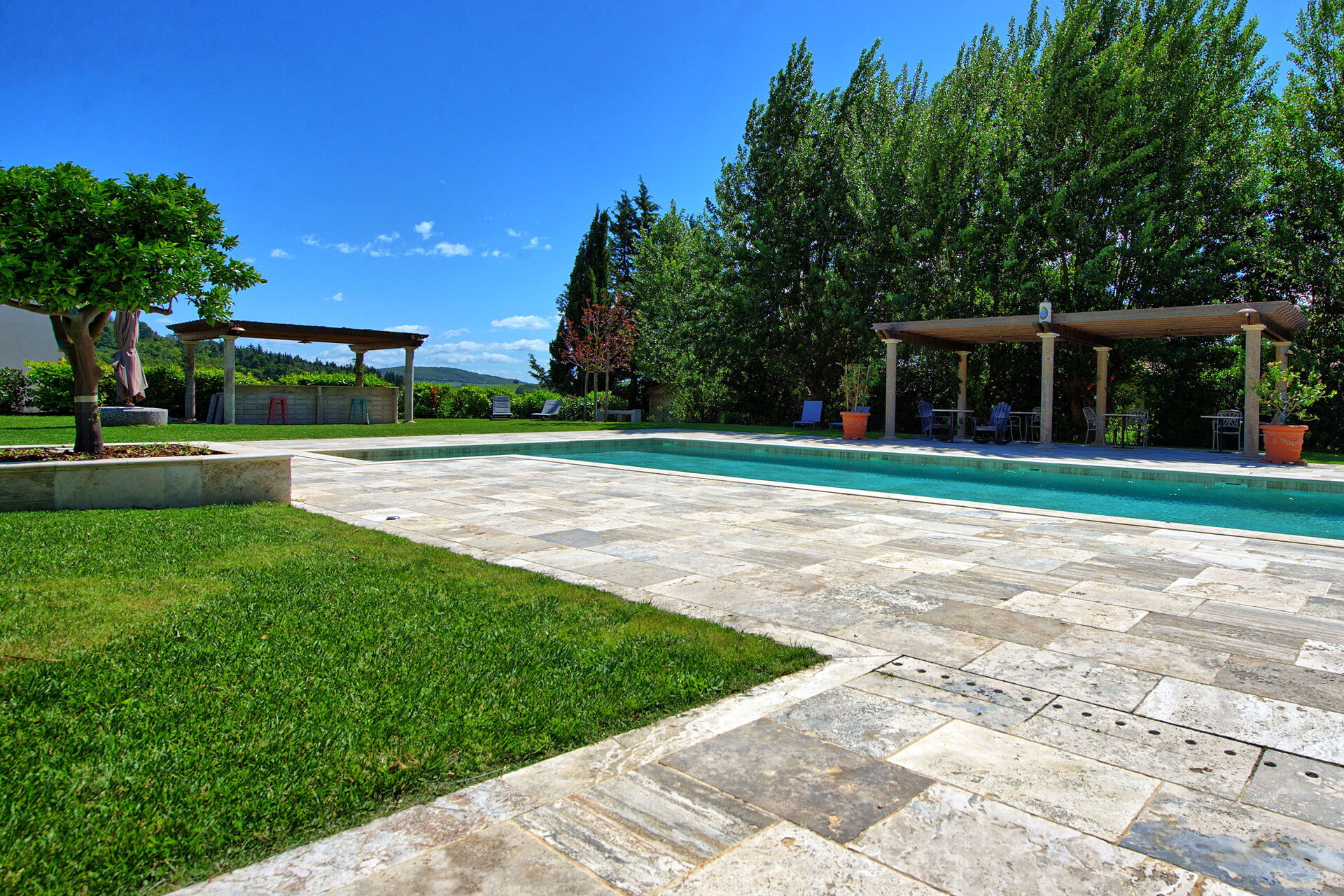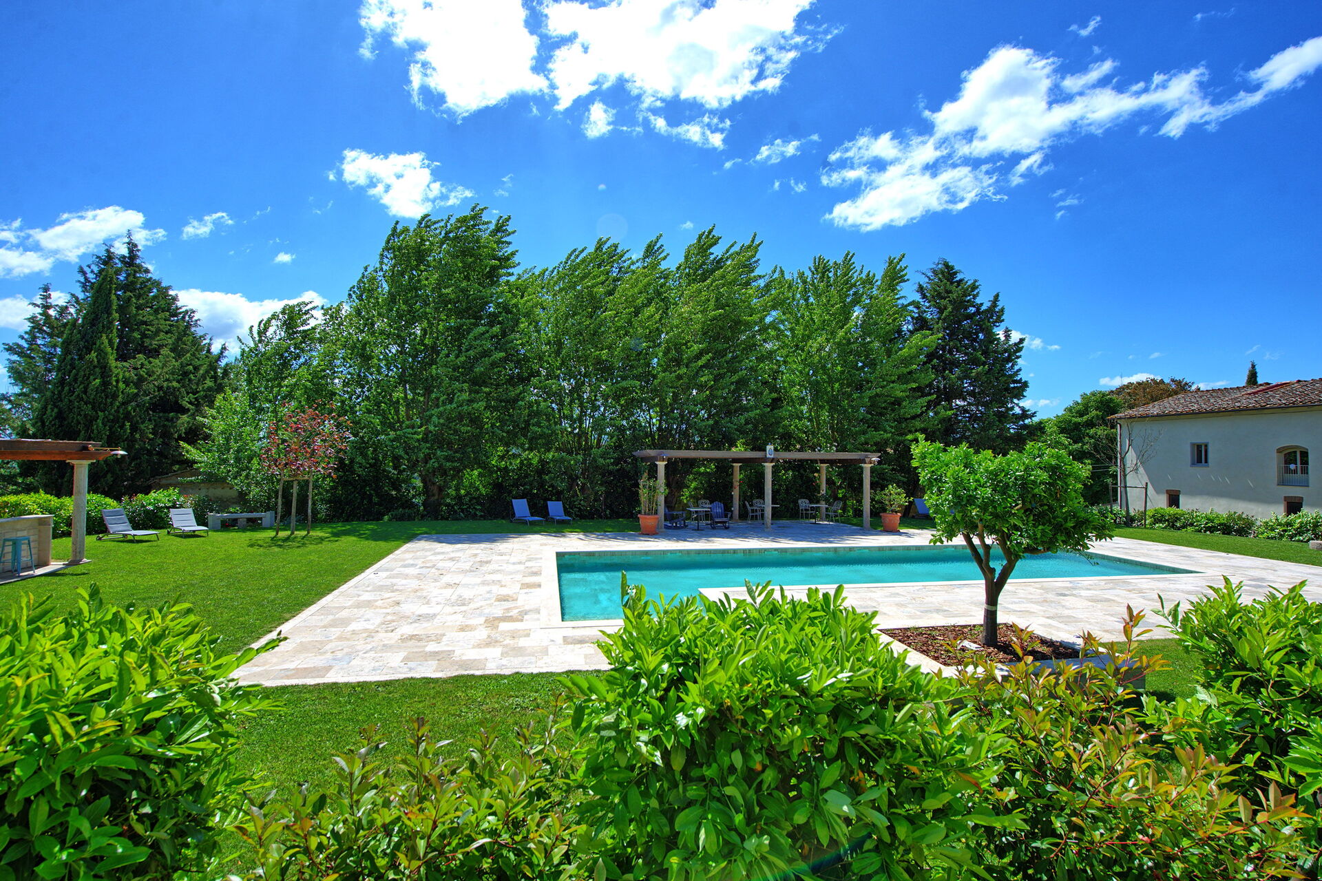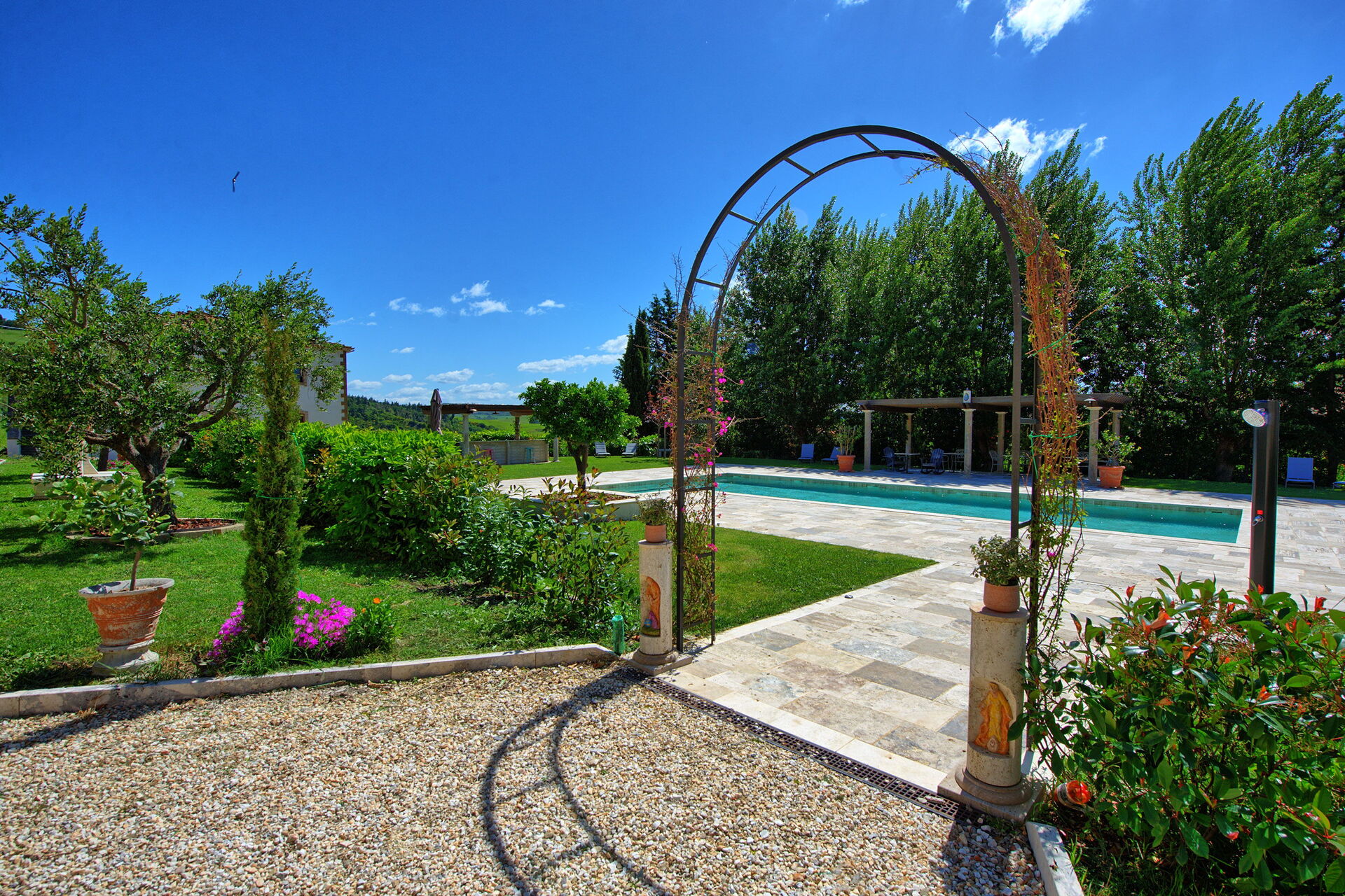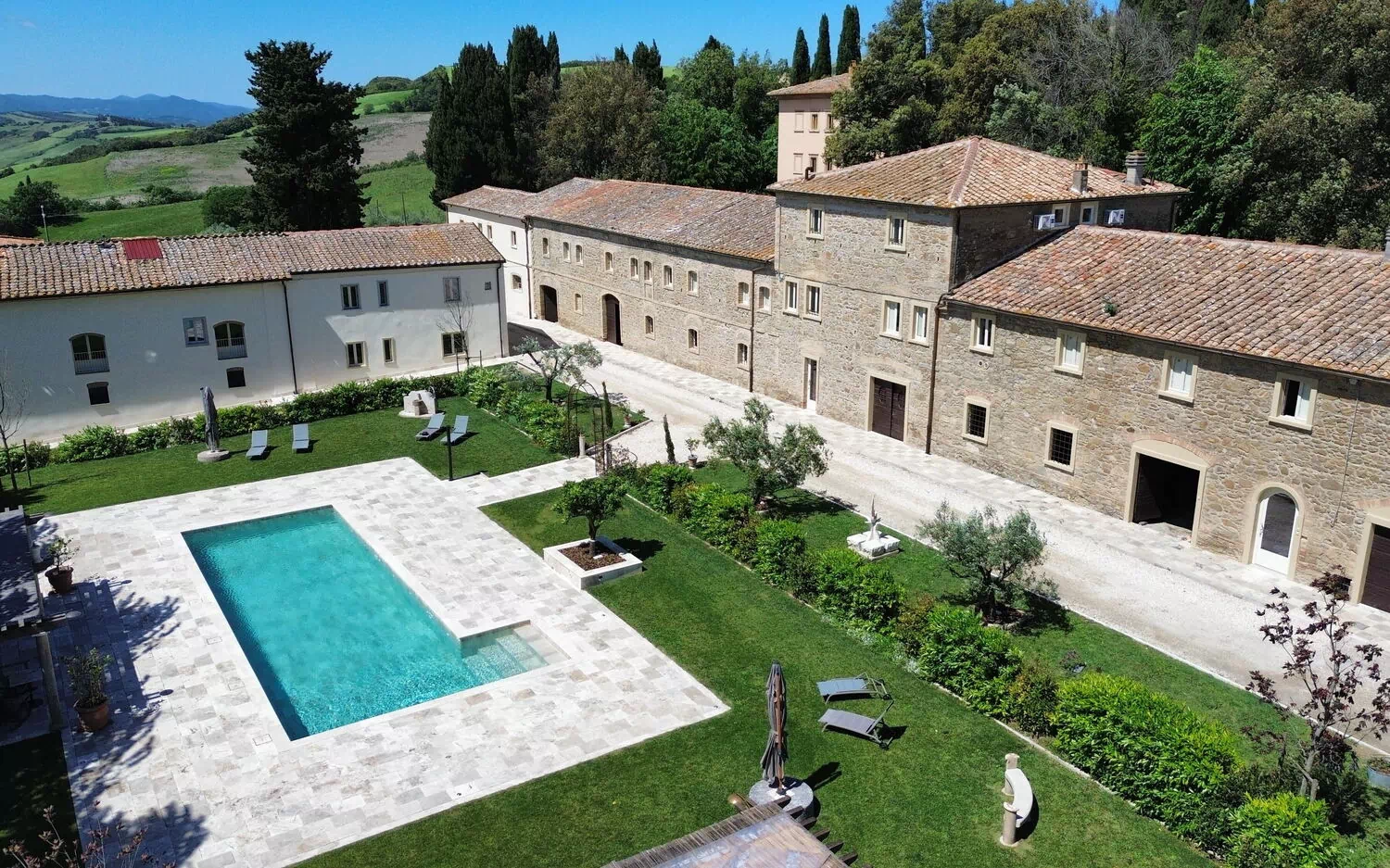 This exclusive retreat is nestled among the rolling hills of the Tuscan countryside, surrounded by olive groves and vineyards. The beautifully maintained garden boasts a lovely swimming pool, shared by guests of the property. The pool is bordered by a travertine sunbathing area, complete with sun loungers and umbrellas — the perfect spot to relax and cool off with family or friends on warm summer days.