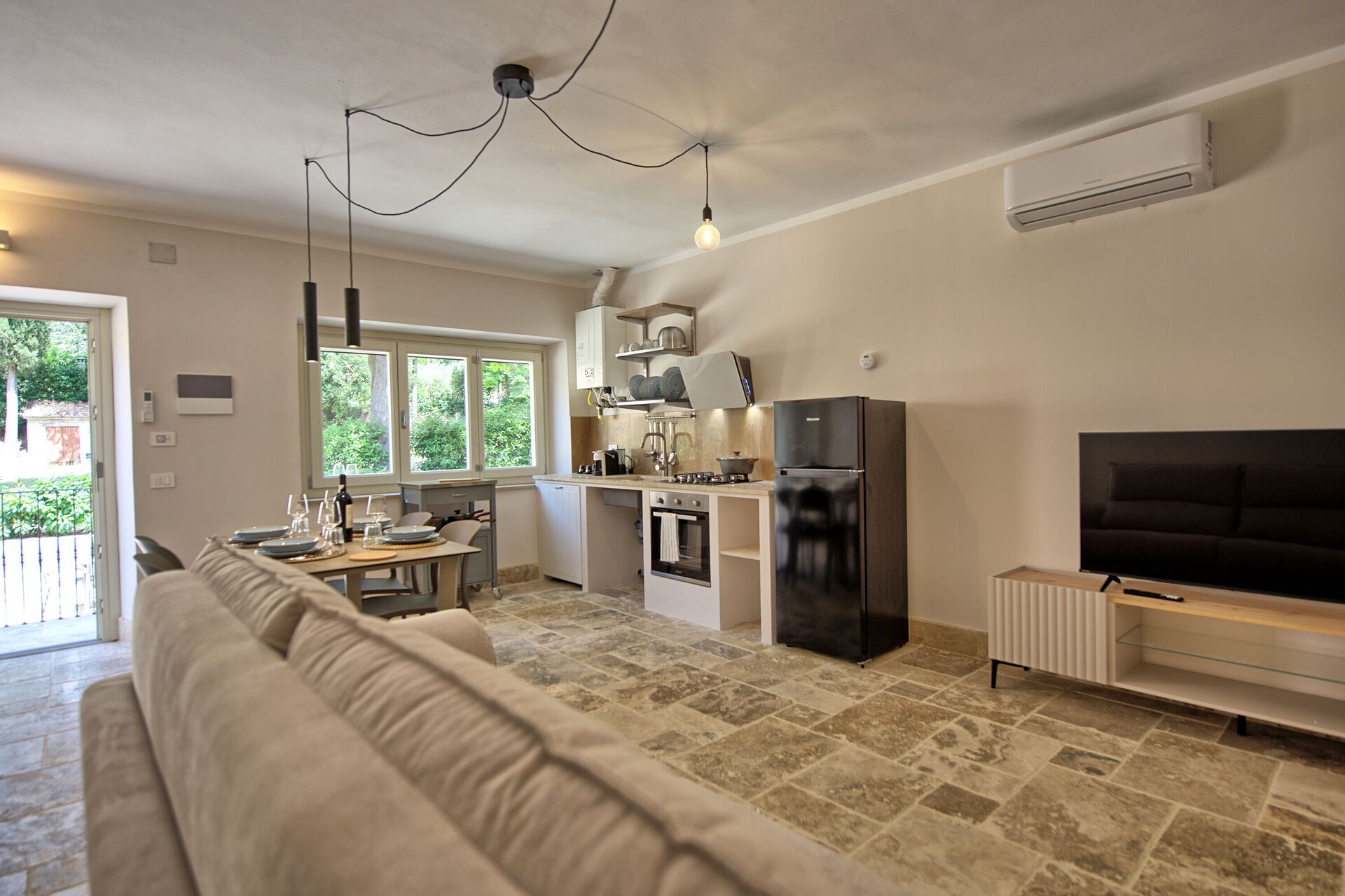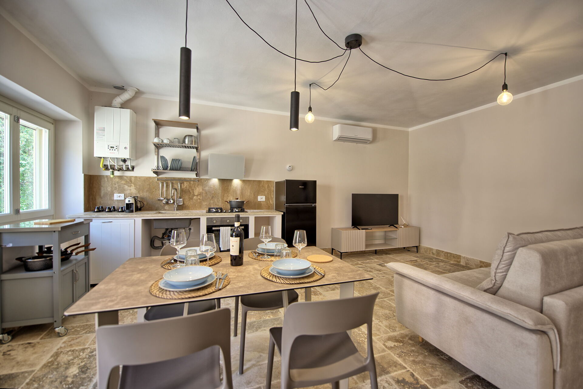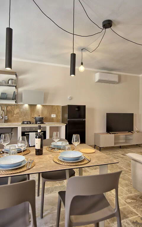 Raised ground floor: living room (smart TV, air conditioning) with double sofa bed, dining area and kitchenette (dishwasher, oven, refrigerator, espresso coffee maker, toaster), double bedroom (air conditioning), bathroom with shower.