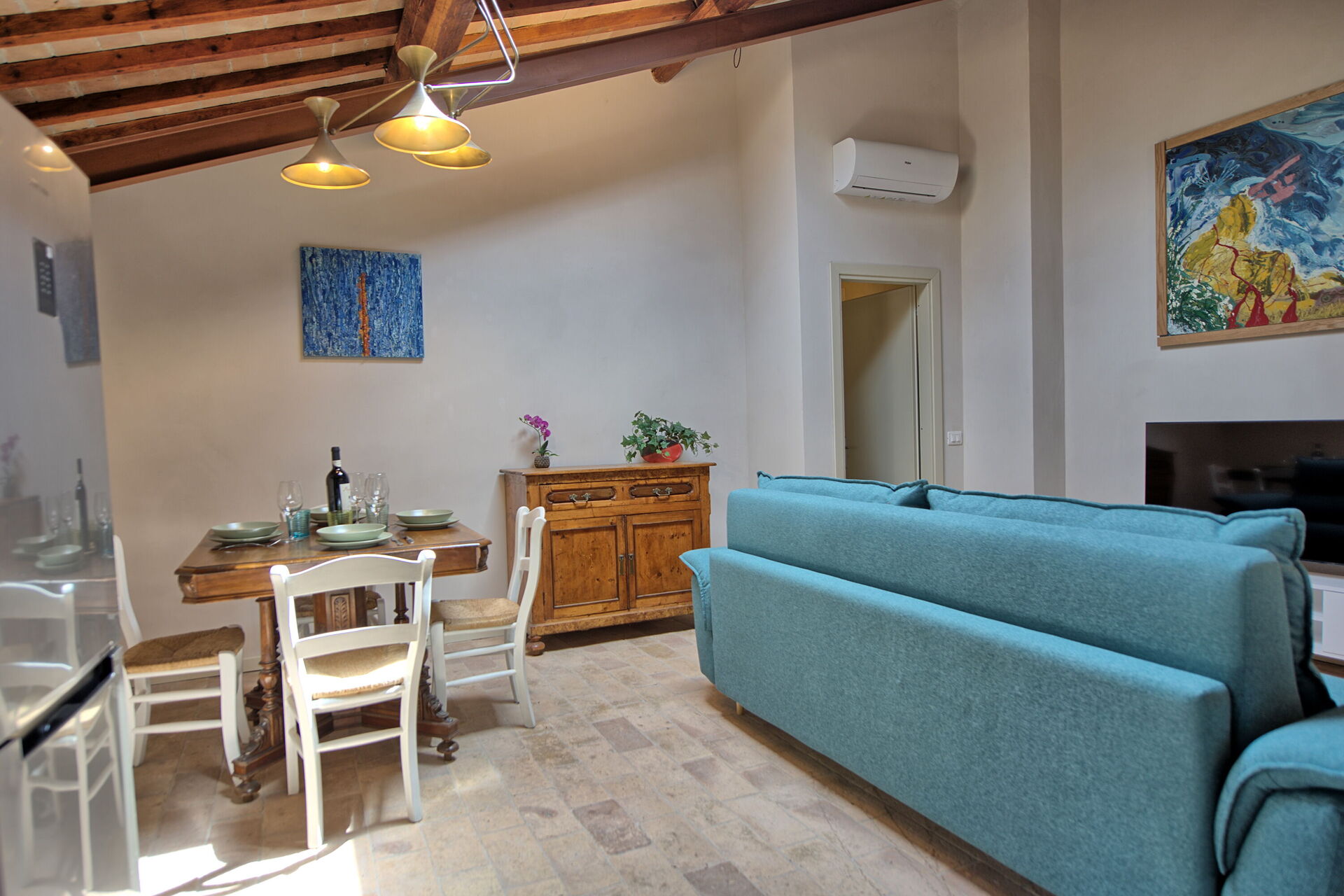 First floor: living room (smart TV, air conditioning) with double sofa bed, dining area and kitchenette (dishwasher, oven, refrigerator, espresso coffee maker, toaster), double bedroom (air conditioning), bathroom with shower.
