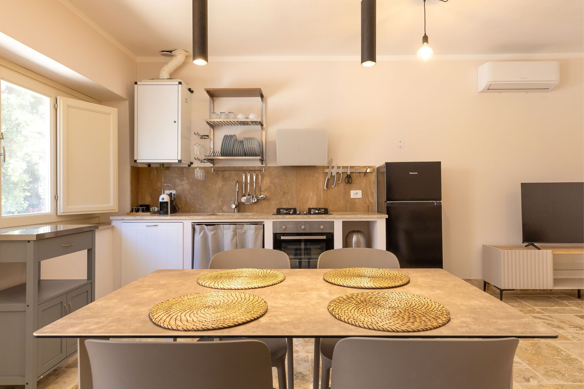 Raised ground floor: living room (smart TV, air conditioning) with double sofa bed, dining area and kitchenette (dishwasher, oven, refrigerator, espresso coffee maker, toaster), double bedroom (air conditioning), bathroom with shower.