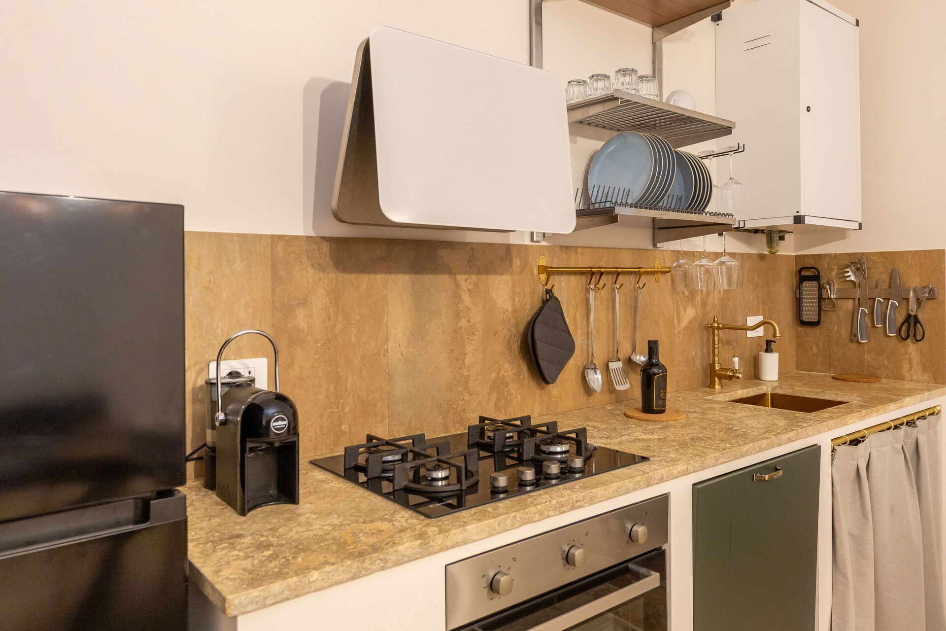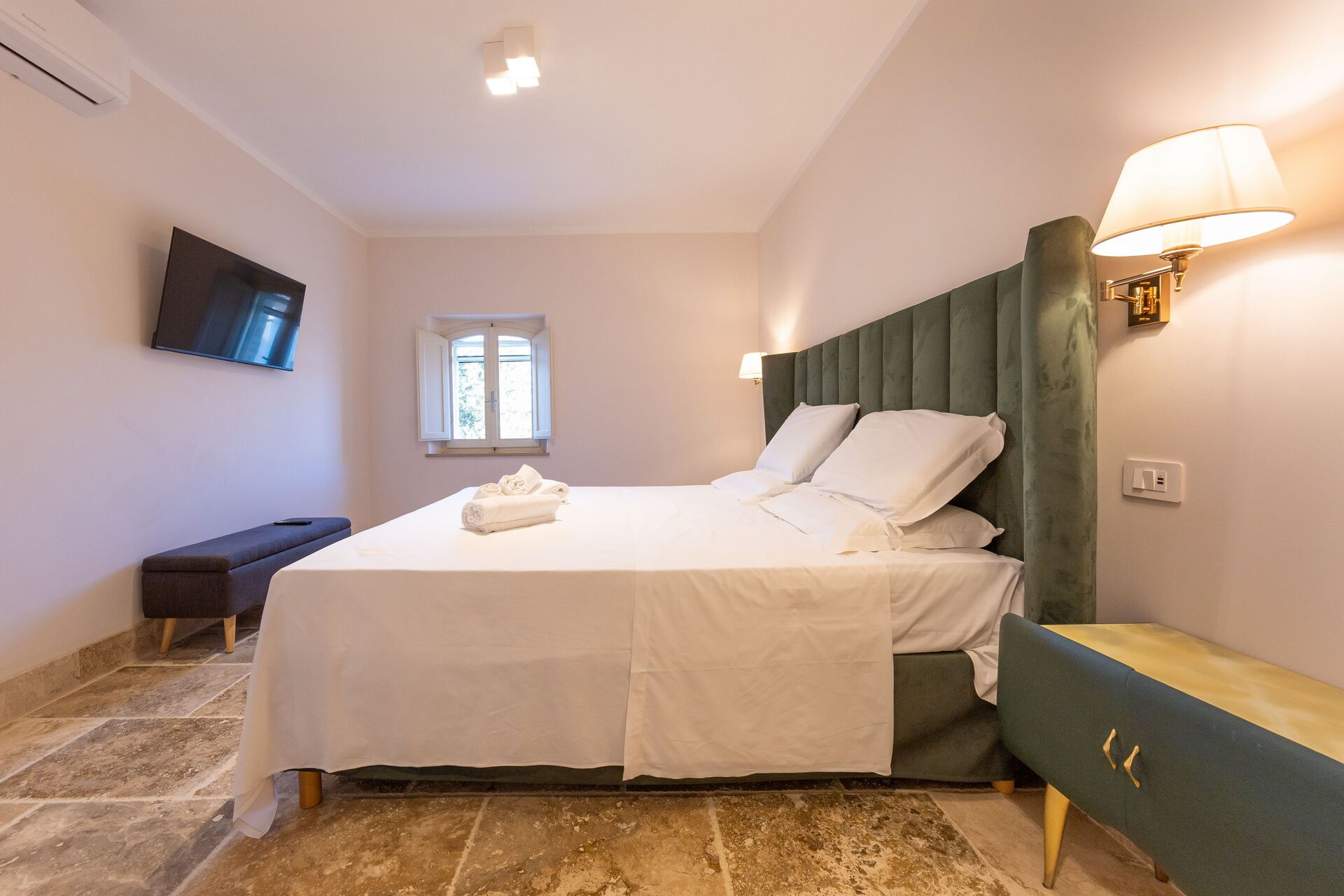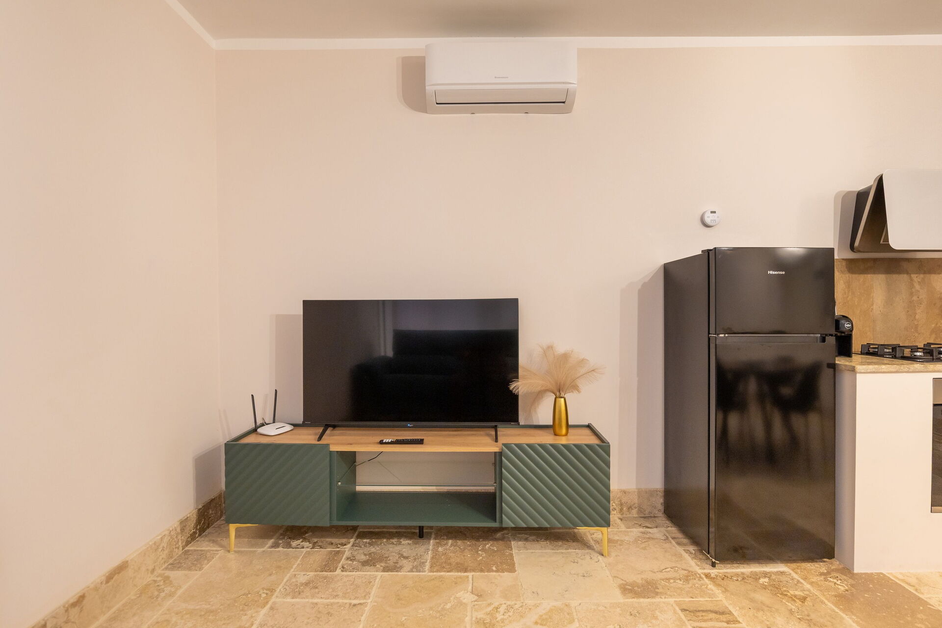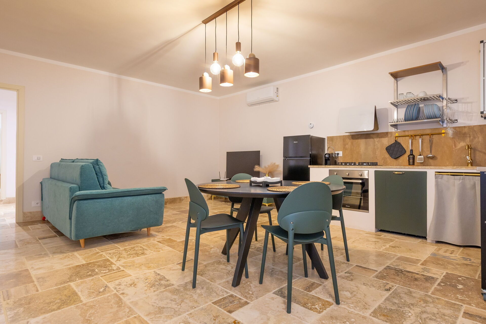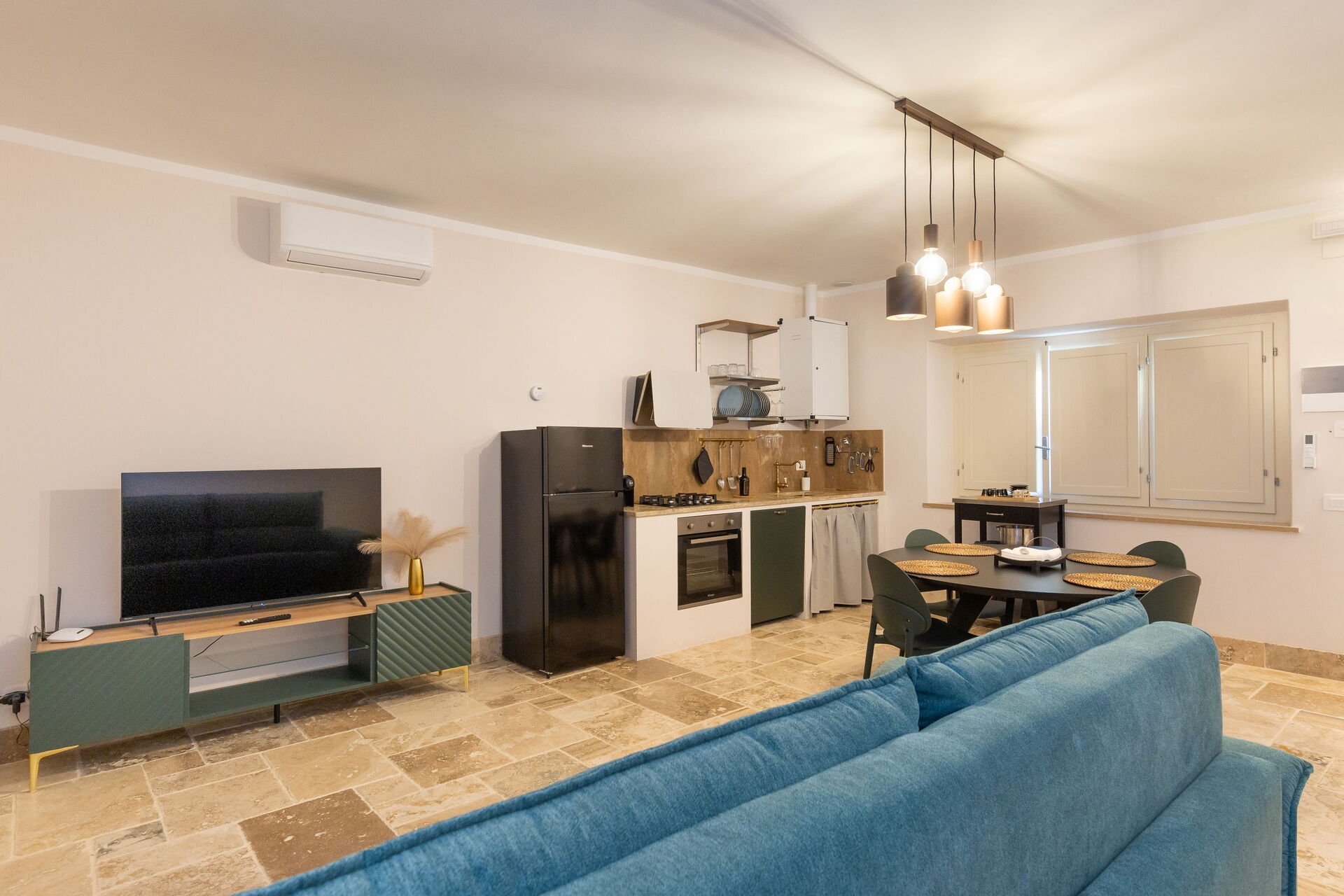 Raised ground floor: living room (smart TV, air conditioning) with double sofa bed, dining area and kitchenette (dishwasher, oven, refrigerator, espresso coffee maker, toaster), double bedroom (air conditioning), bathroom with shower.