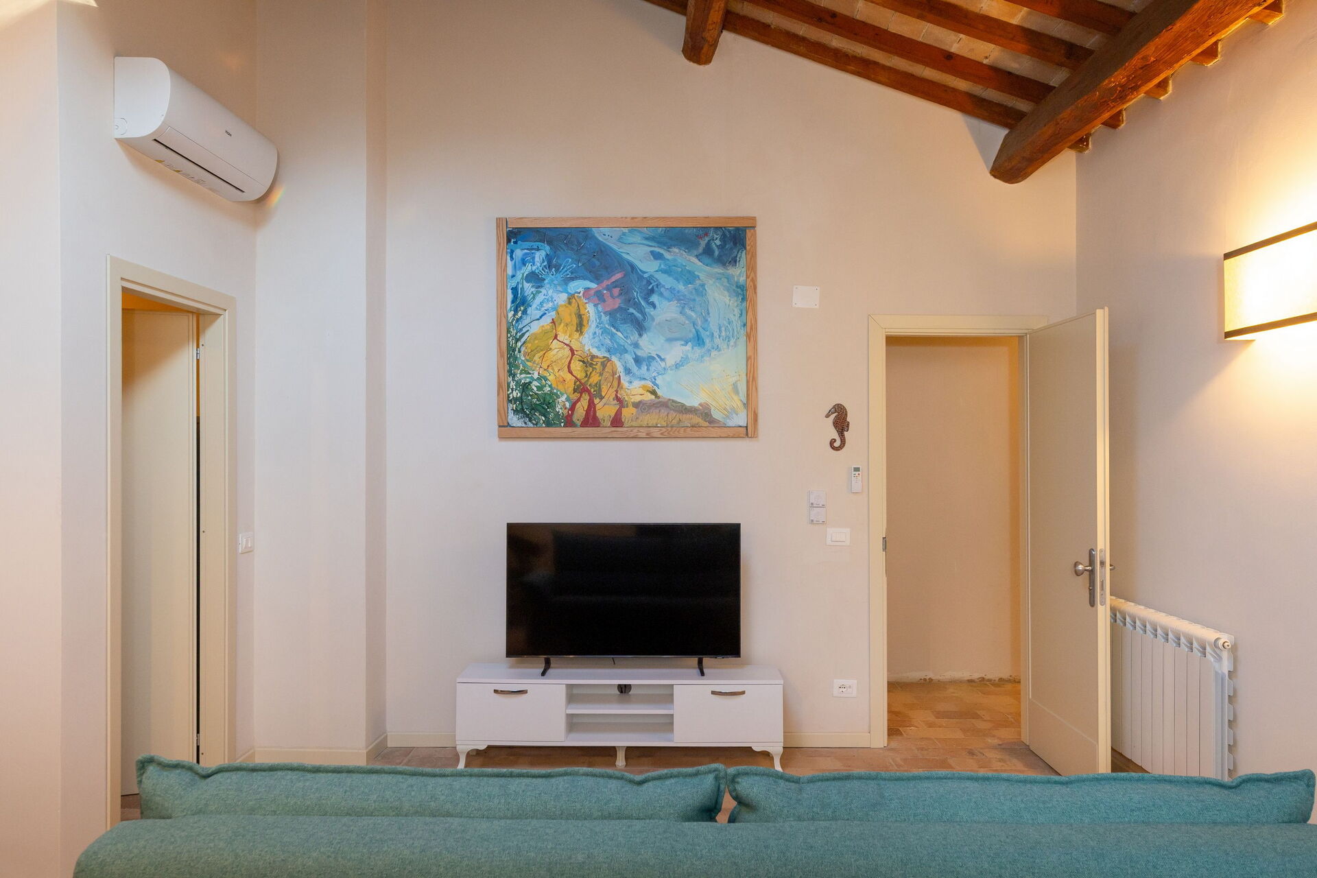 First floor: living room (smart TV, air conditioning) with double sofa bed, dining area and kitchenette (dishwasher, oven, refrigerator, espresso coffee maker, toaster), double bedroom (air conditioning), bathroom with shower.