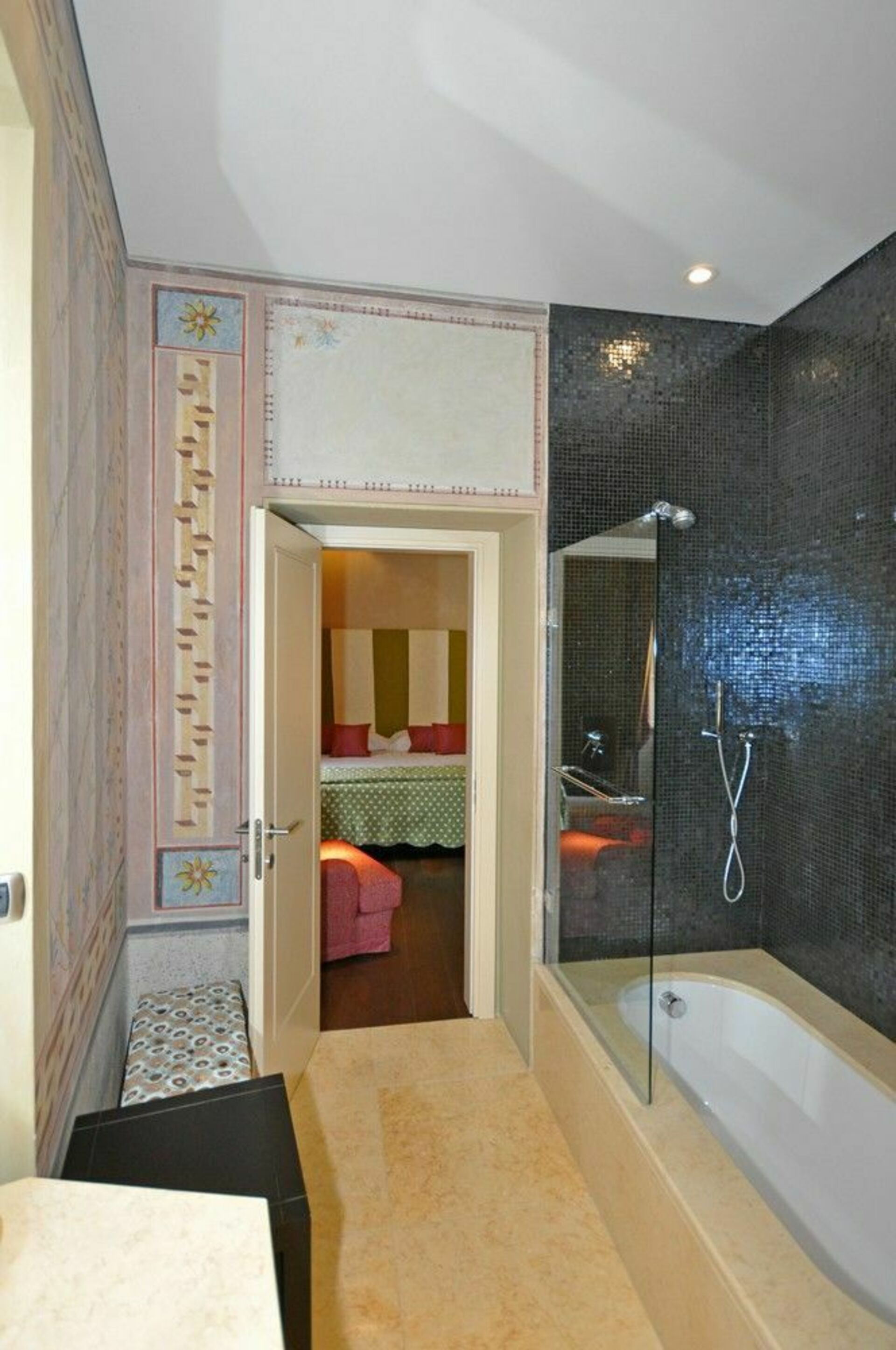 1st floor (also accessible via a lift): suite with living-room and double bedroom with ensuite bathroom with bathtub / shower, double bedroom with ensuite bathroom with bathtub / shower, double bedroom with ensuite bathroom with bathtub / shower, double bedroom with ensuite bathroom with shower, double bedroom with ensuite bathroom with bathtub, double bedroom with ensuite bathroom with shower, double bedroom with ensuite bathroom with bathtub and shower, double bedroom with ensuite bathroom with shower, kitchen corner with 2 electric hot plates, fridge and freezer, access on to a terrace, bedroom with French bed (also suitable for 2 adults) with ensuite bathroom with bathtub / shower (this room can be connected to the nearby double bedroom).