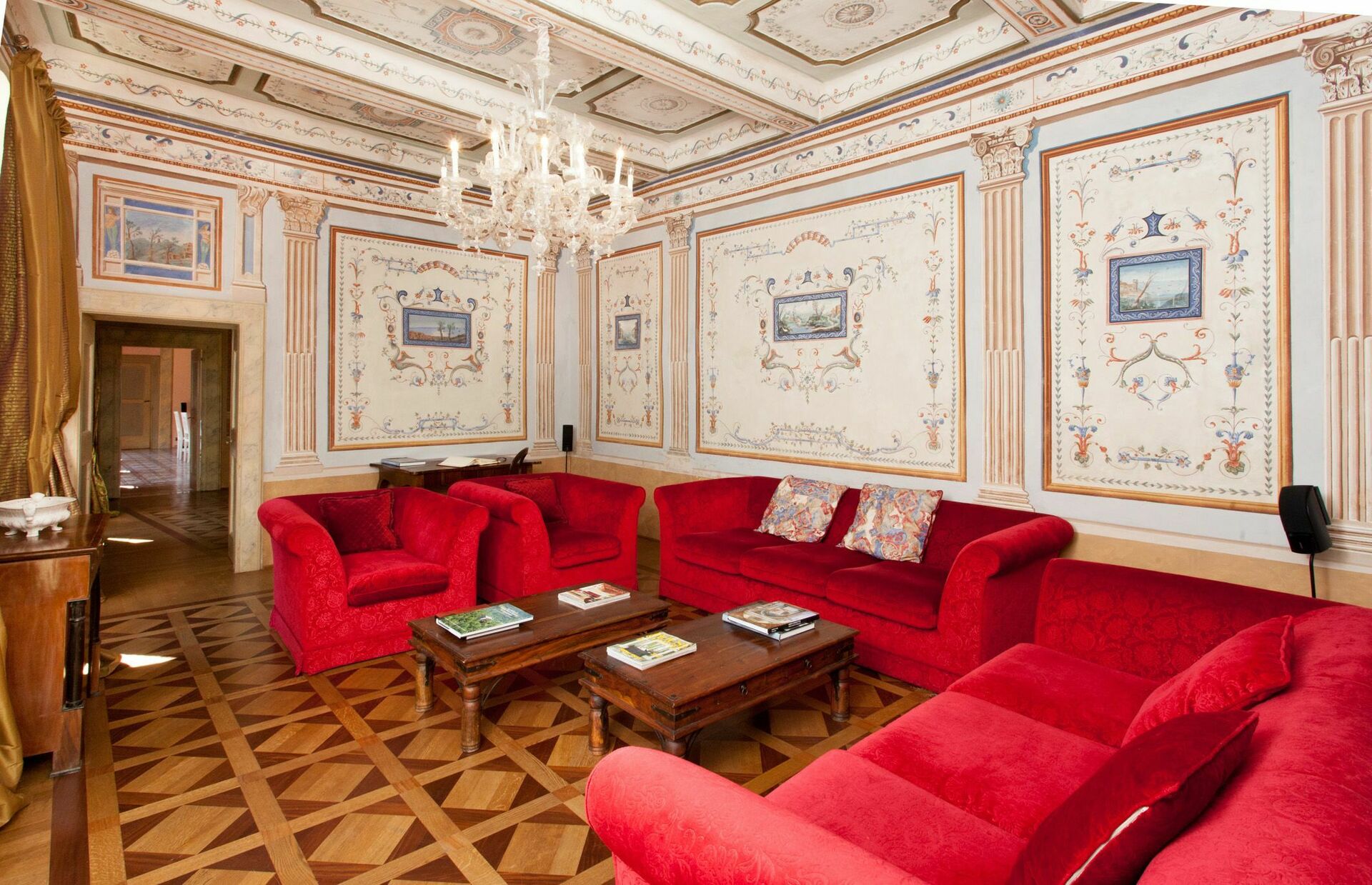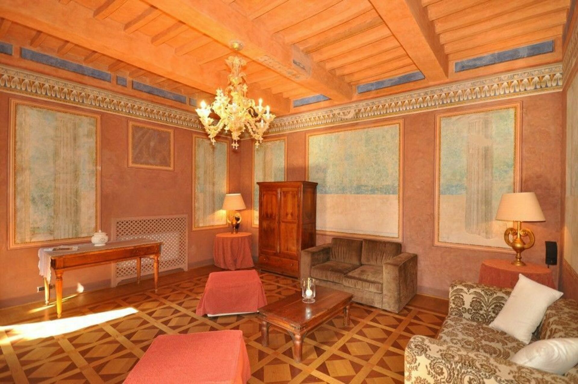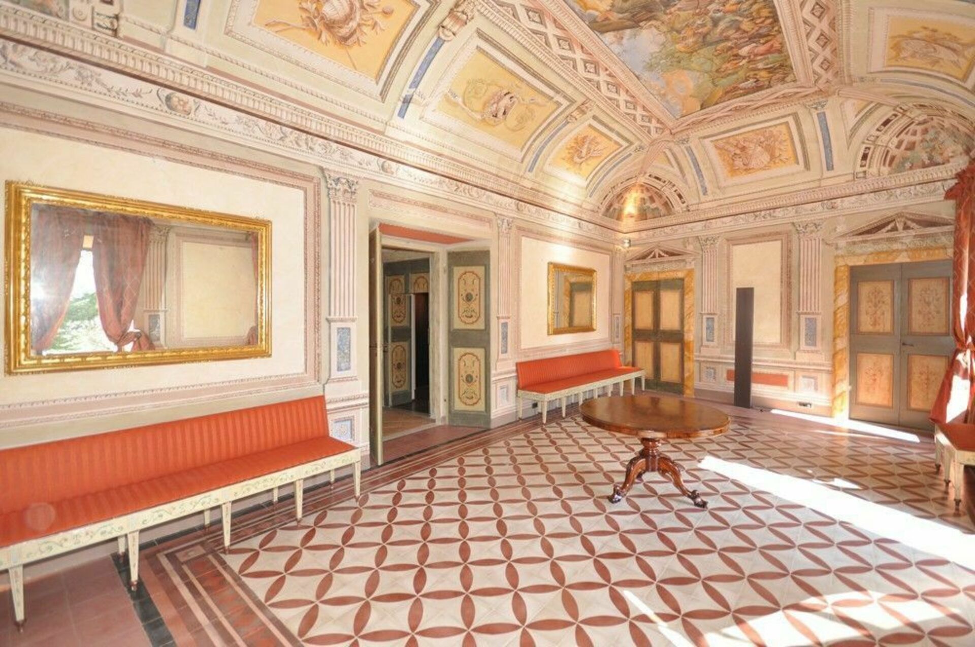 Ground floor: large, frescoed halls with 4 living-rooms (one with satellite TV), 2 toilets, dining-room, kitchen (fridge for drinks, Espresso coffee maker, oven, induction hob, dishwasher).