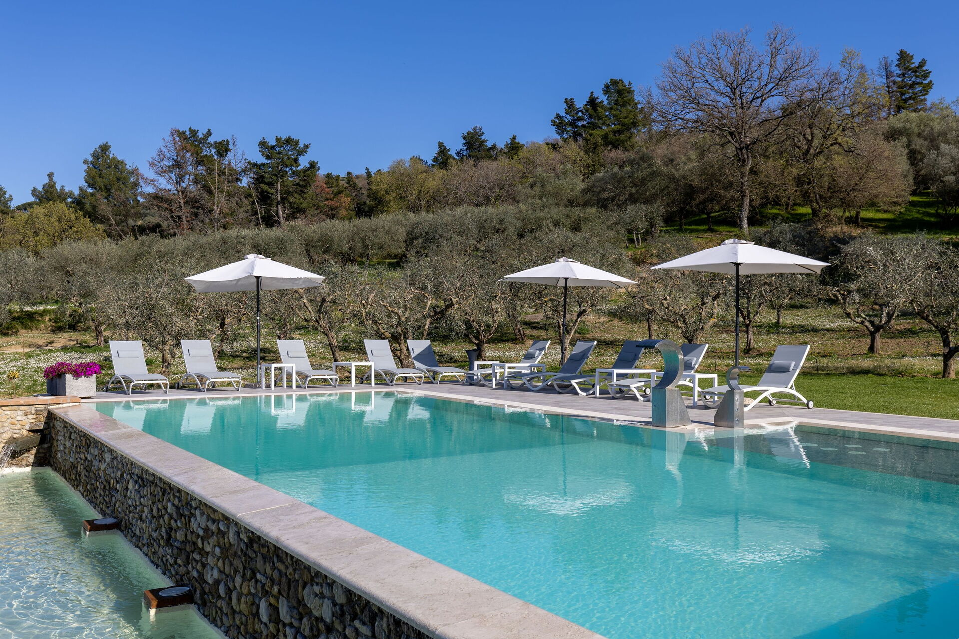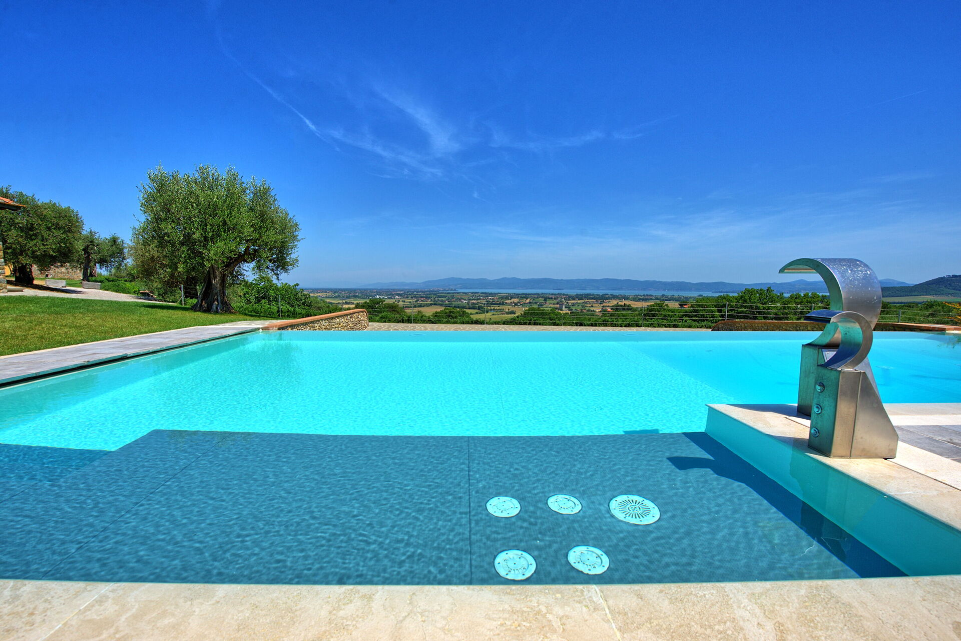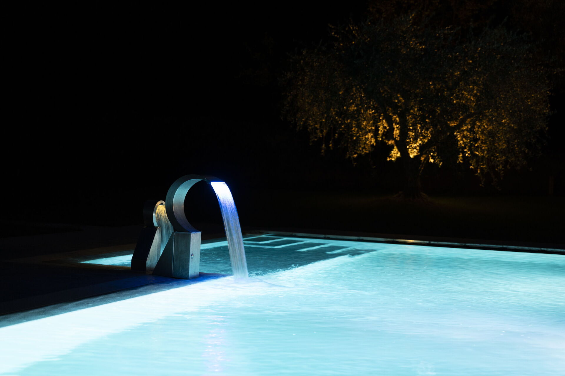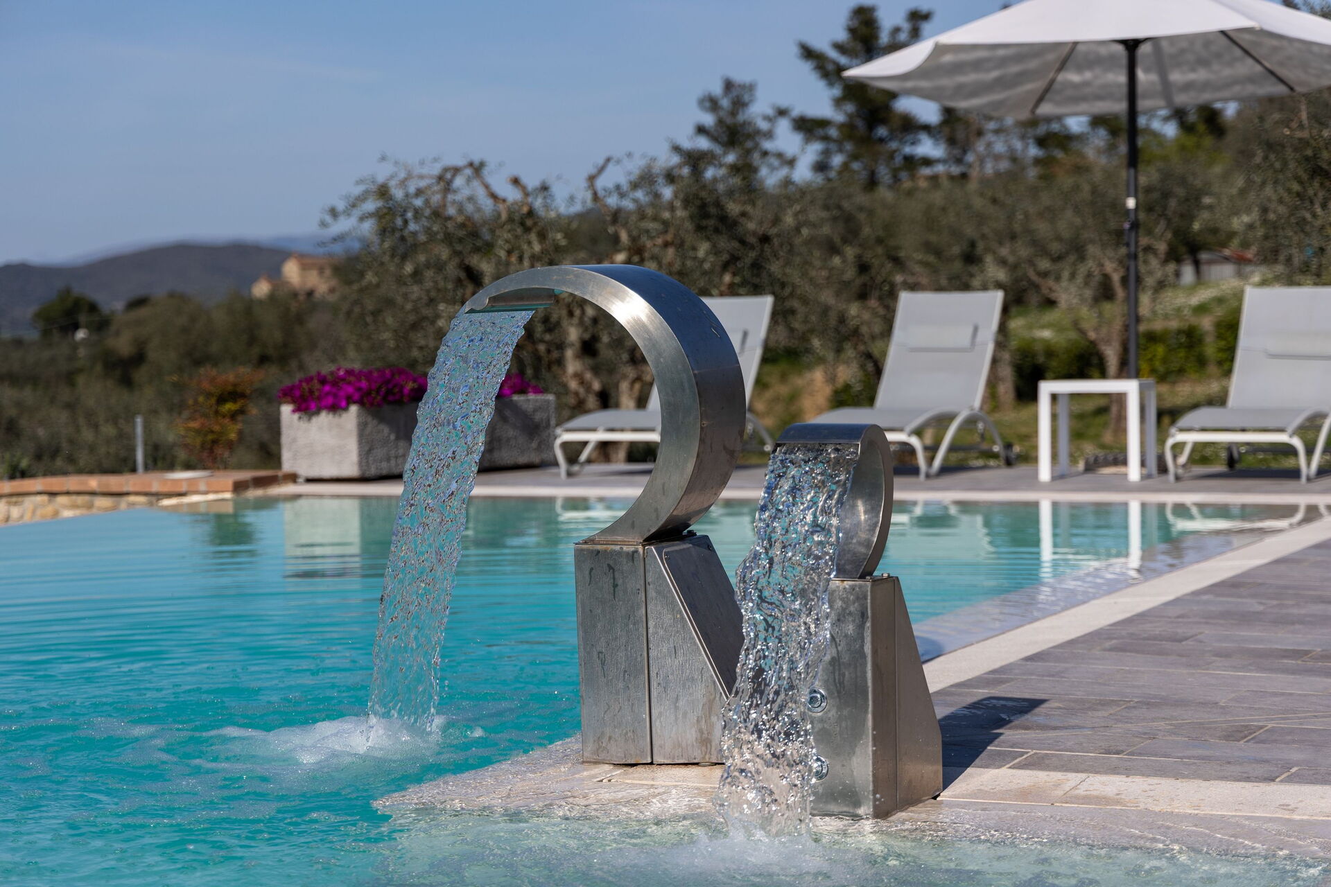 The pool at Villa Acquaviva deserves a special mention: it has sweeping panoramic views and a relaxation area with two waterfalls. Water overflows from the infinity edge into a shallow pool below with easy walk-in entry. This second pool is perfect for children. An automatic cover keeps the pool clean and maintains a pleasant temperature even in spring and autumn.