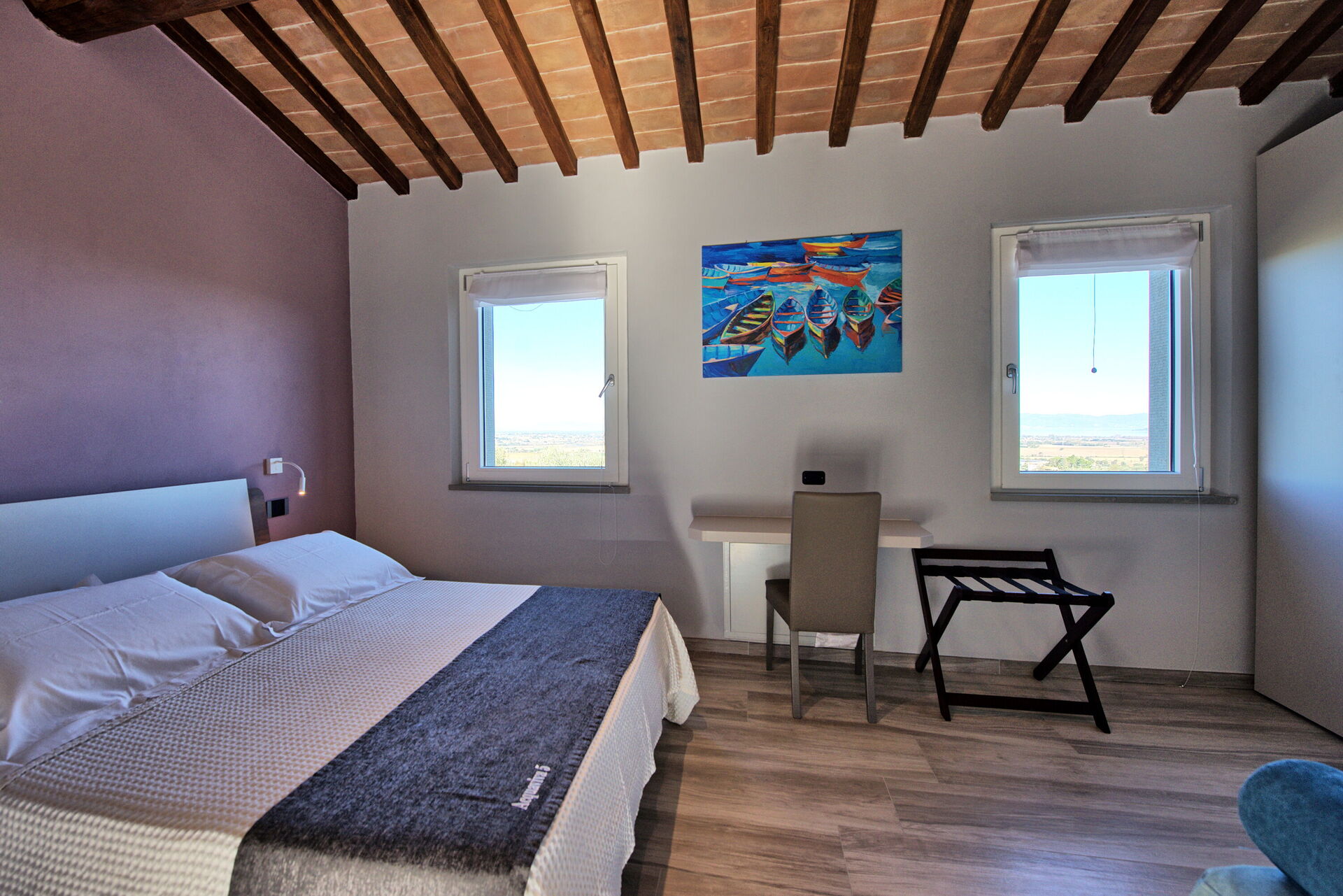 There is a large, scenic garden that looks out on charming Lake Trasimeno, with a beautiful pool for cooling off on hot summer days. Not only that, there is an outdoor space furnished for al fresco dining, with a barbecue, wood-burning oven, and panoramic views of Lake Trasimeno and the countryside.