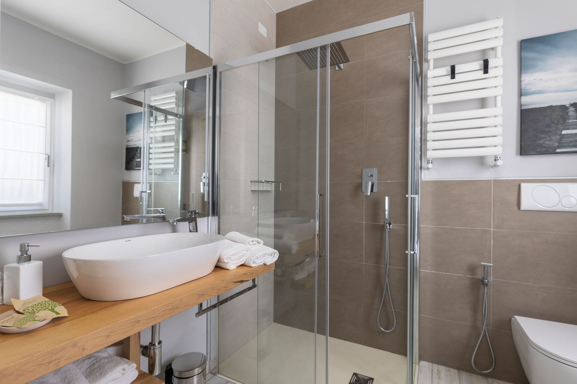 First floor: 2 double bedrooms, each with a private bathroom with shower; double bedroom (bed can be divided into 2 single beds upon request) with private bathroom with shower; bedroom with double bed and single bed with private bathroom with shower.