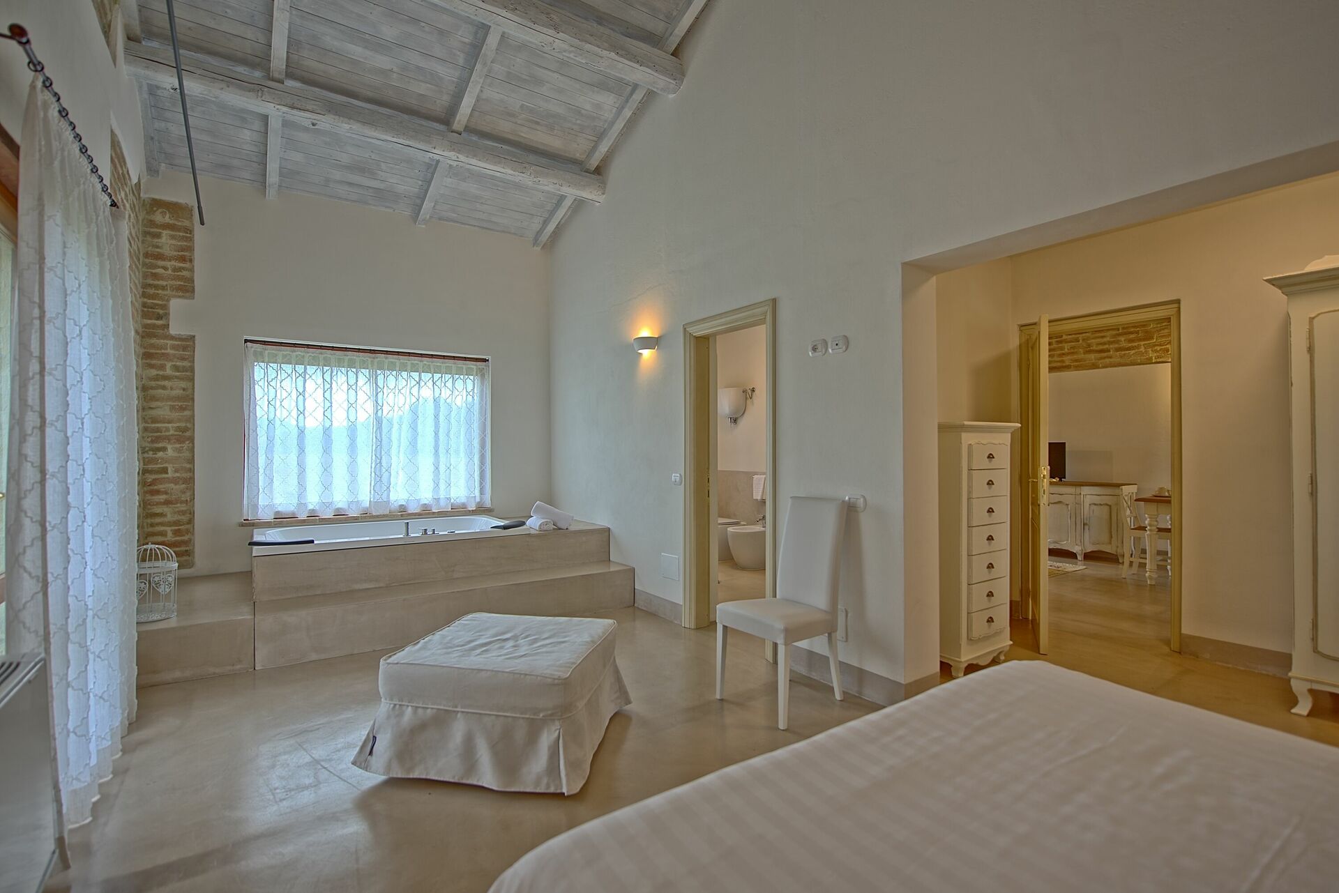 Ground floor: living area with double sofa bed and kitchen corner; suite with double bed and whirlpool tub in the bedroom, bathroom with shower equipped with steam bath and chromotherapy.
