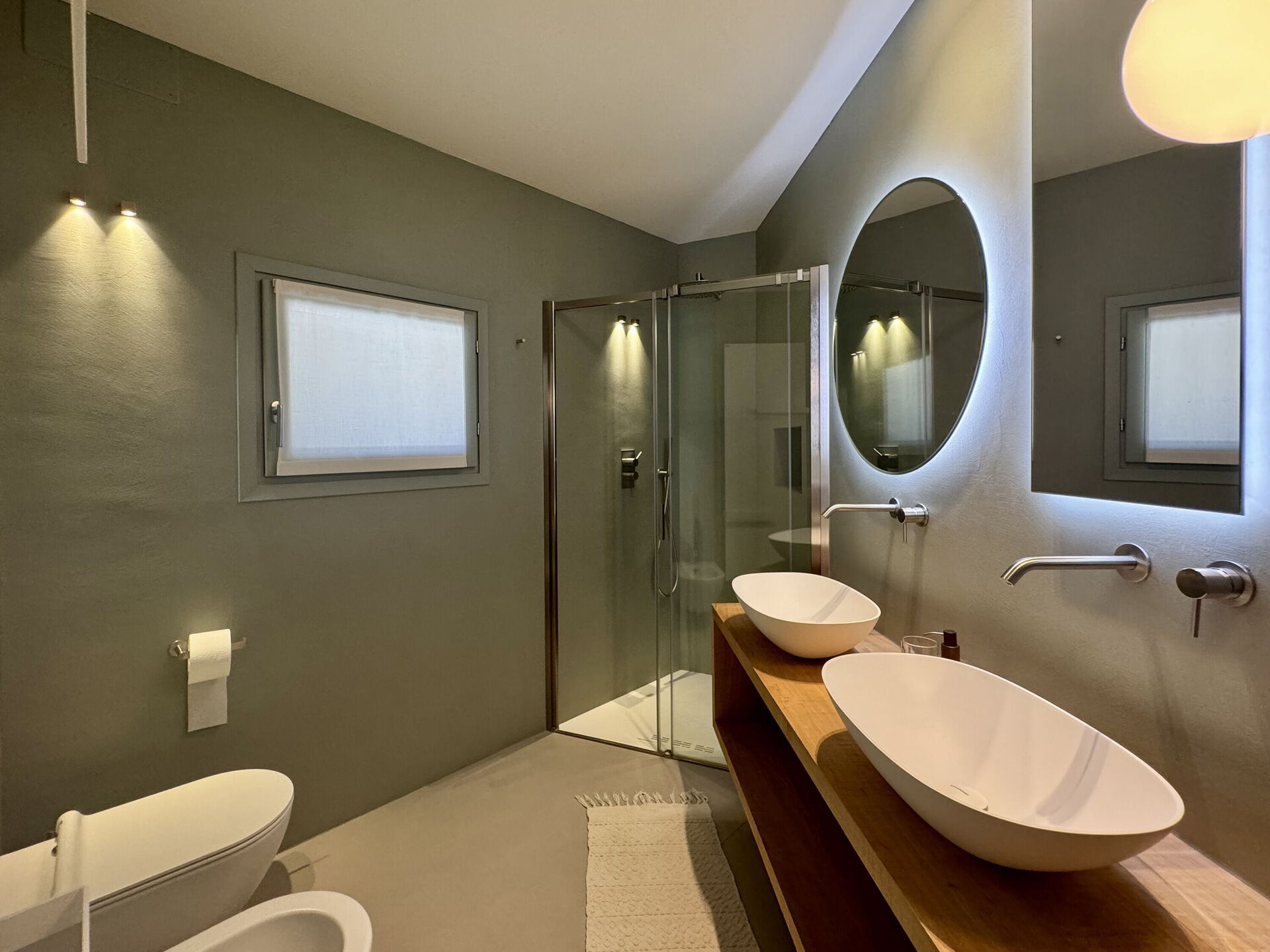 Ground floor: large entrance, kitchen (oven, freezer, fridge, dishwasher), dining table (for 4 persons) and access on to the outside, double bedroom with ensuite bathroom with shower (2 sinks) and access on to the outside, small bathroom with shower.