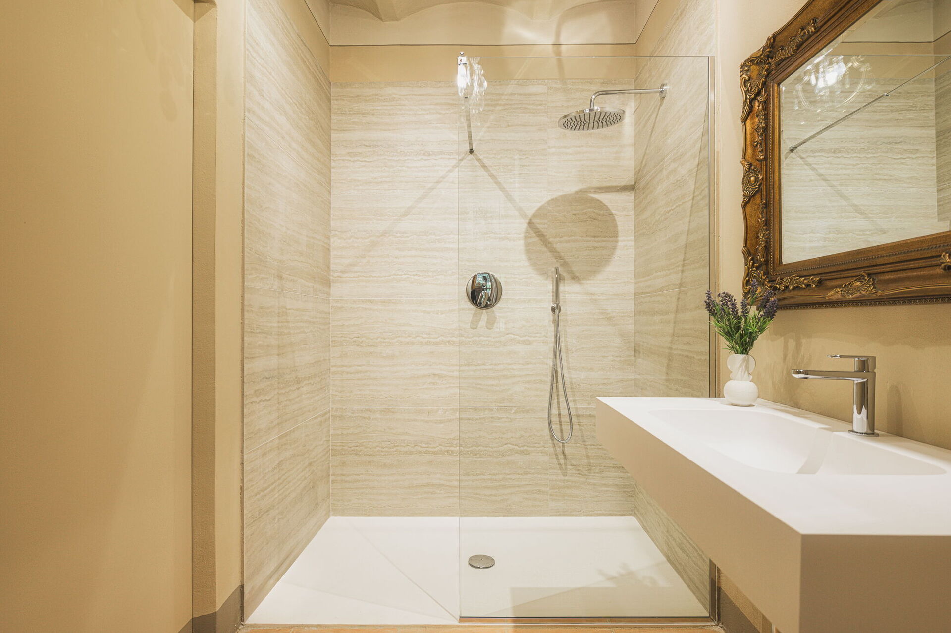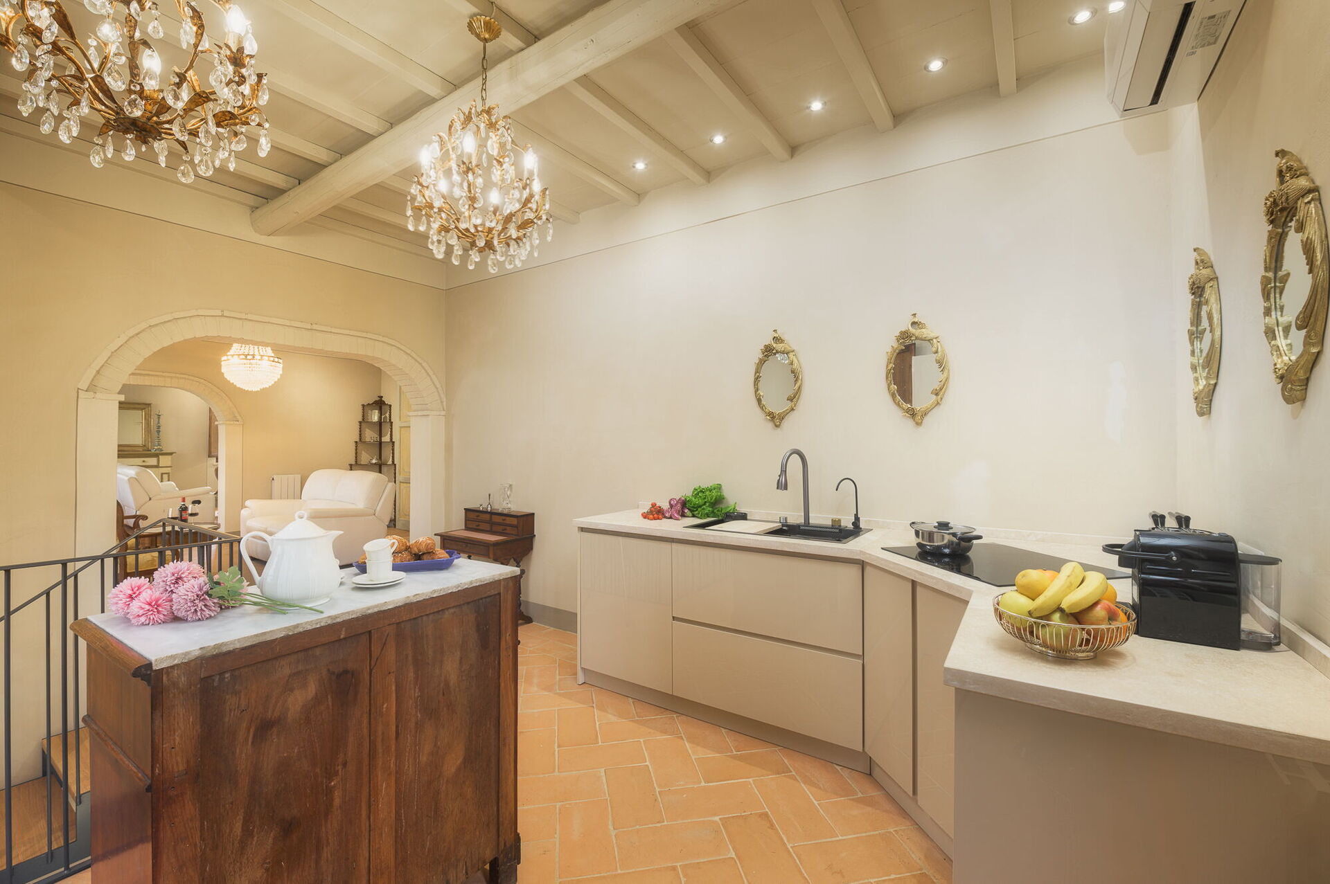First floor: (accessible from the inside of the house, as well as via an outdoor staircase outside): living room (smart tv) with fireplace and dining area, kitchen (cooktop, oven, refrigerator, freezer, dishwasher, microwave, toaster, American coffee maker, espresso coffee maker), bathroom with shower, 2 double bedrooms (bed dimensions: 160 x 200 cm; air conditioning) each with a private bathroom with shower.